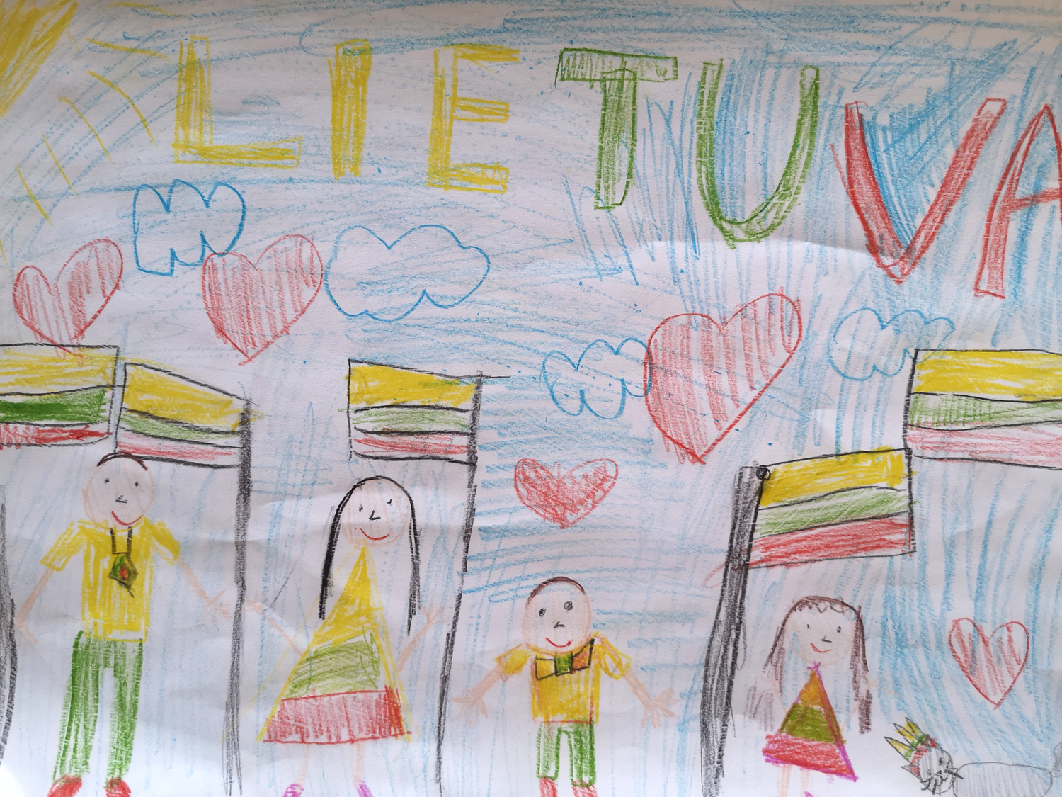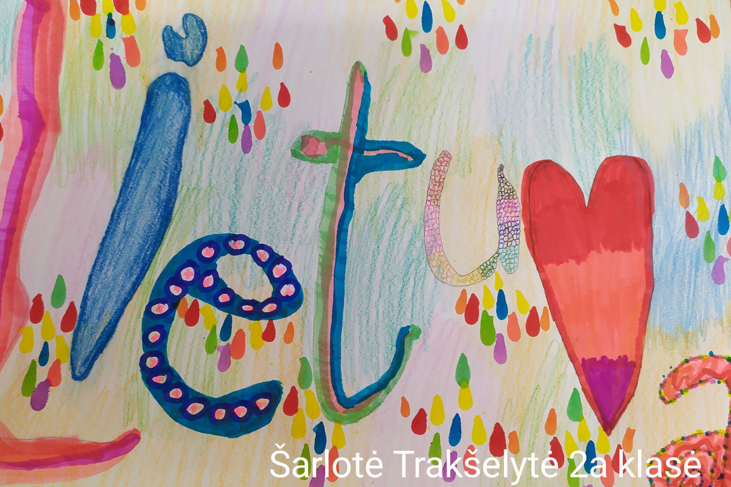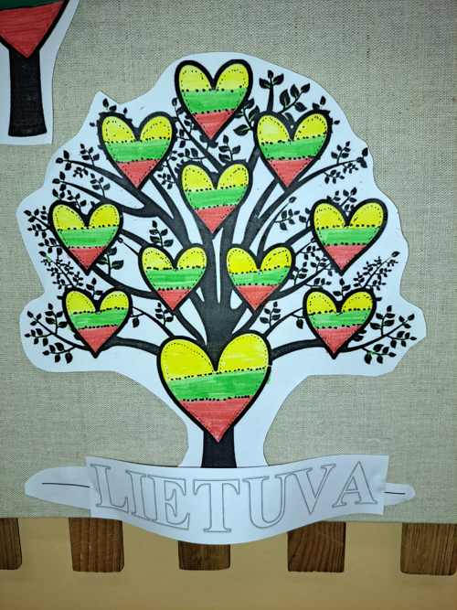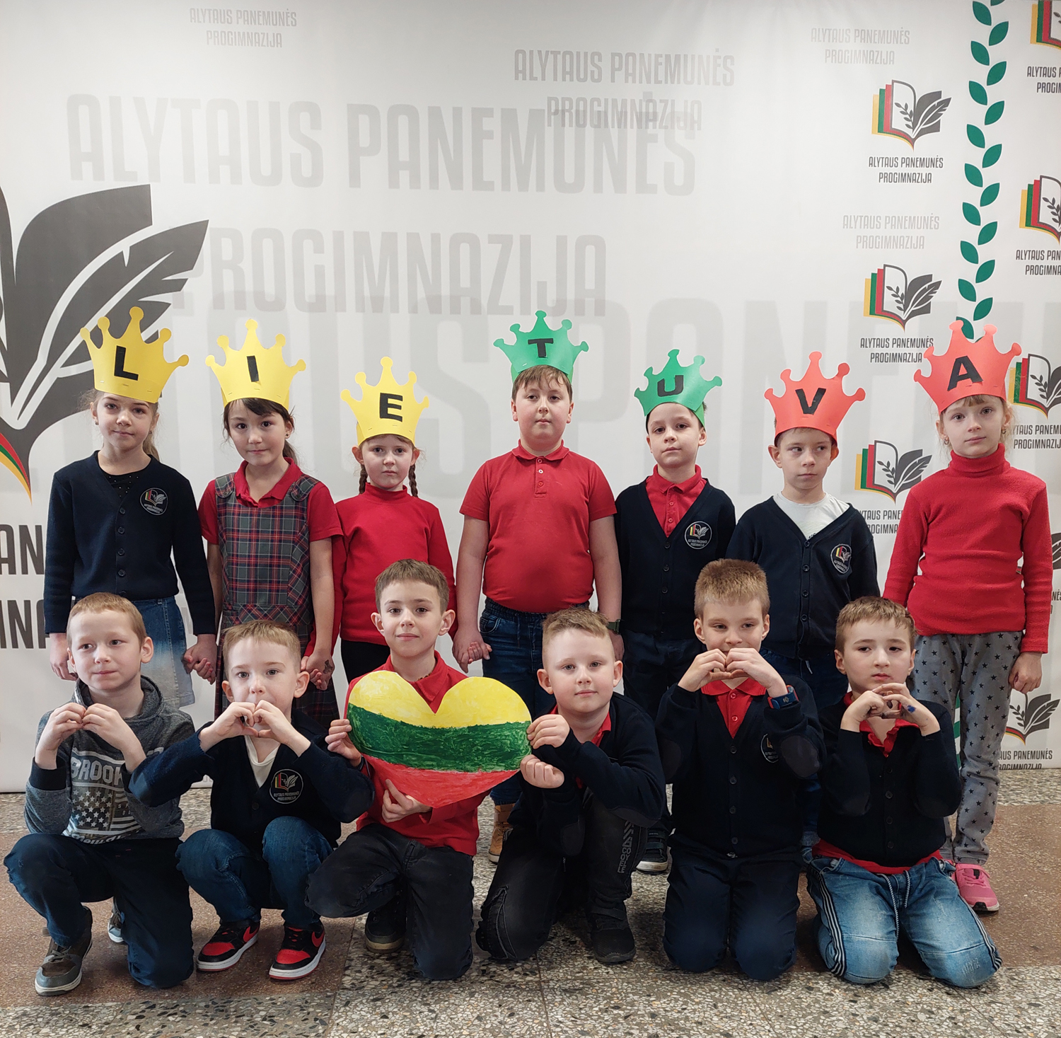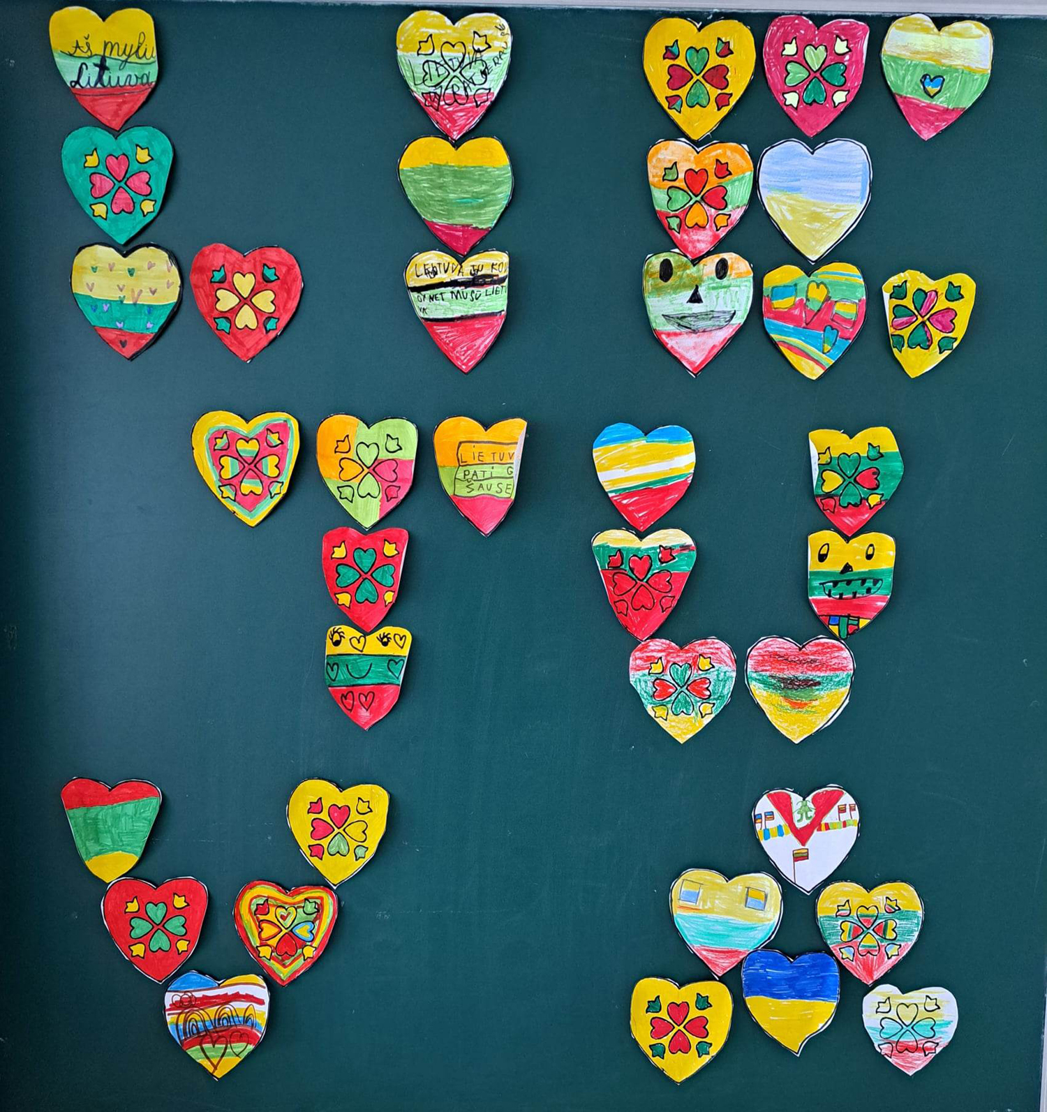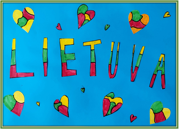 1a klasė. Mokiniai Lietuvos vardą užrašė trispalvėmis širdimis. Dar viena mintis - „Karūnuota Lietuva".