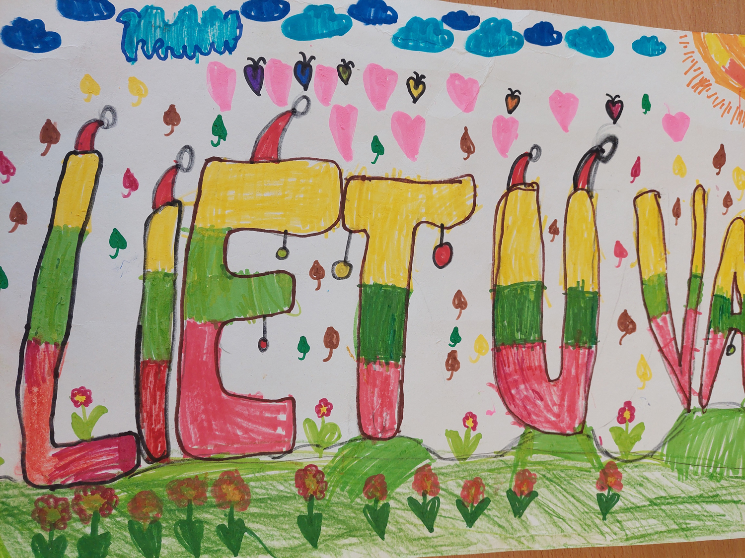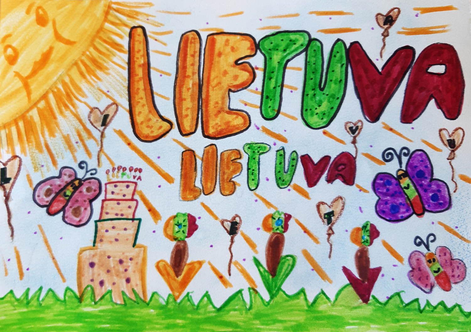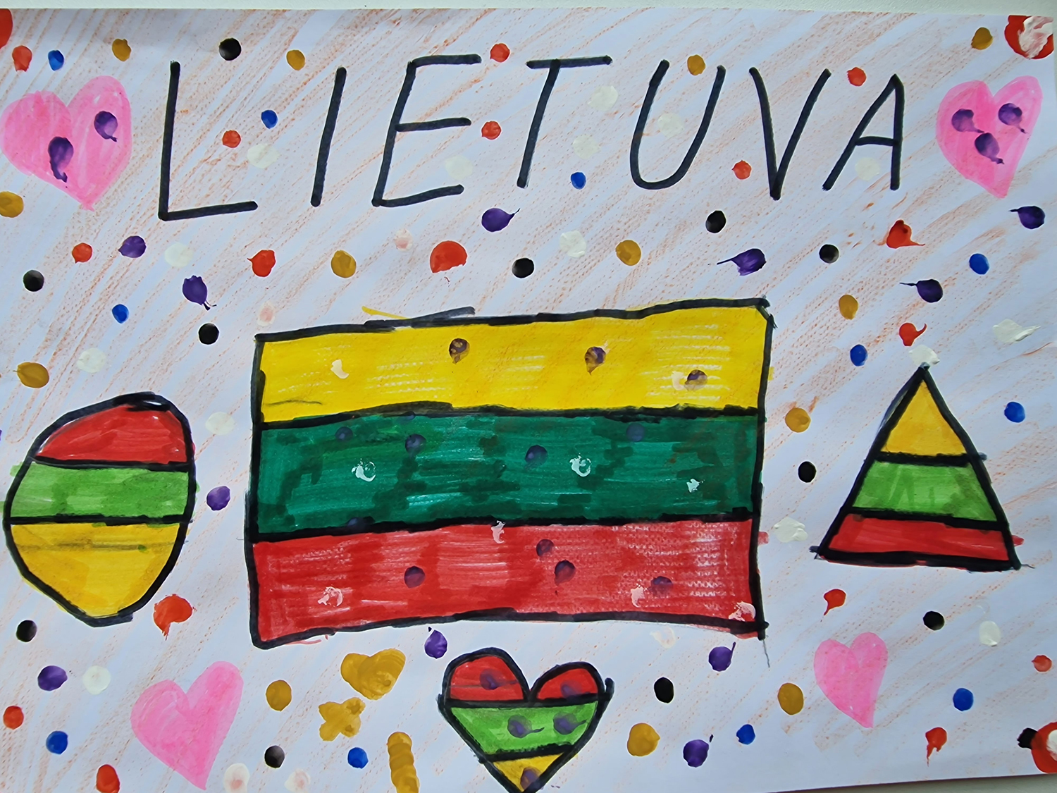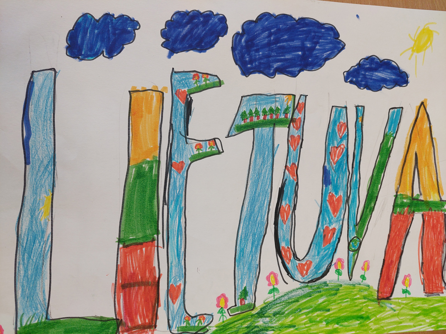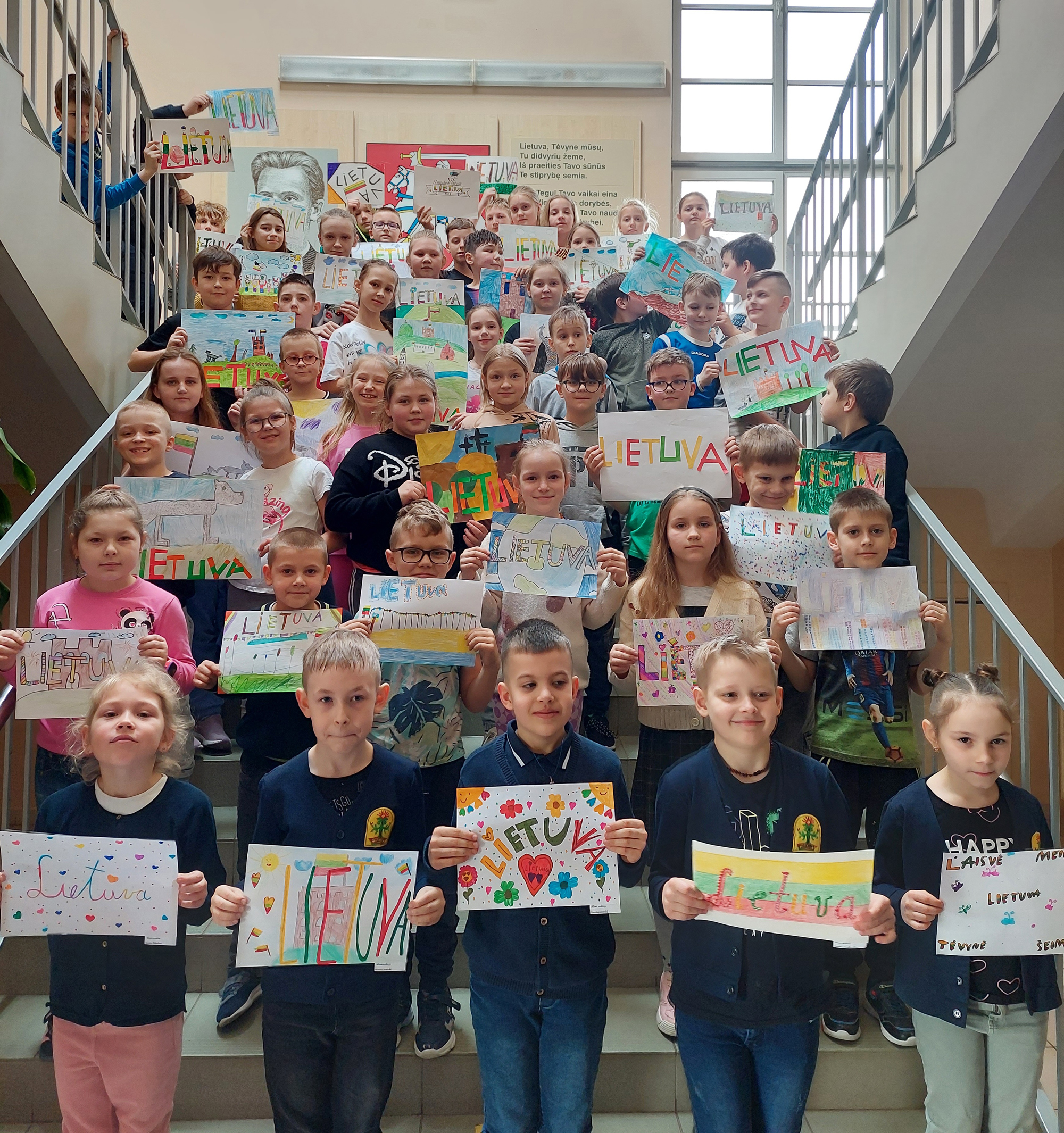 1a klasė. Mokiniai Lietuvos vardą užrašė trispalvėmis širdimis. Dar viena mintis - „Karūnuota Lietuva".
