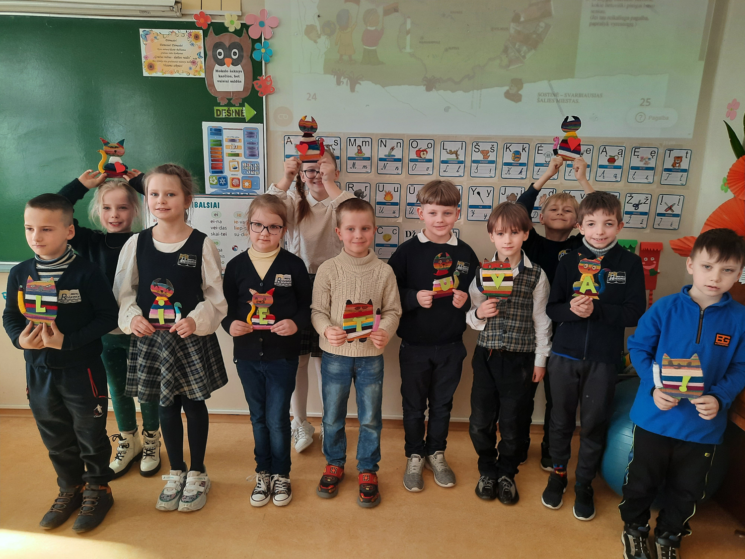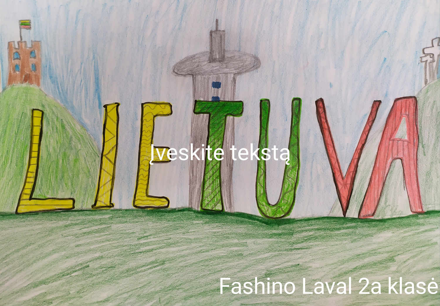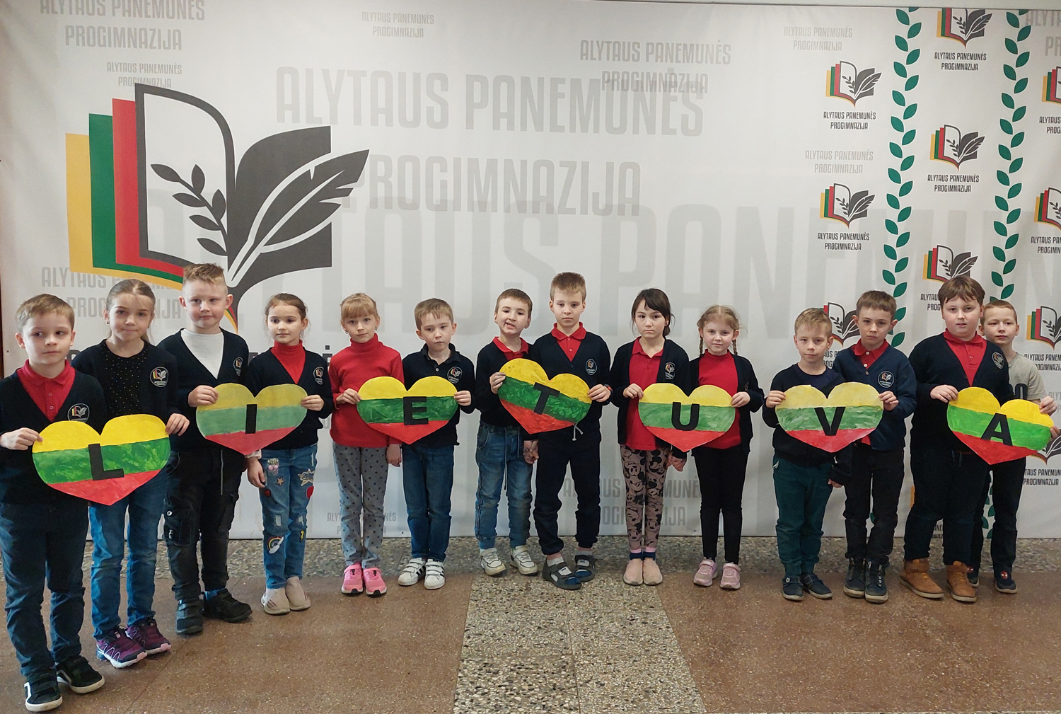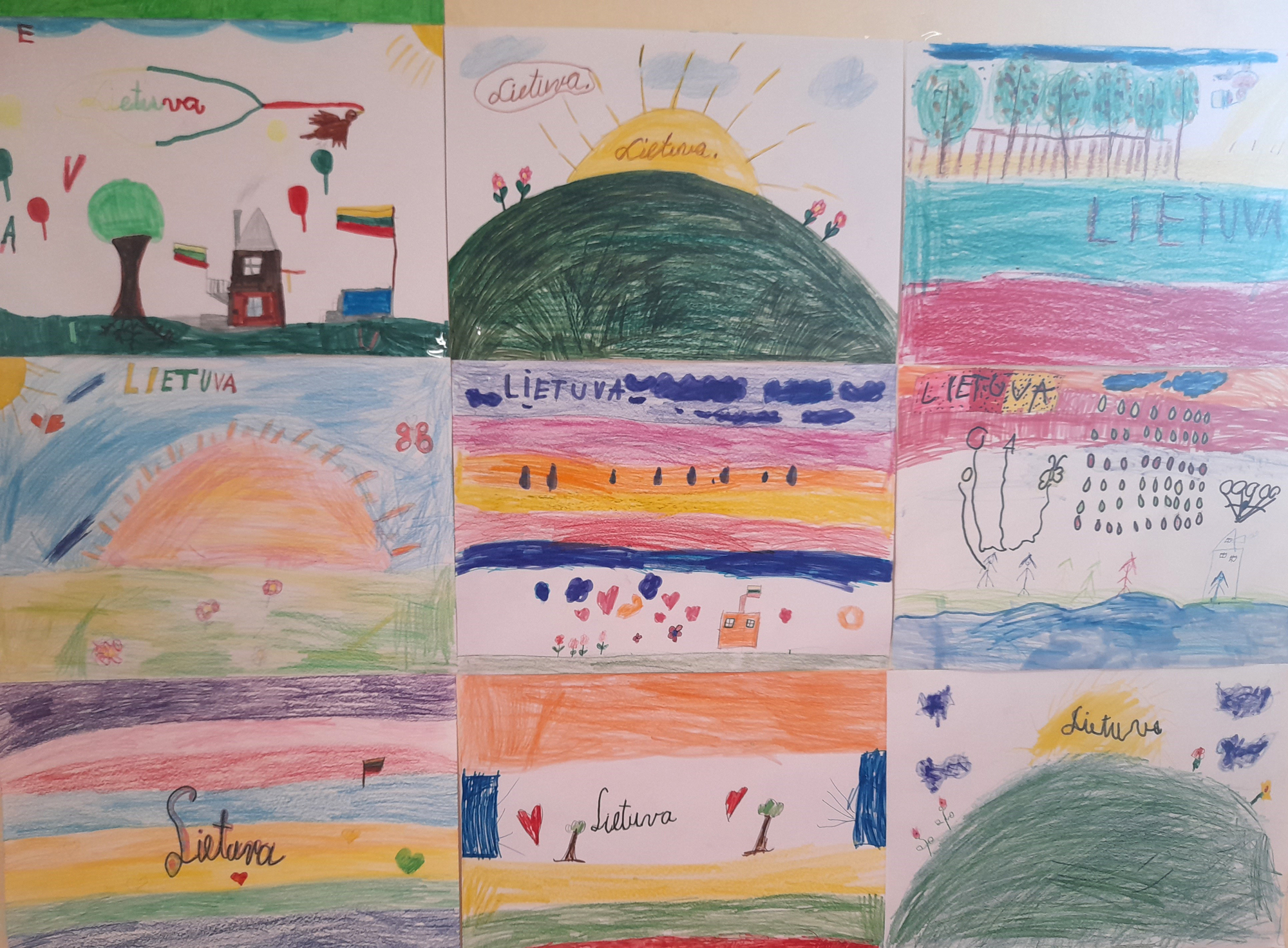 1a klasė. Mokiniai Lietuvos vardą užrašė trispalvėmis širdimis. Dar viena mintis - „Karūnuota Lietuva".