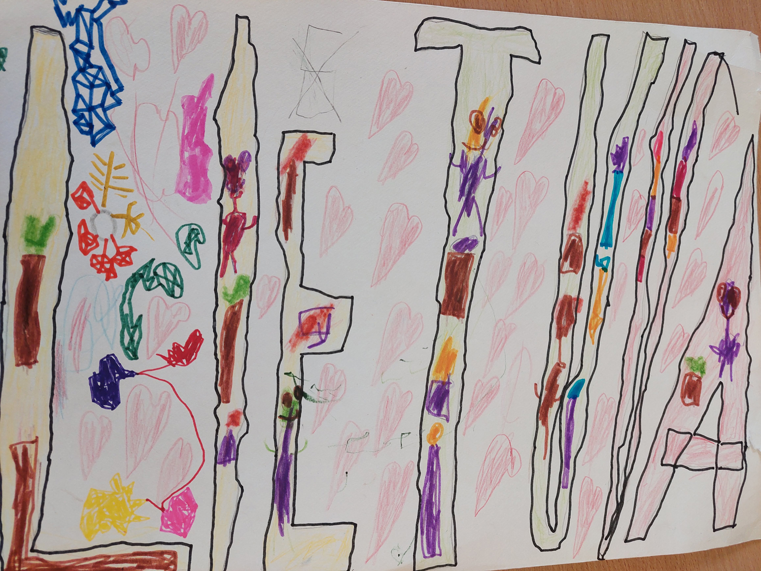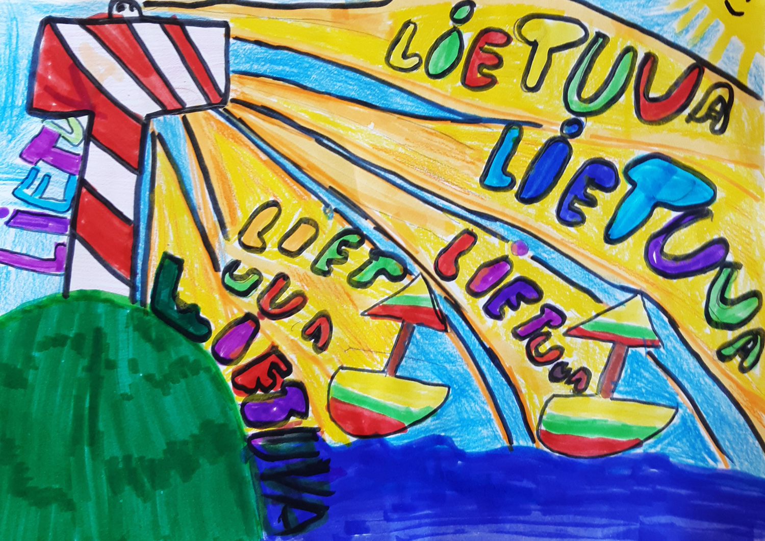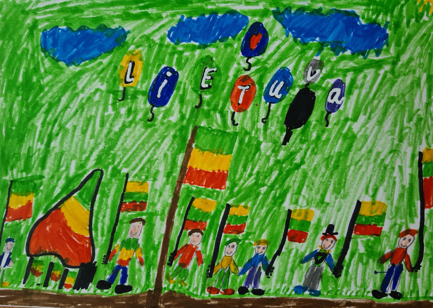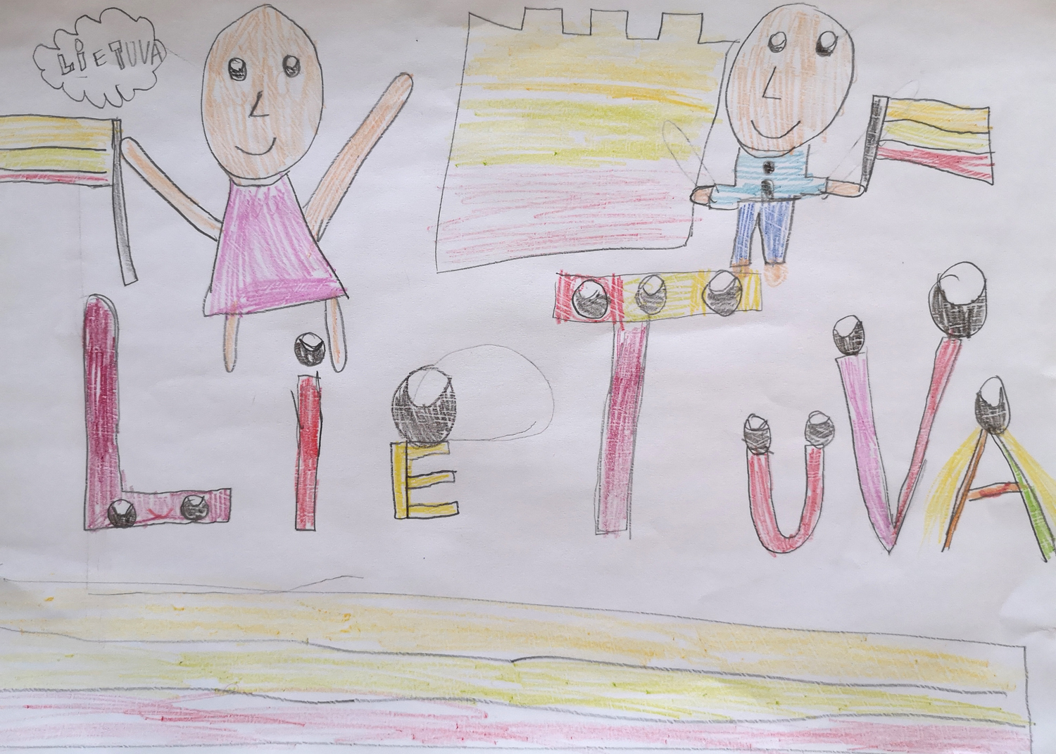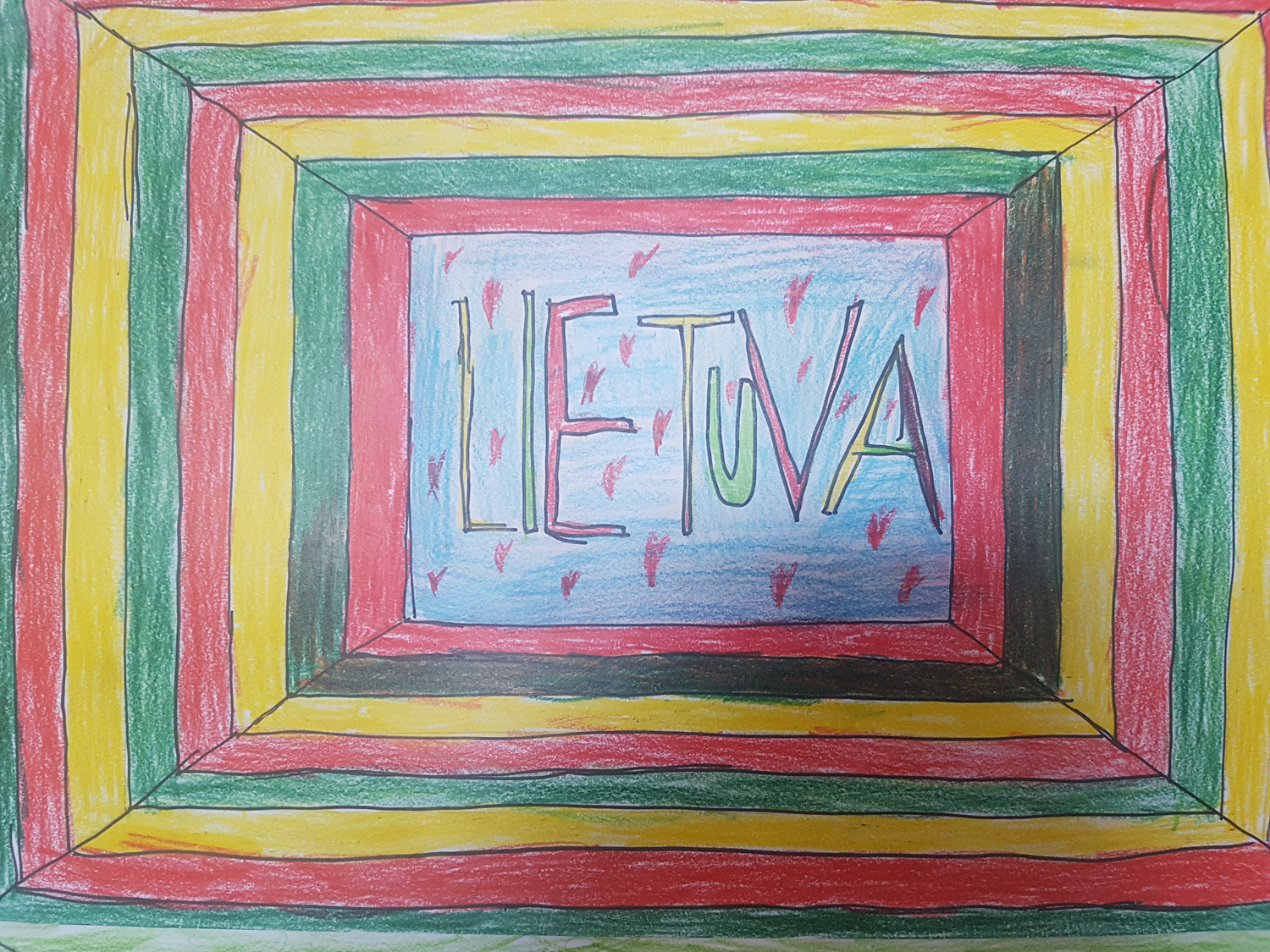 1a klasė. Mokiniai Lietuvos vardą užrašė trispalvėmis širdimis. Dar viena mintis - „Karūnuota Lietuva".