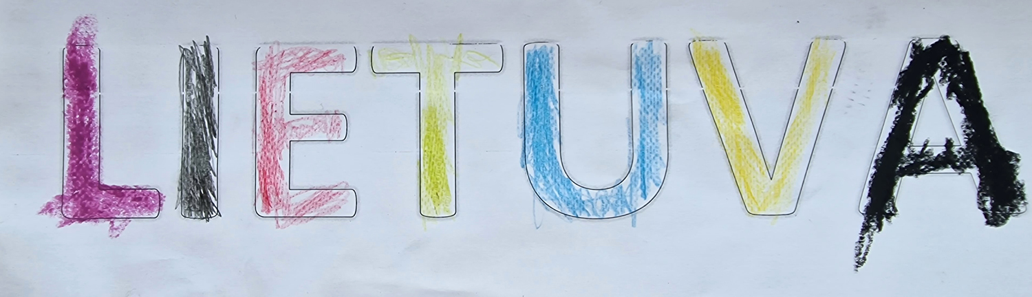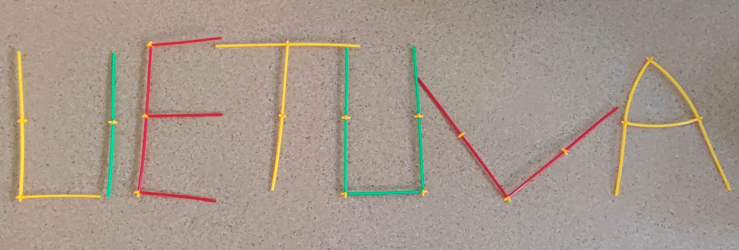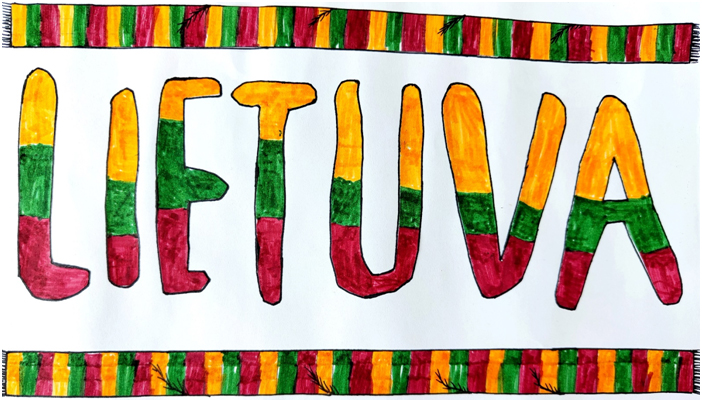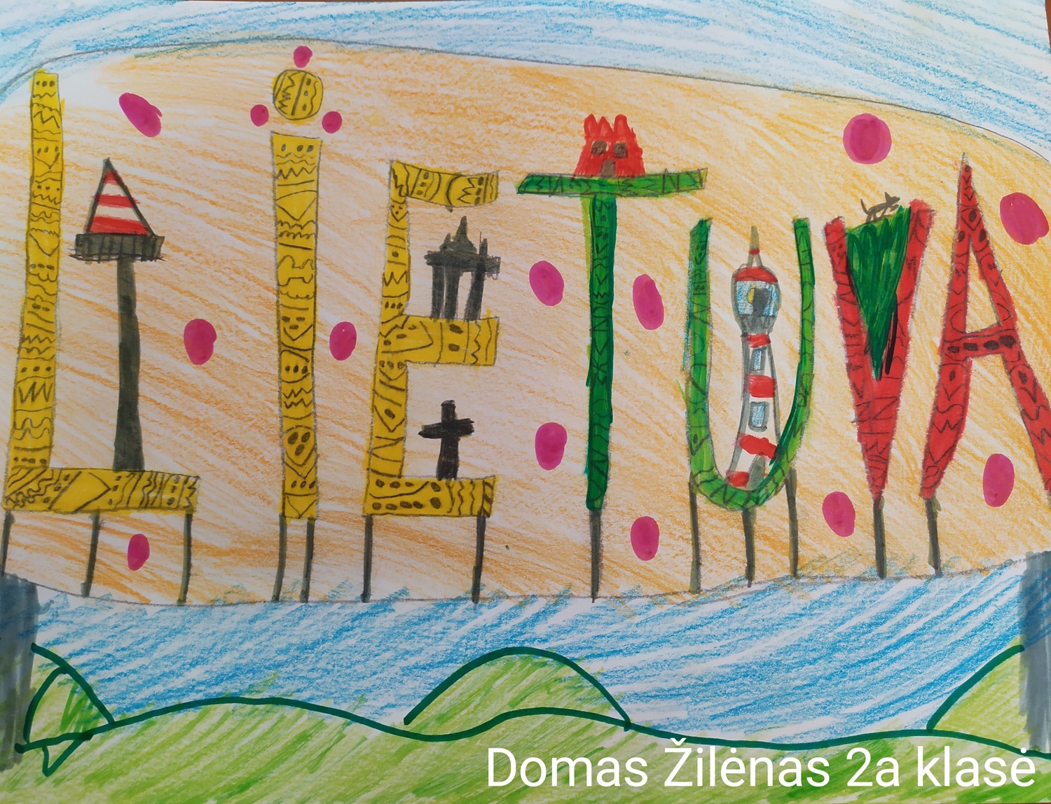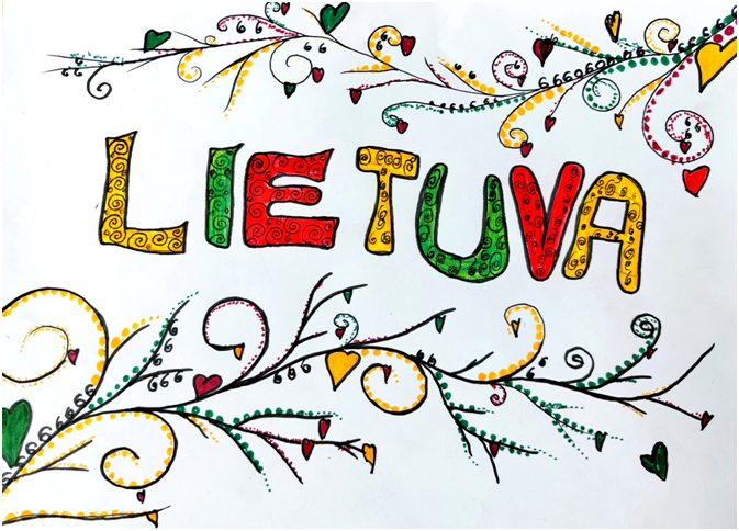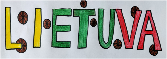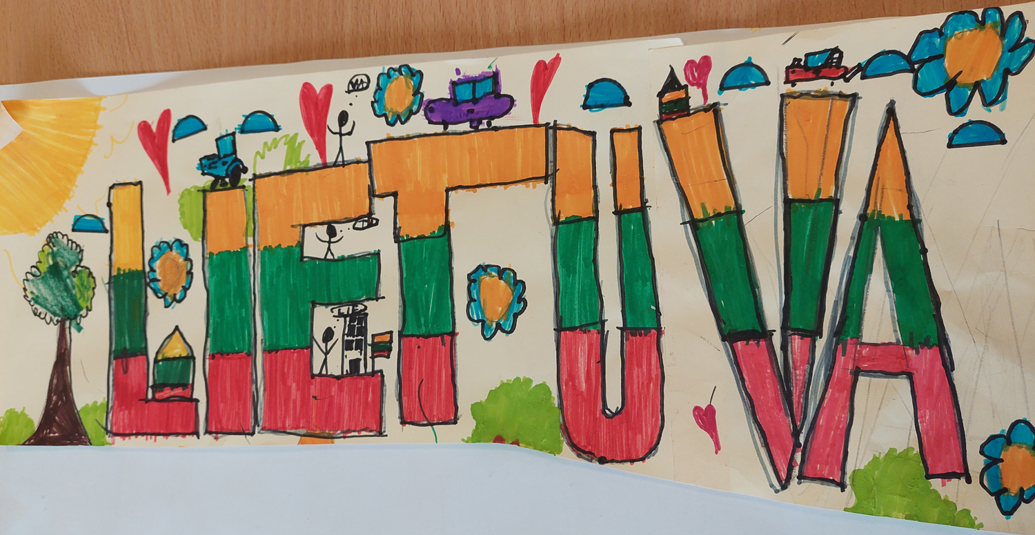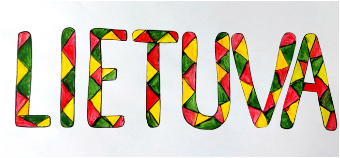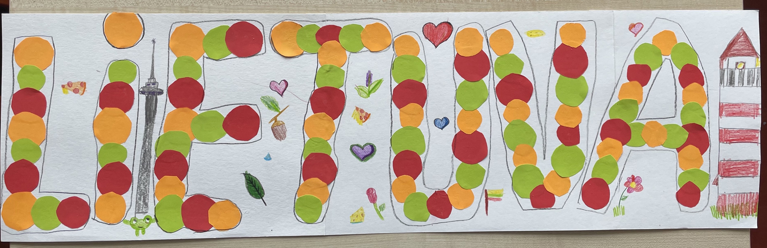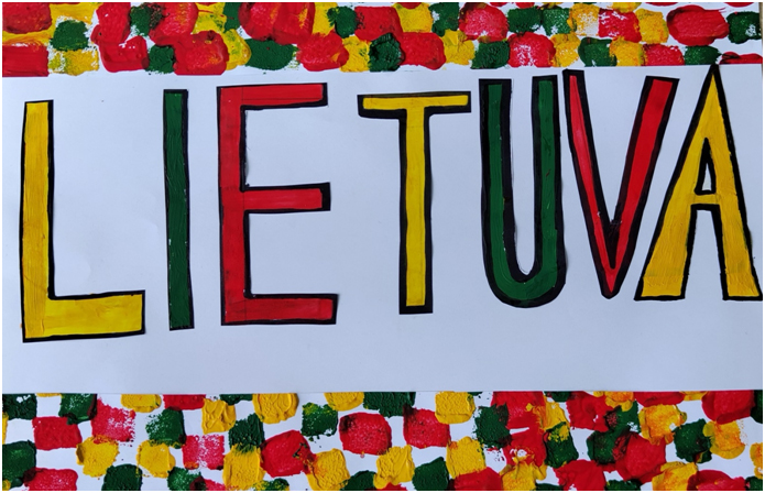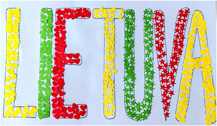 Pasirinkta technika 3a klasės vaikai piešė Lietuvos vardą. Lankstinių būrelis "Origamis" išlankstė mažas gėlytes ir sudėliojo žodį Lietuva.