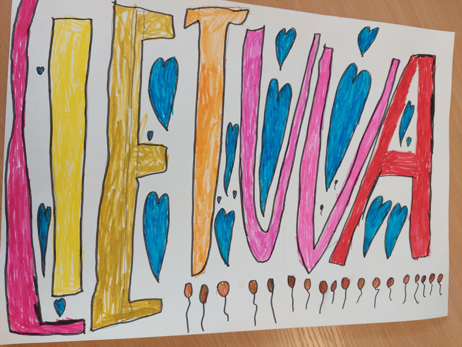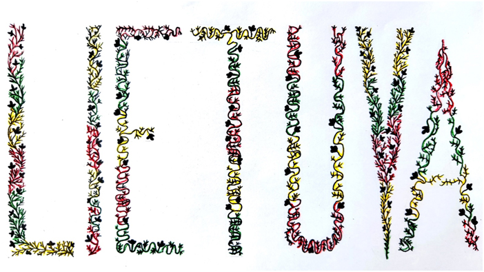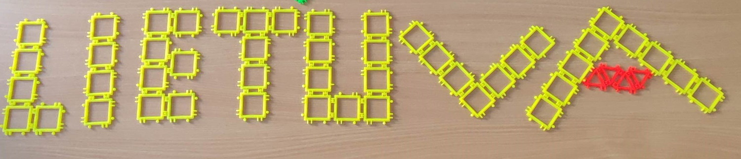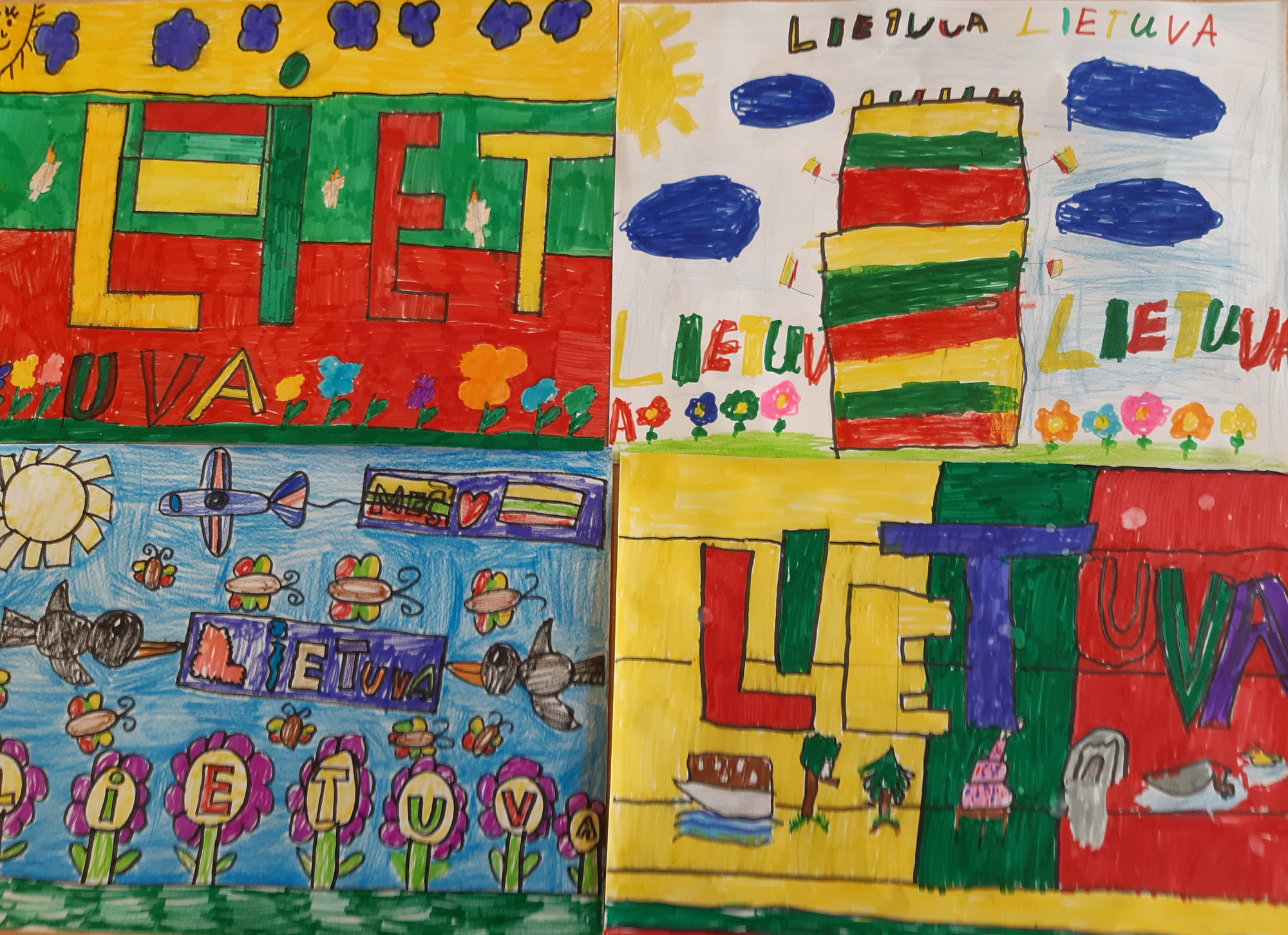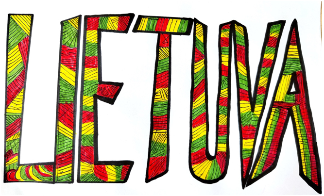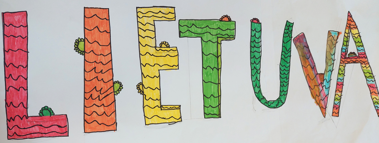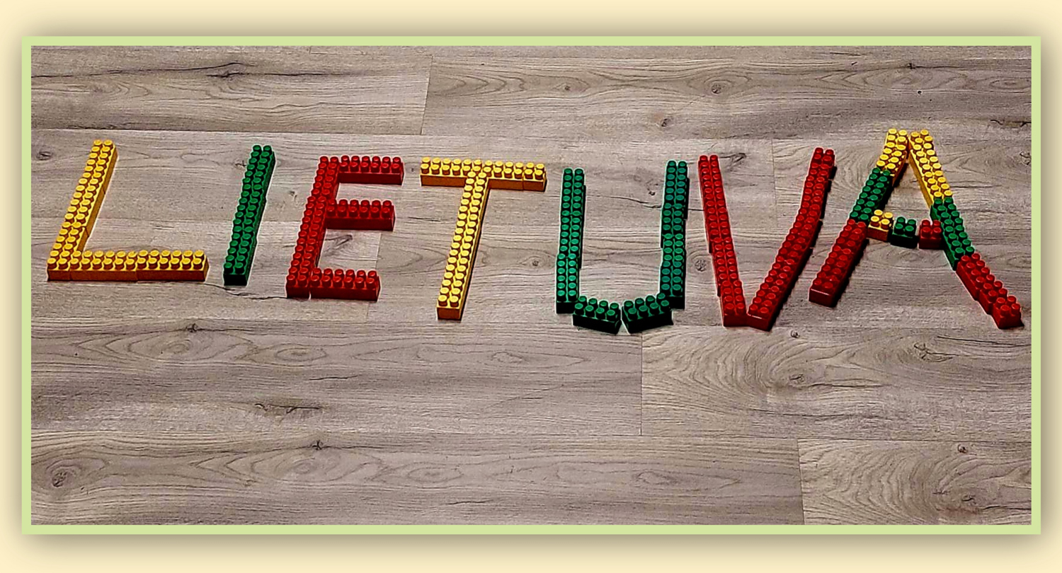 Pasirinkta technika 3a klasės vaikai piešė Lietuvos vardą. Lankstinių būrelis "Origamis" išlankstė mažas gėlytes ir sudėliojo žodį Lietuva.