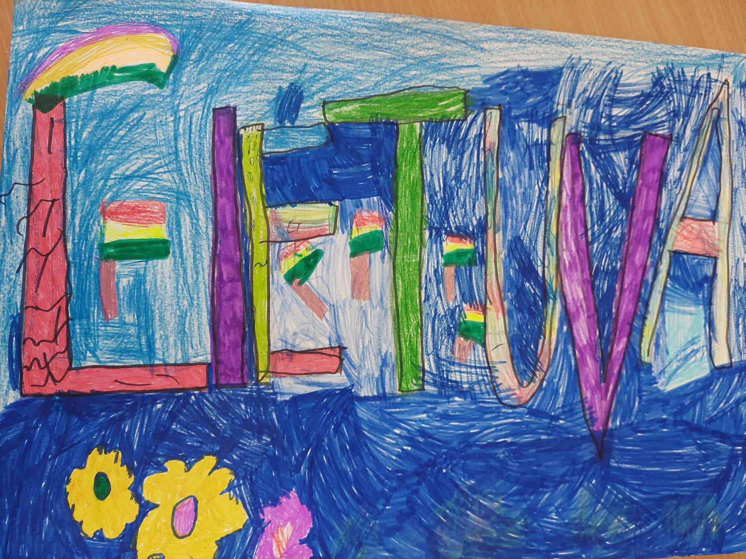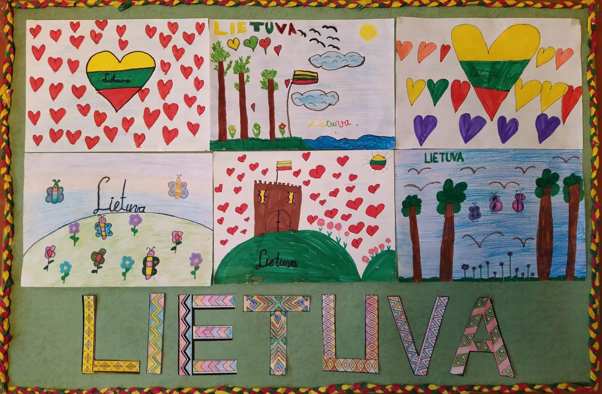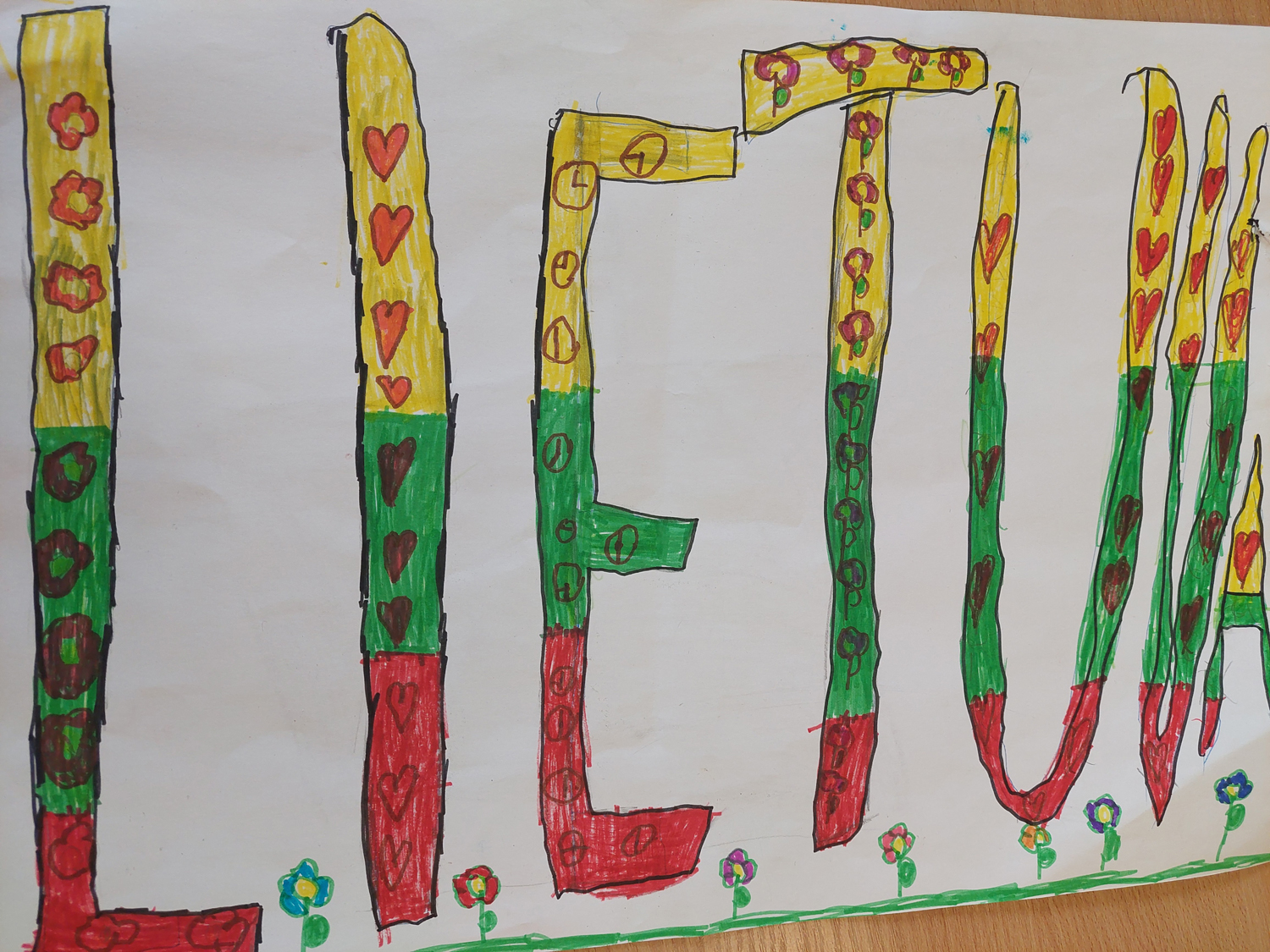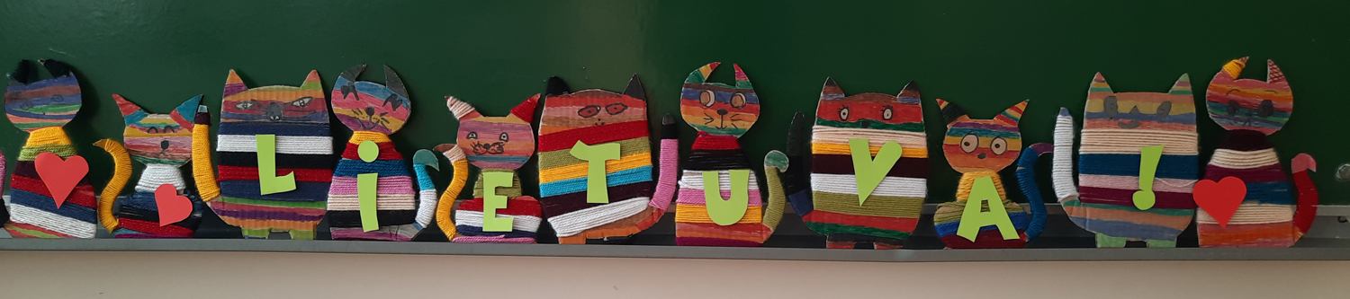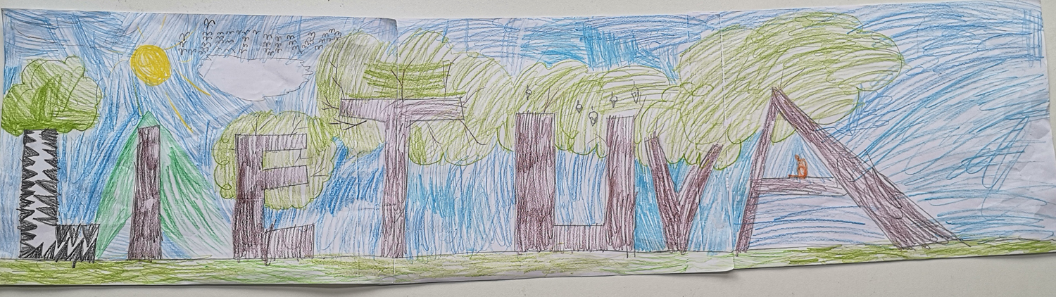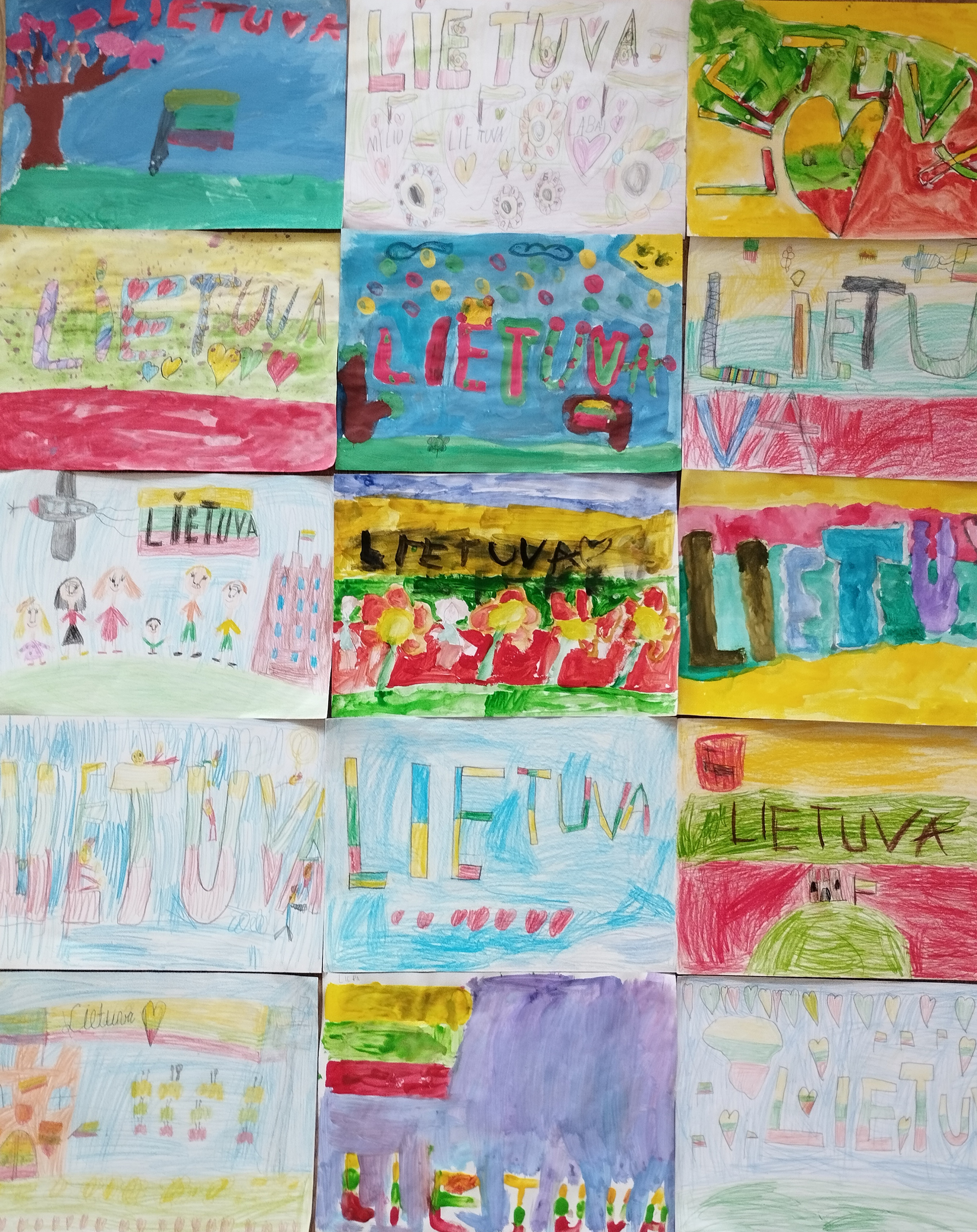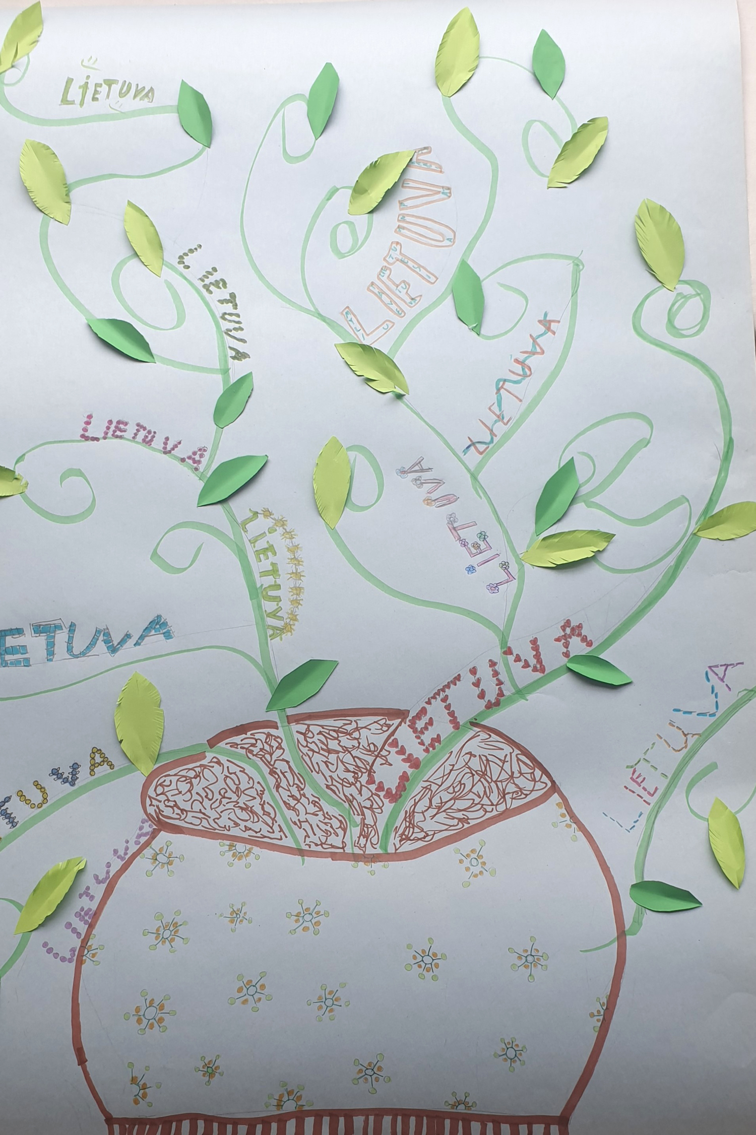 Pasirinkta technika 3a klasės vaikai piešė Lietuvos vardą. Lankstinių būrelis "Origamis" išlankstė mažas gėlytes ir sudėliojo žodį Lietuva.