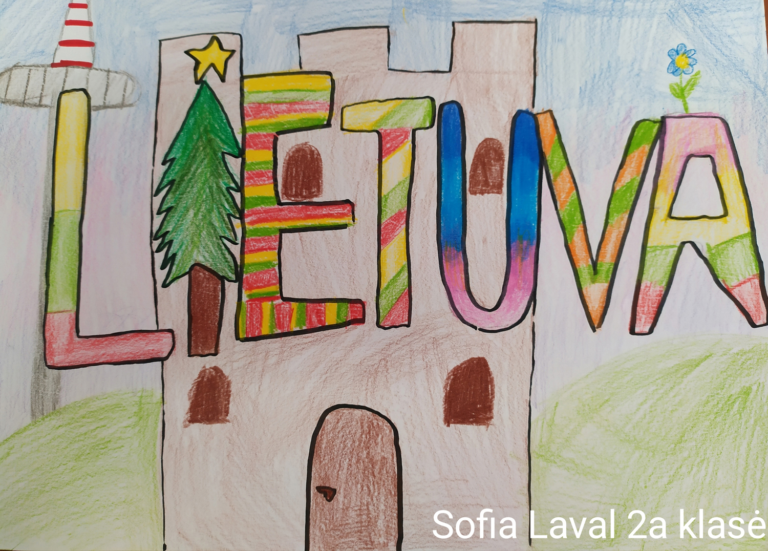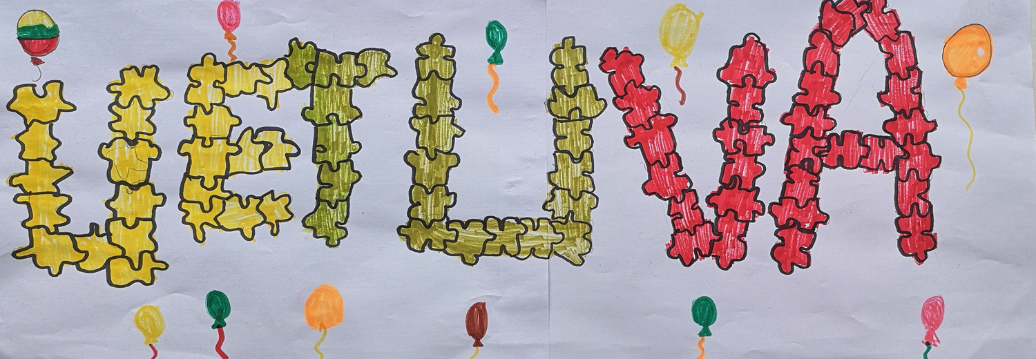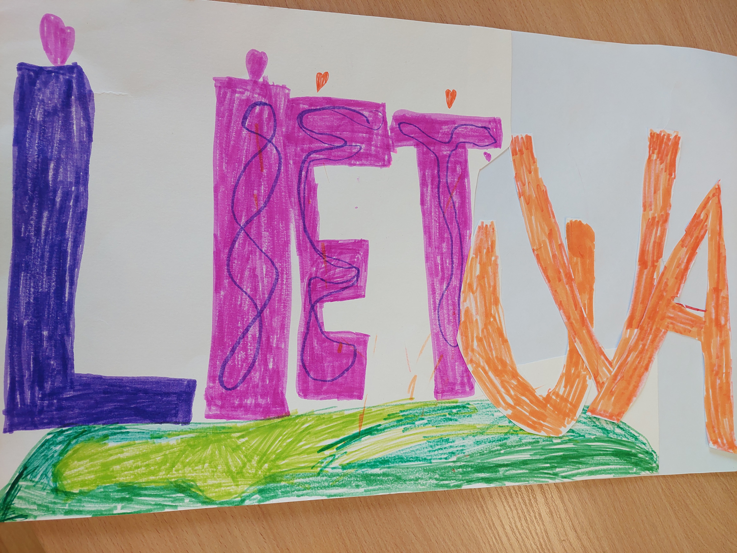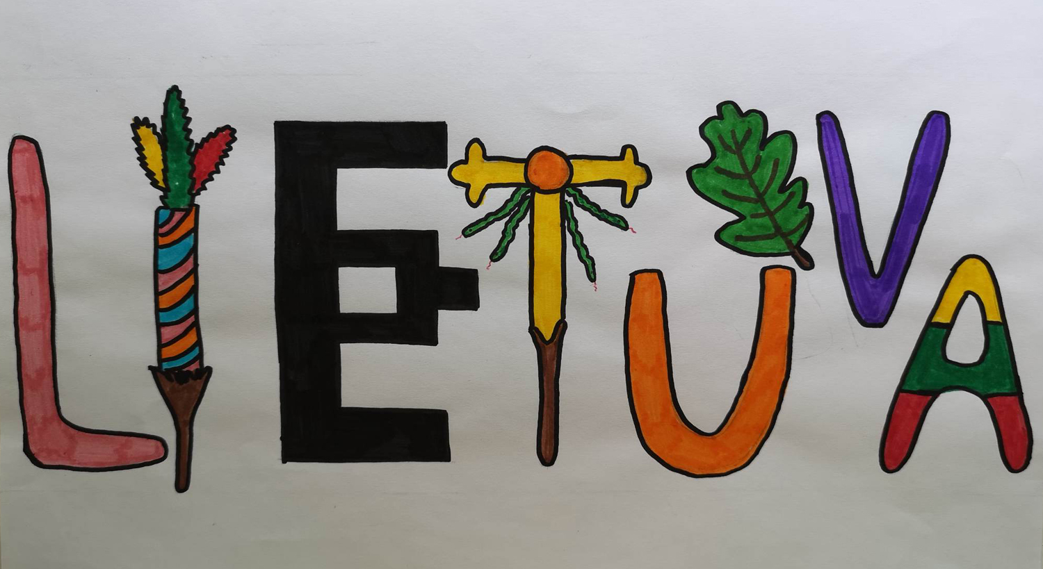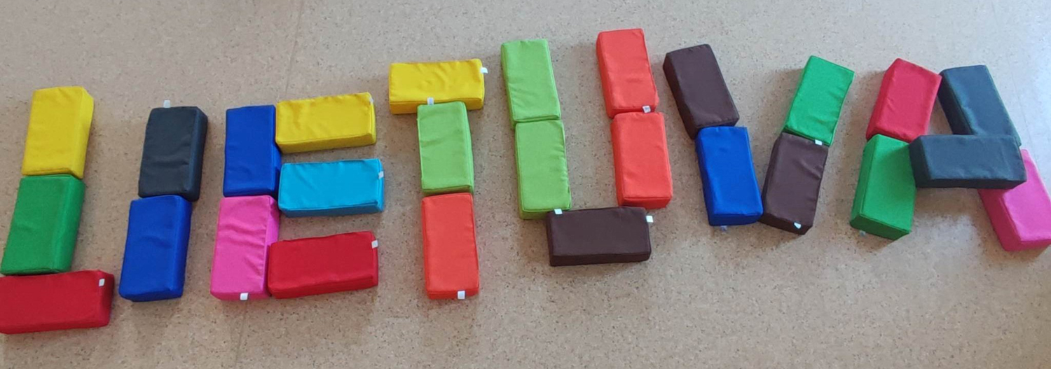 Pasirinkta technika 3a klasės vaikai piešė Lietuvos vardą. Lankstinių būrelis "Origamis" išlankstė mažas gėlytes ir sudėliojo žodį Lietuva.