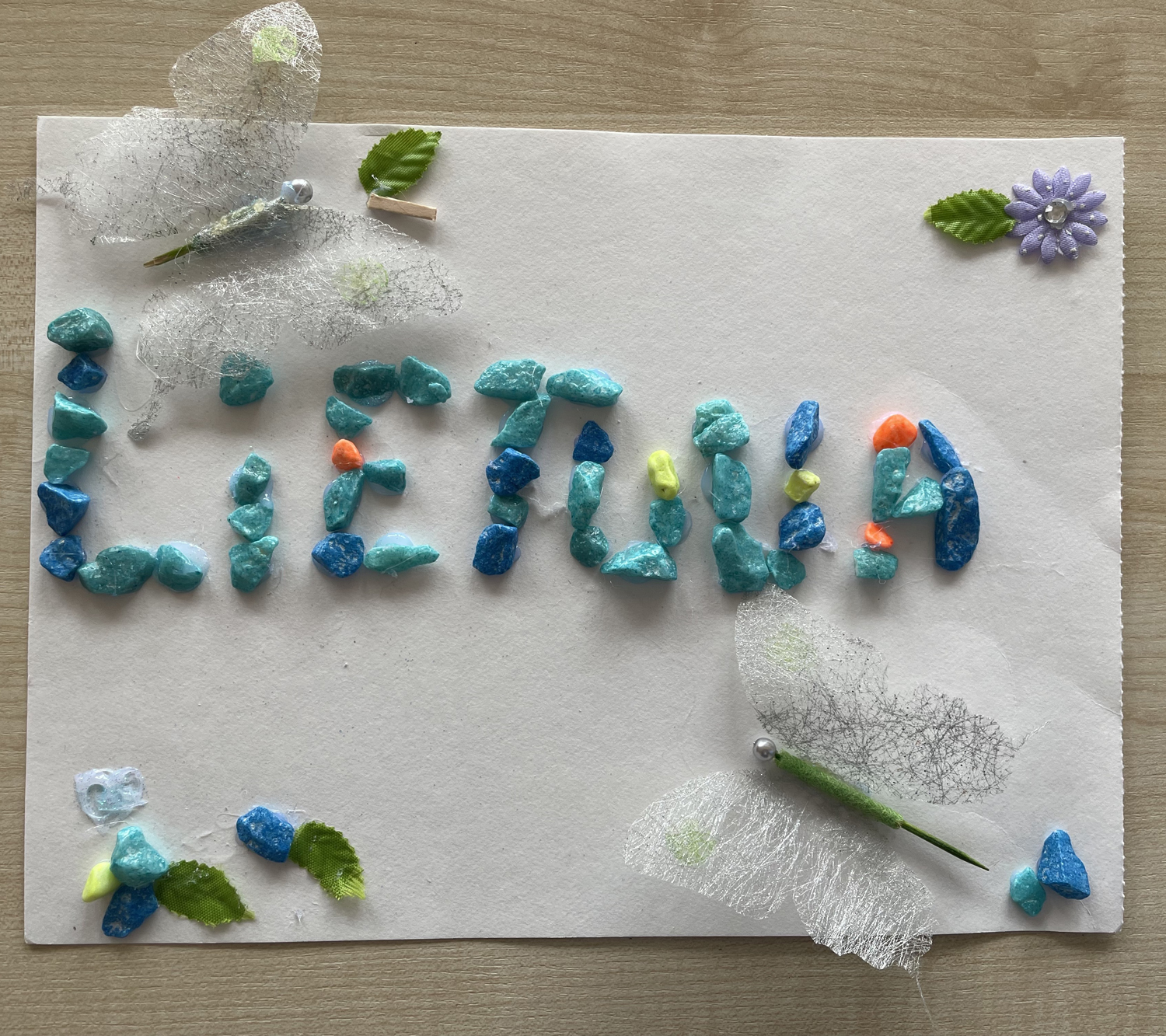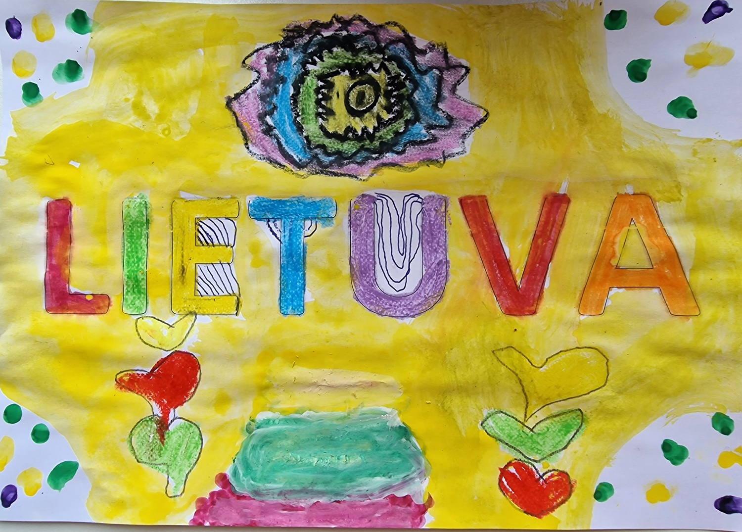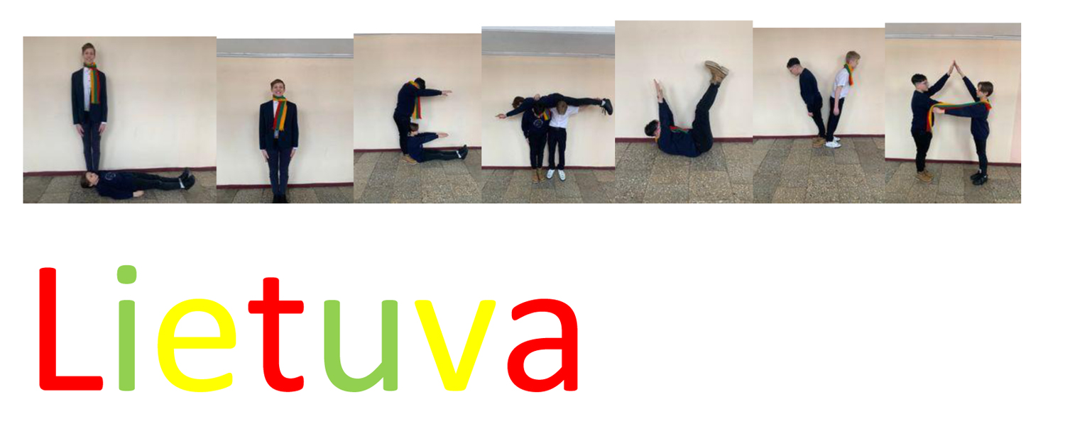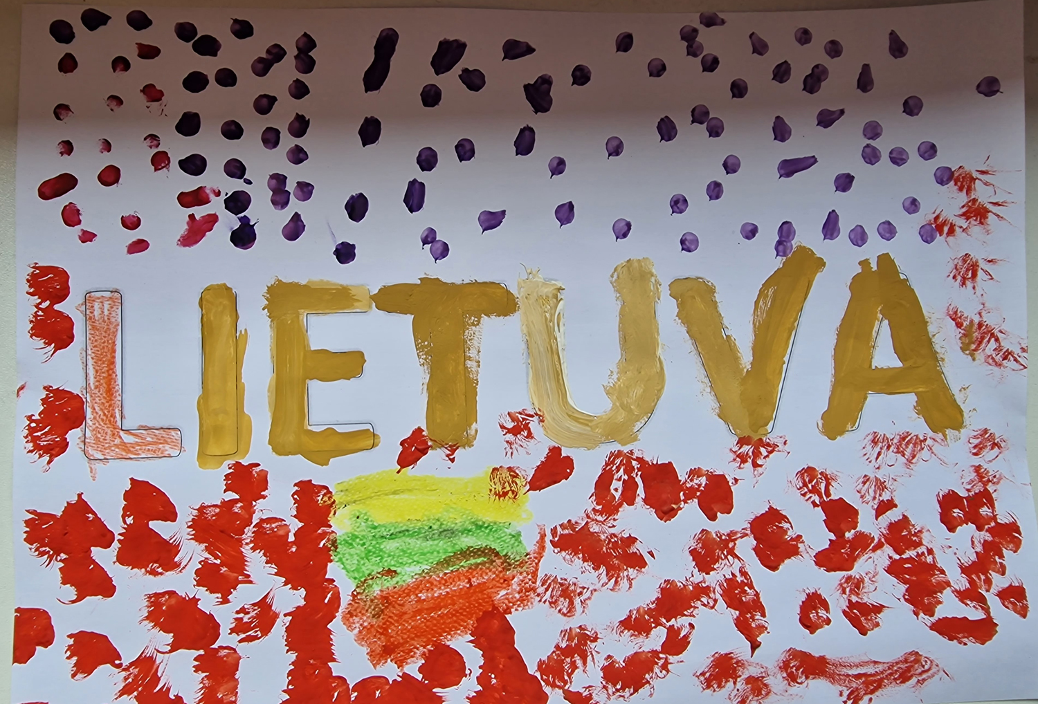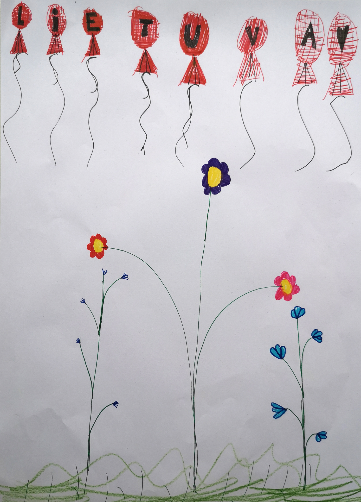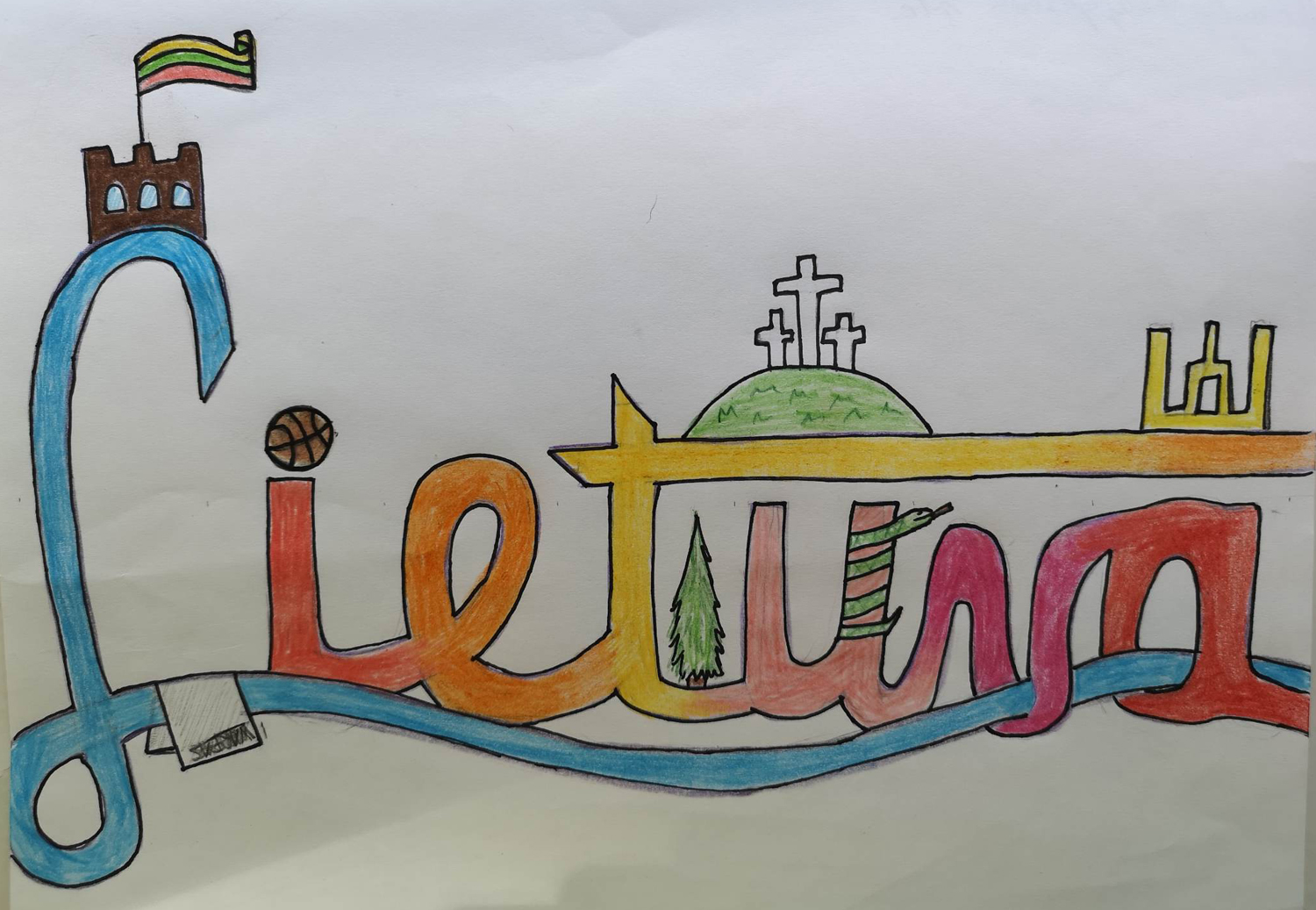 Pasirinkta technika 3a klasės vaikai piešė Lietuvos vardą. Lankstinių būrelis "Origamis" išlankstė mažas gėlytes ir sudėliojo žodį Lietuva.