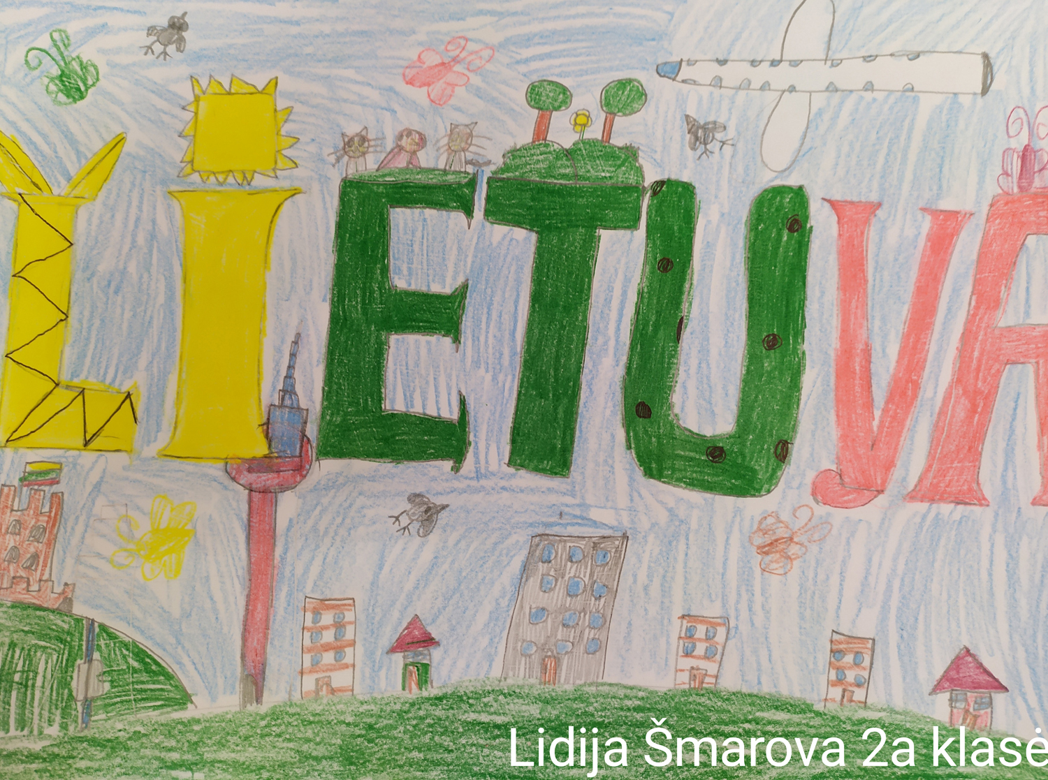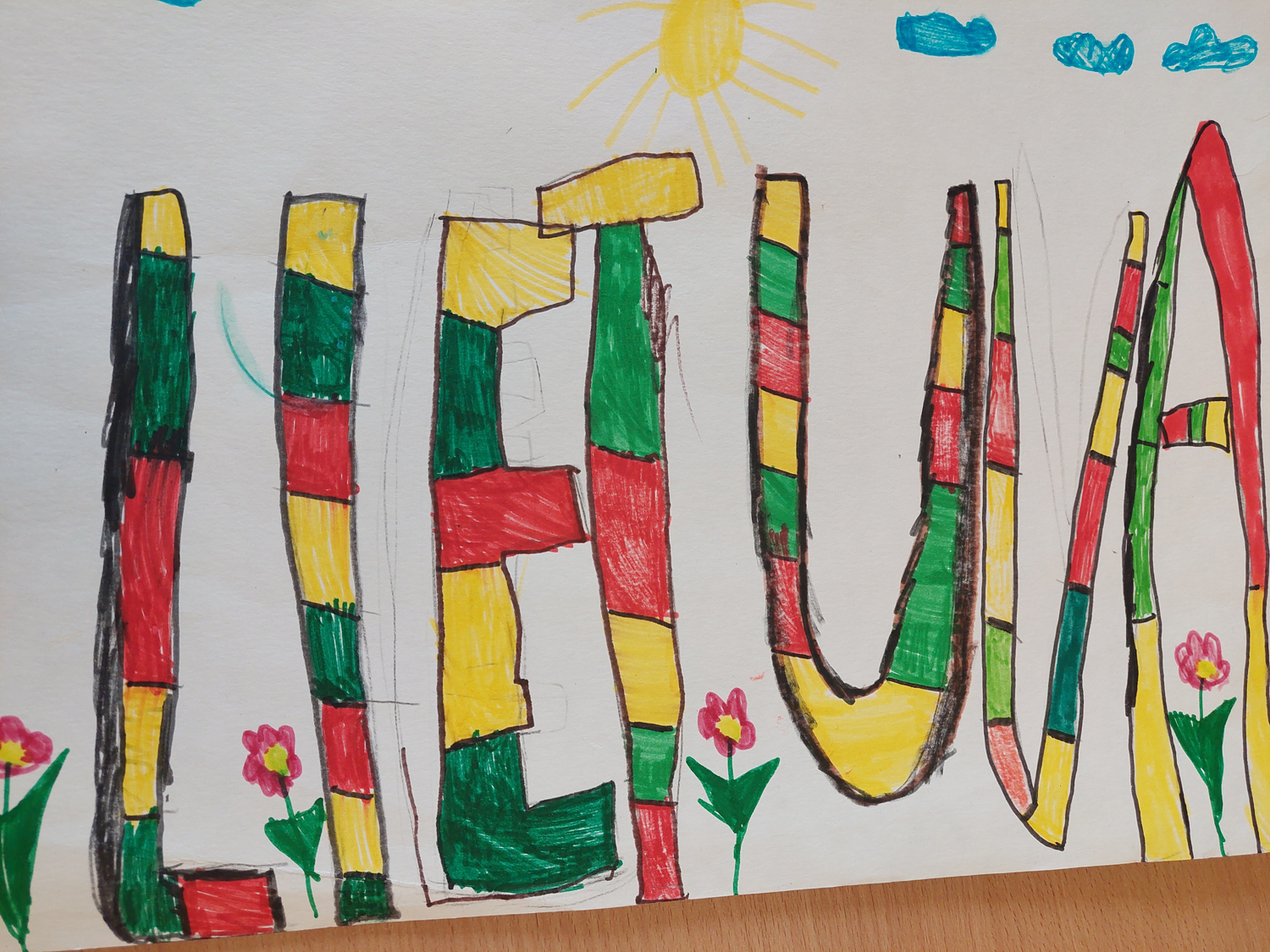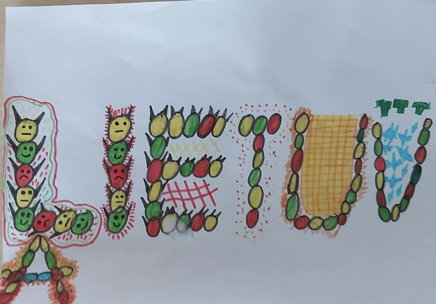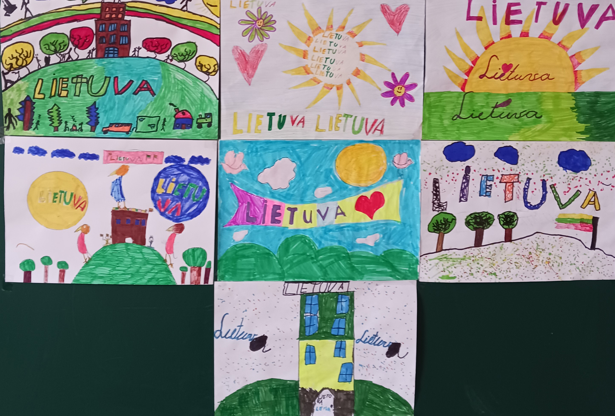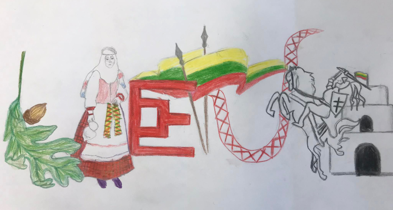 Pasirinkta technika 3a klasės vaikai piešė Lietuvos vardą. Lankstinių būrelis "Origamis" išlankstė mažas gėlytes ir sudėliojo žodį Lietuva.