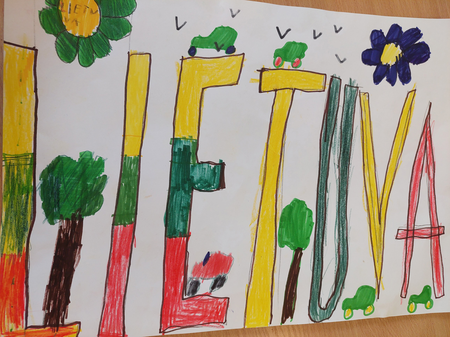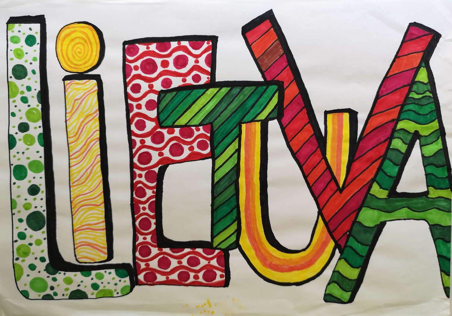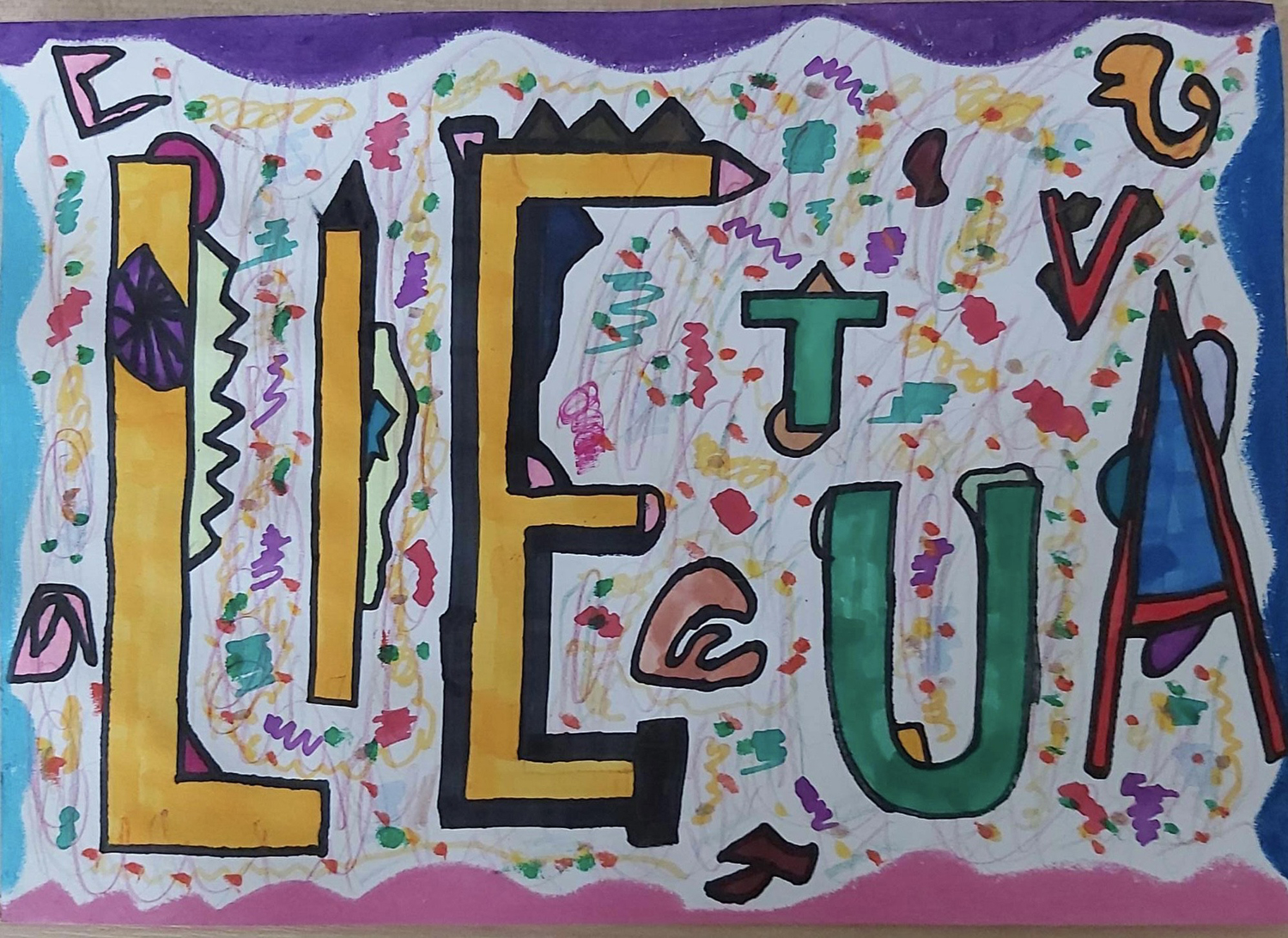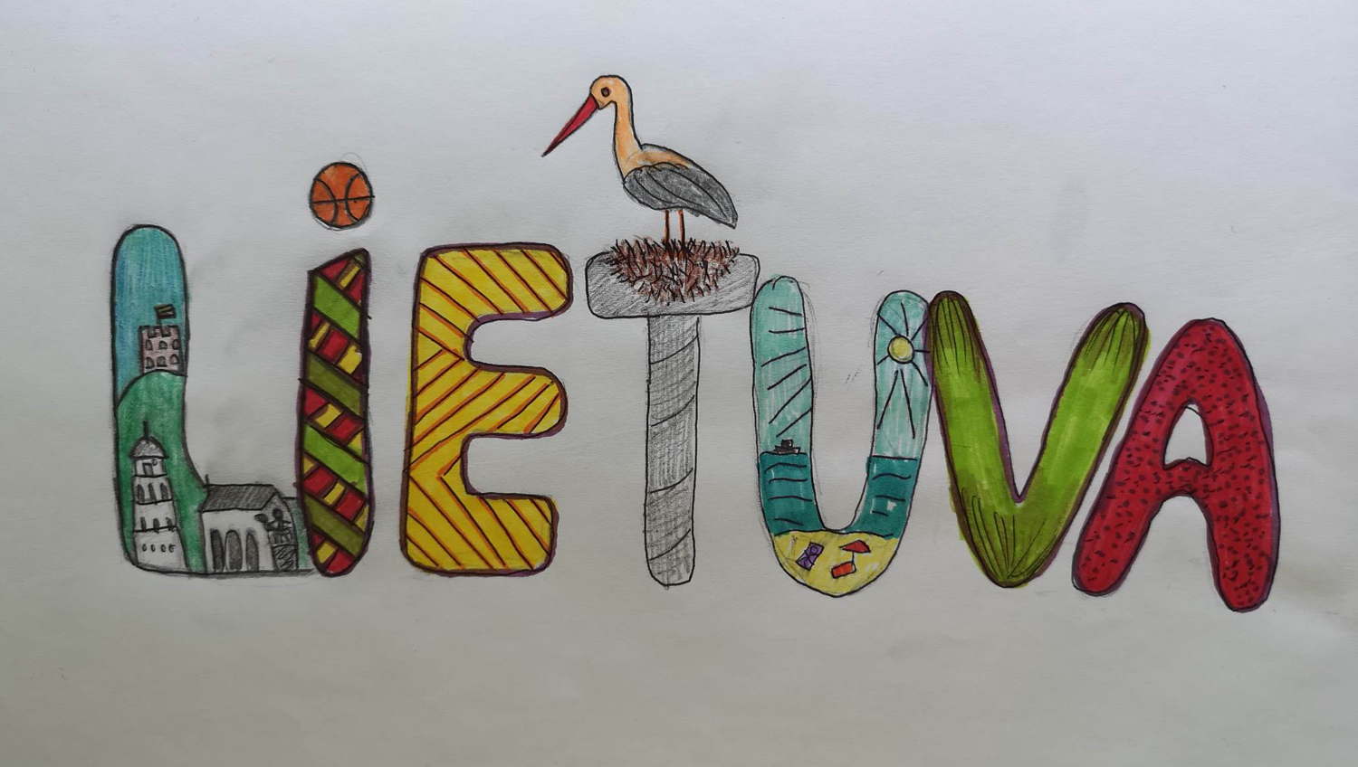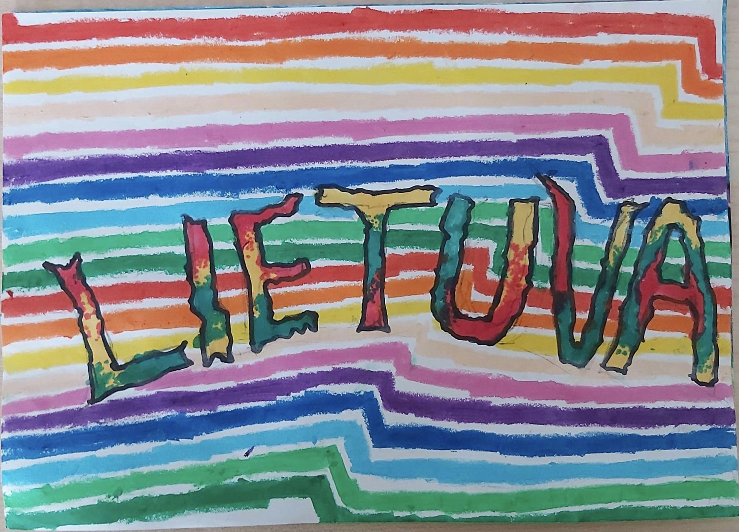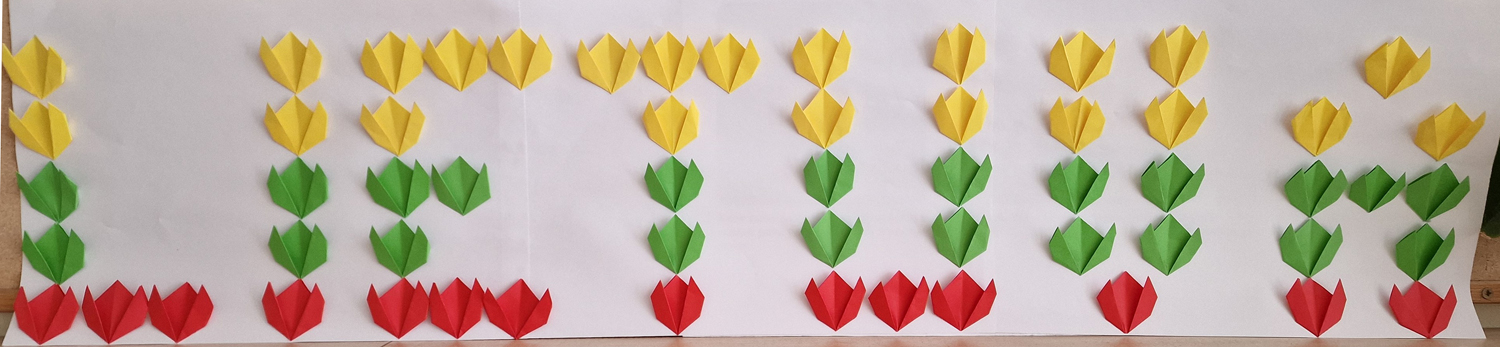 Pasirinkta technika 3a klasės vaikai piešė Lietuvos vardą. Lankstinių būrelis "Origamis" išlankstė mažas gėlytes ir sudėliojo žodį Lietuva.