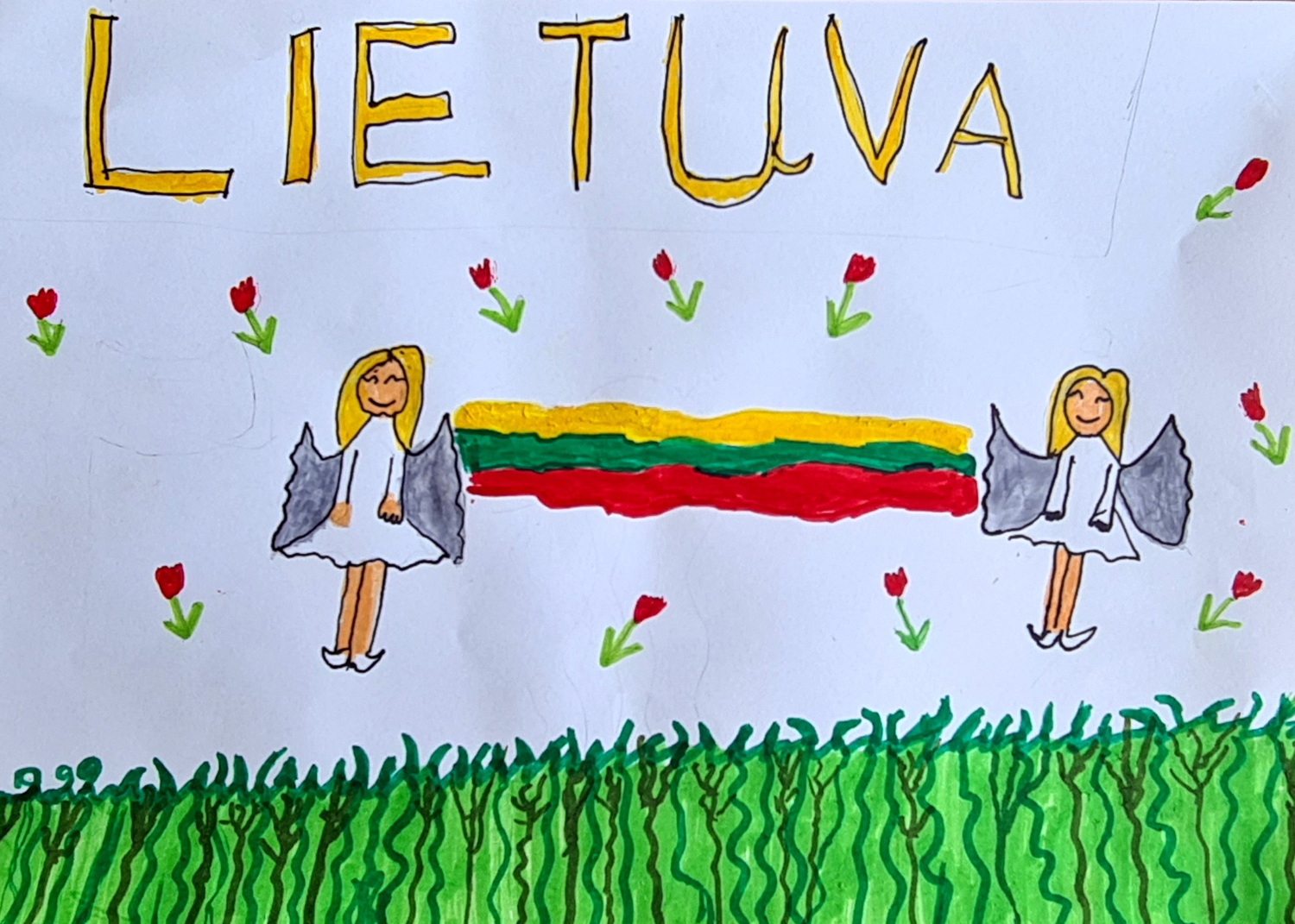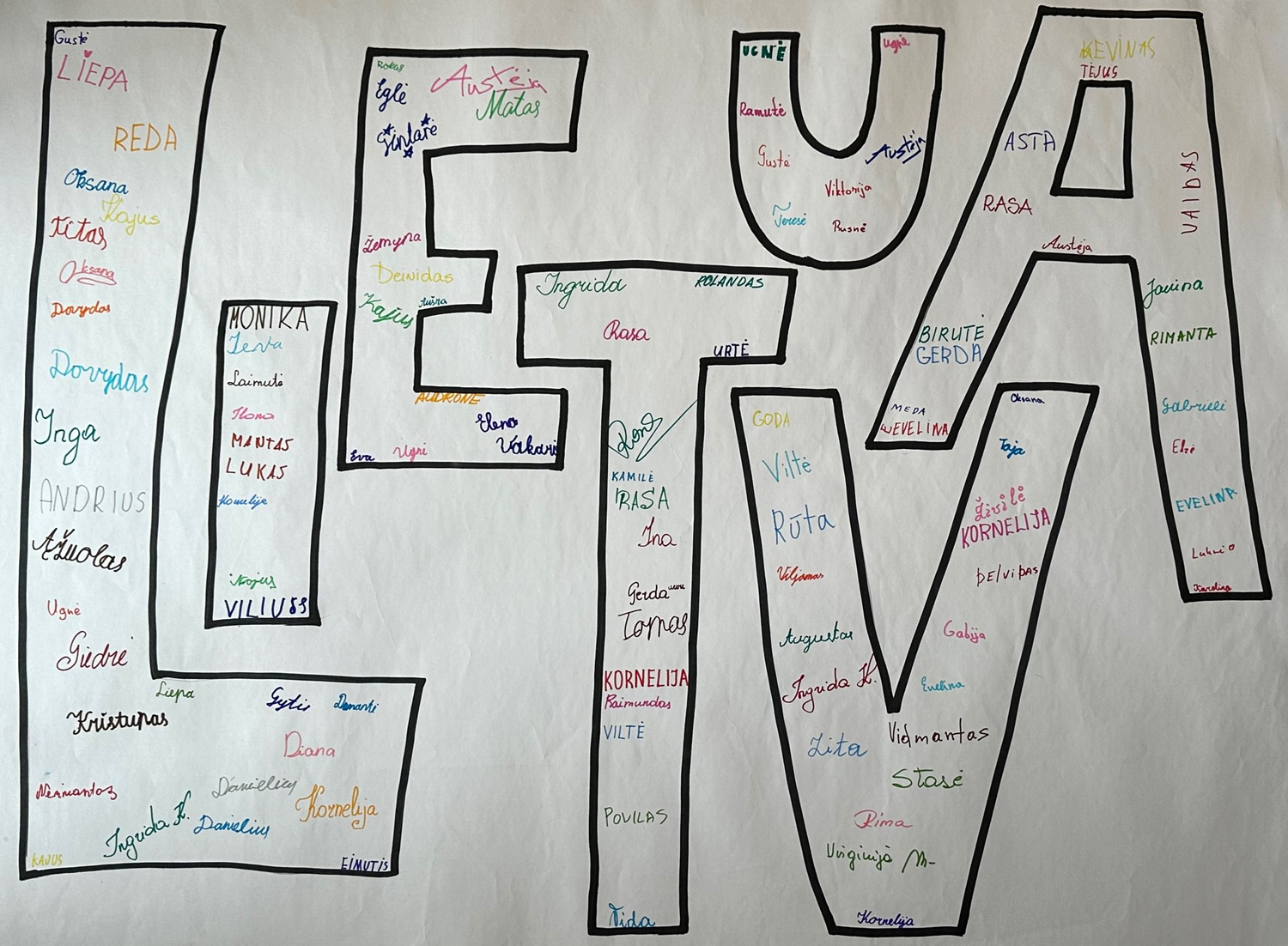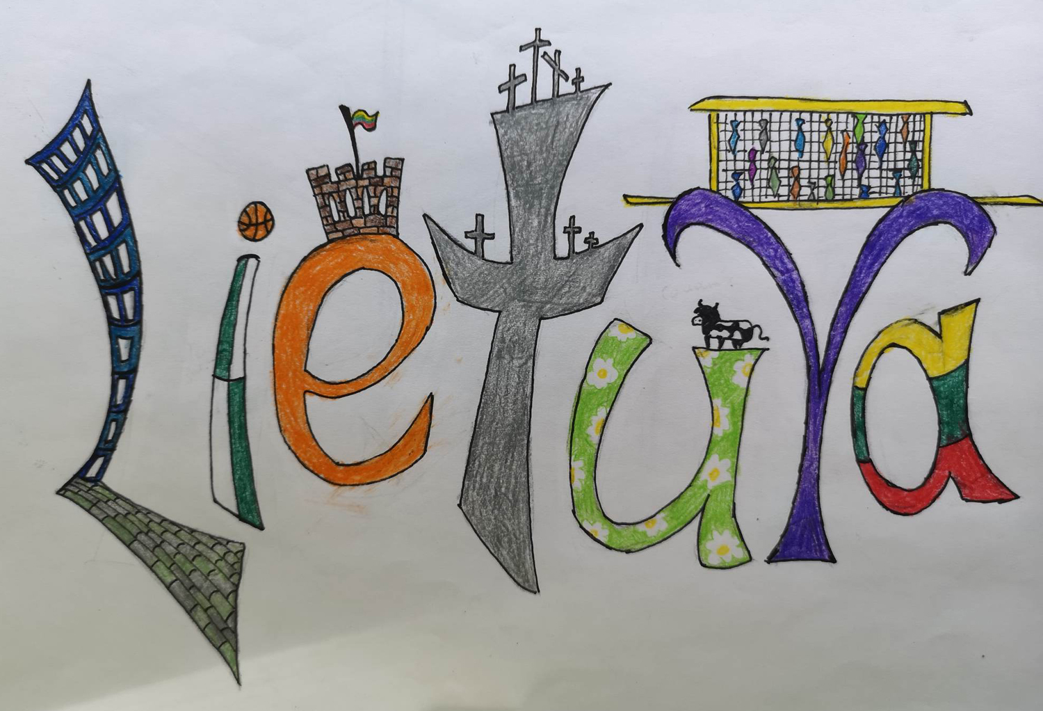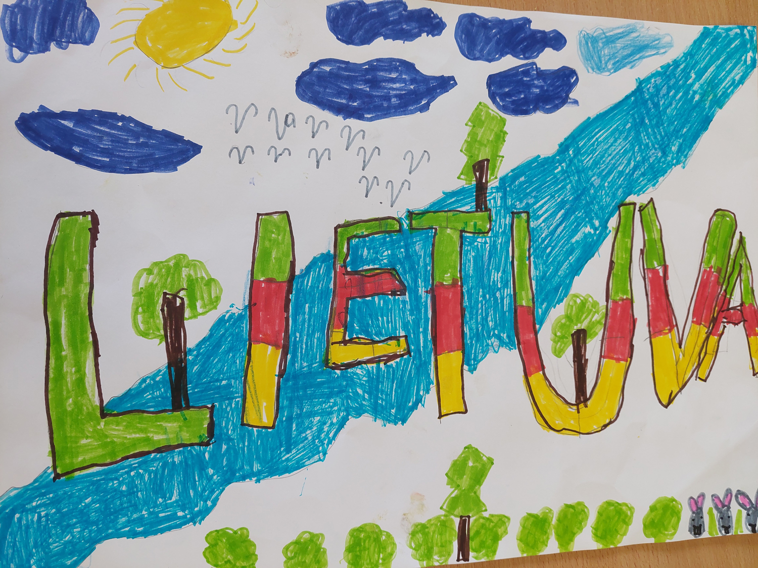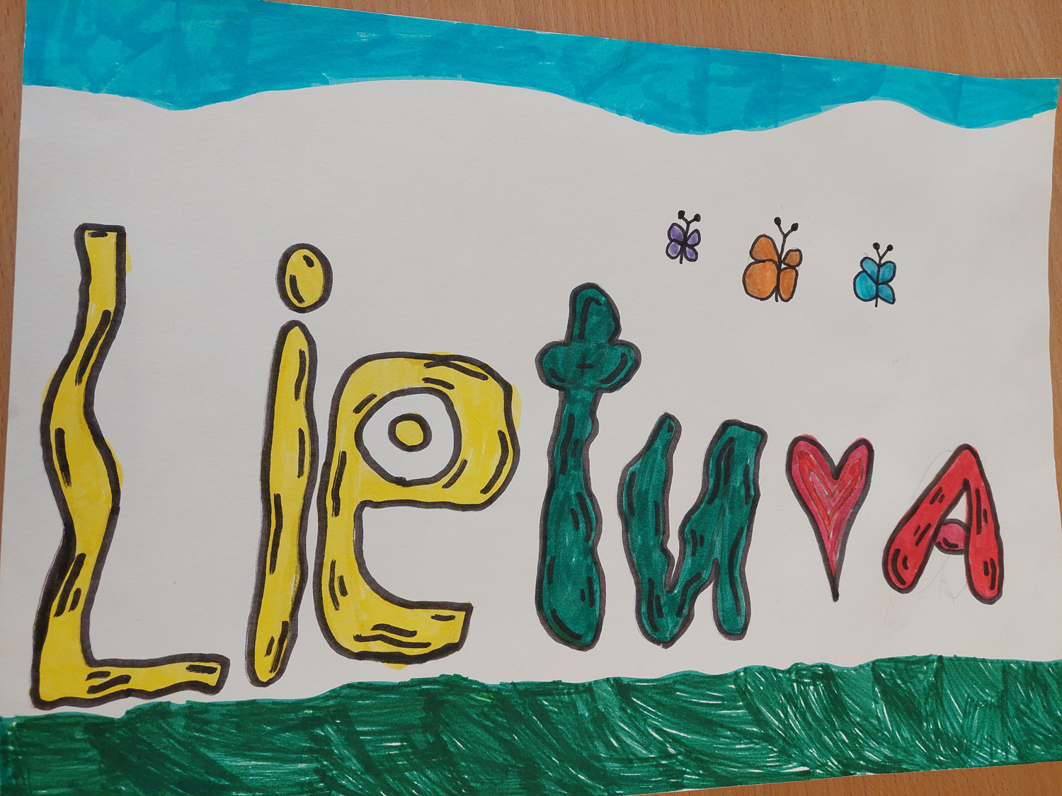 Pasirinkta technika 3a klasės vaikai piešė Lietuvos vardą. Lankstinių būrelis "Origamis" išlankstė mažas gėlytes ir sudėliojo žodį Lietuva.