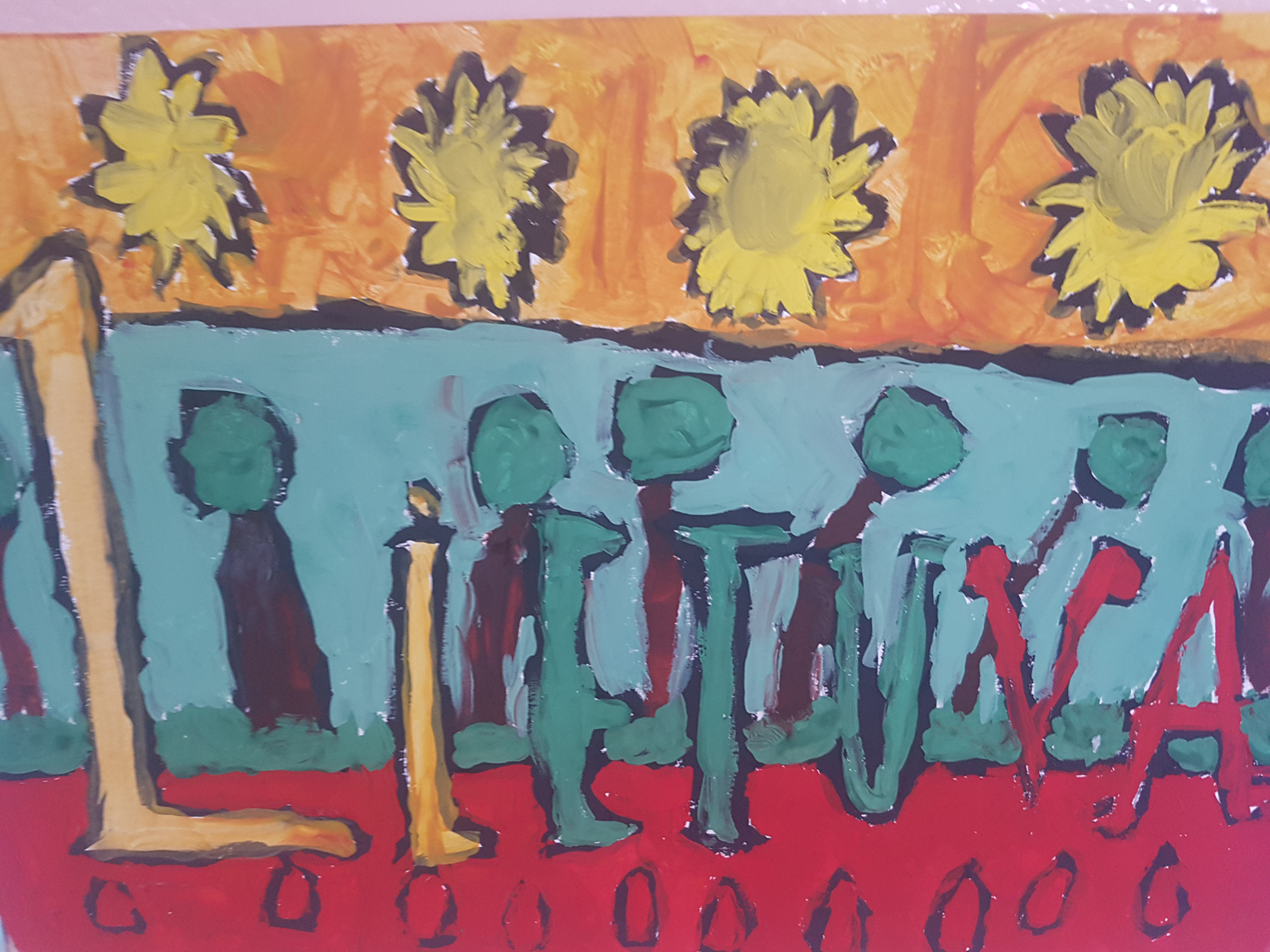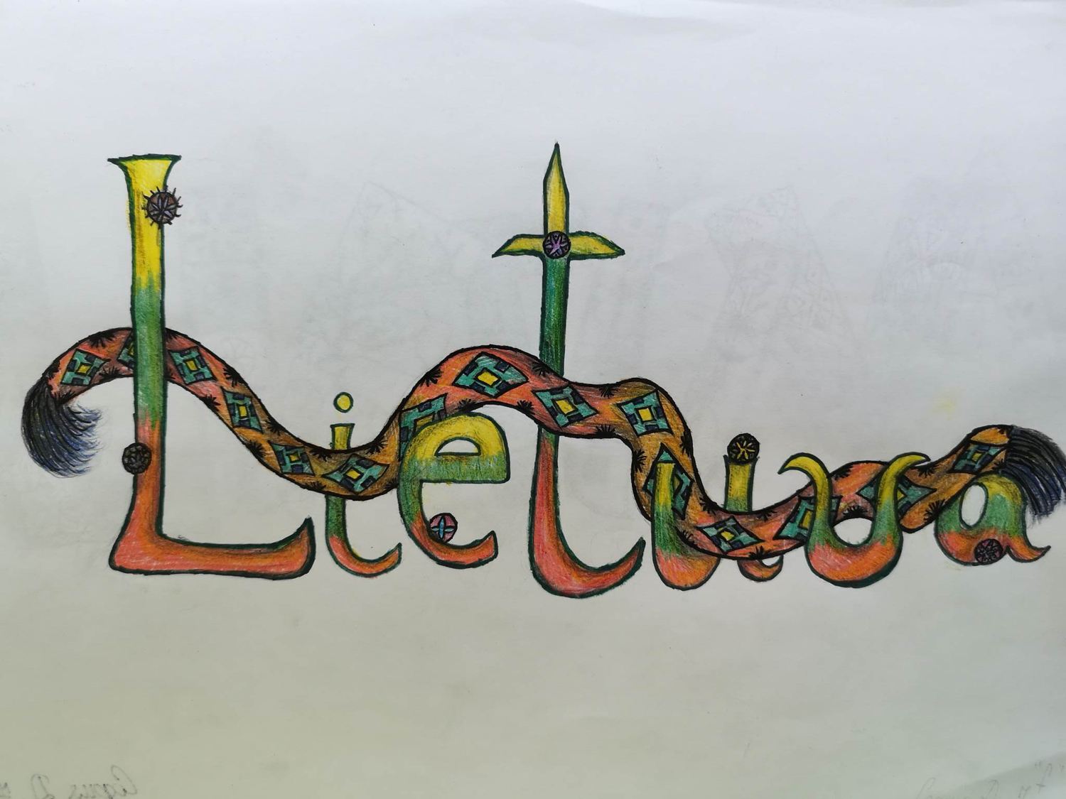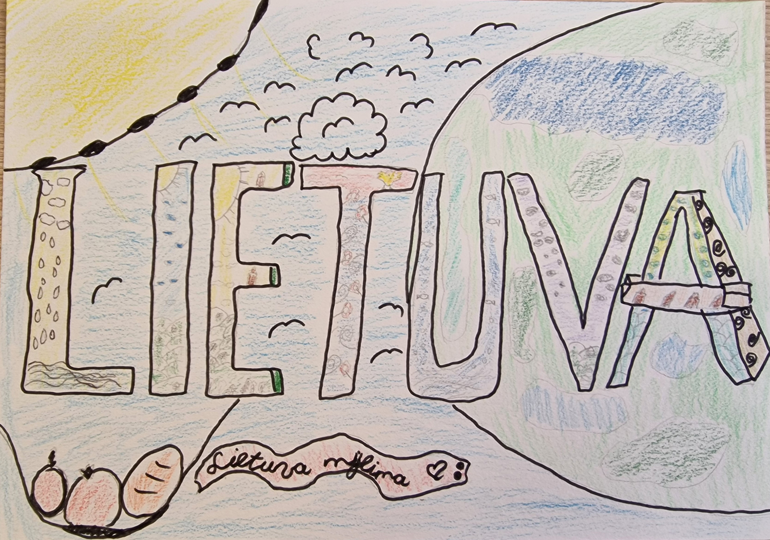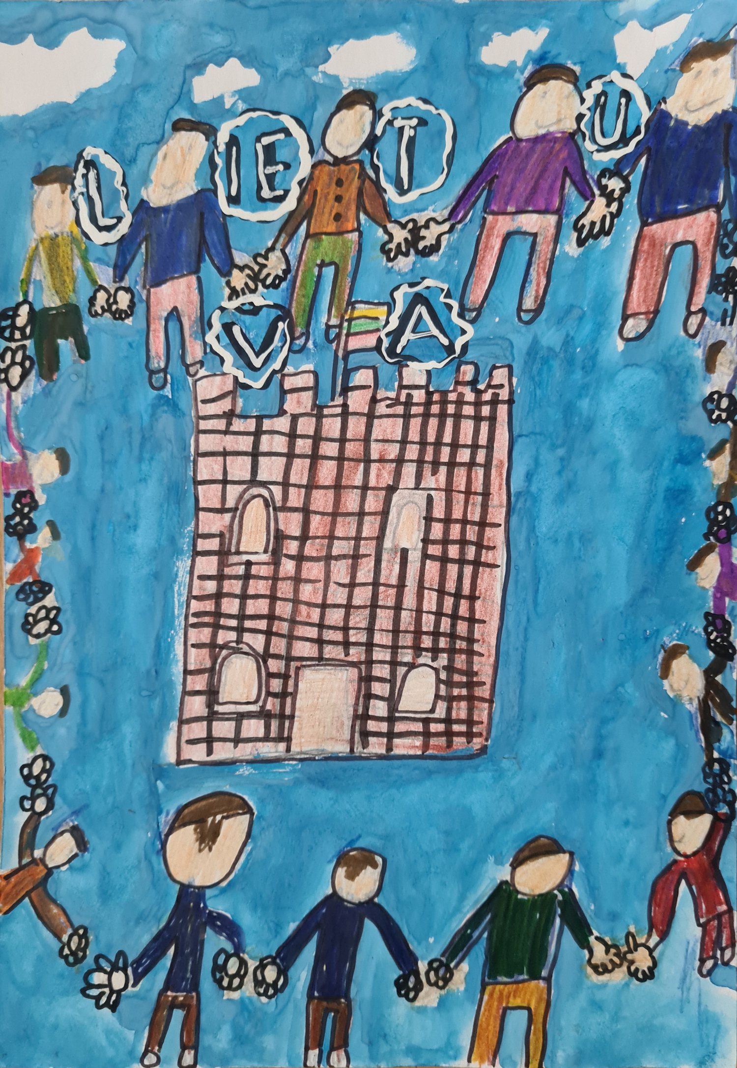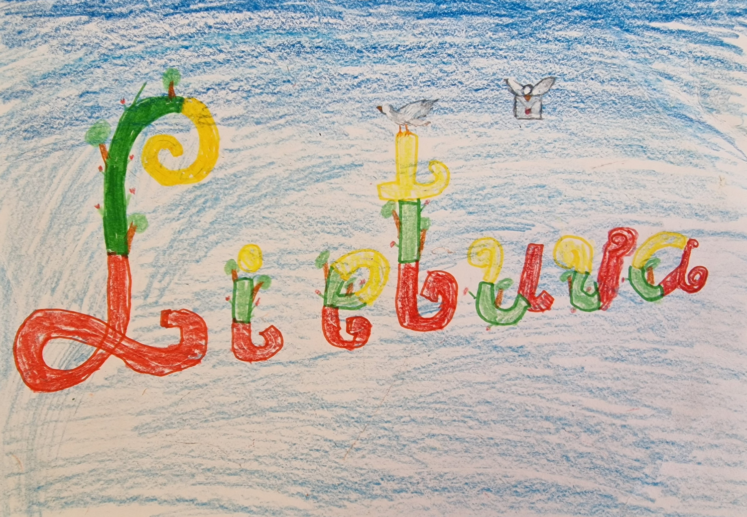 Pasirinkta technika 3a klasės vaikai piešė Lietuvos vardą. Lankstinių būrelis "Origamis" išlankstė mažas gėlytes ir sudėliojo žodį Lietuva.