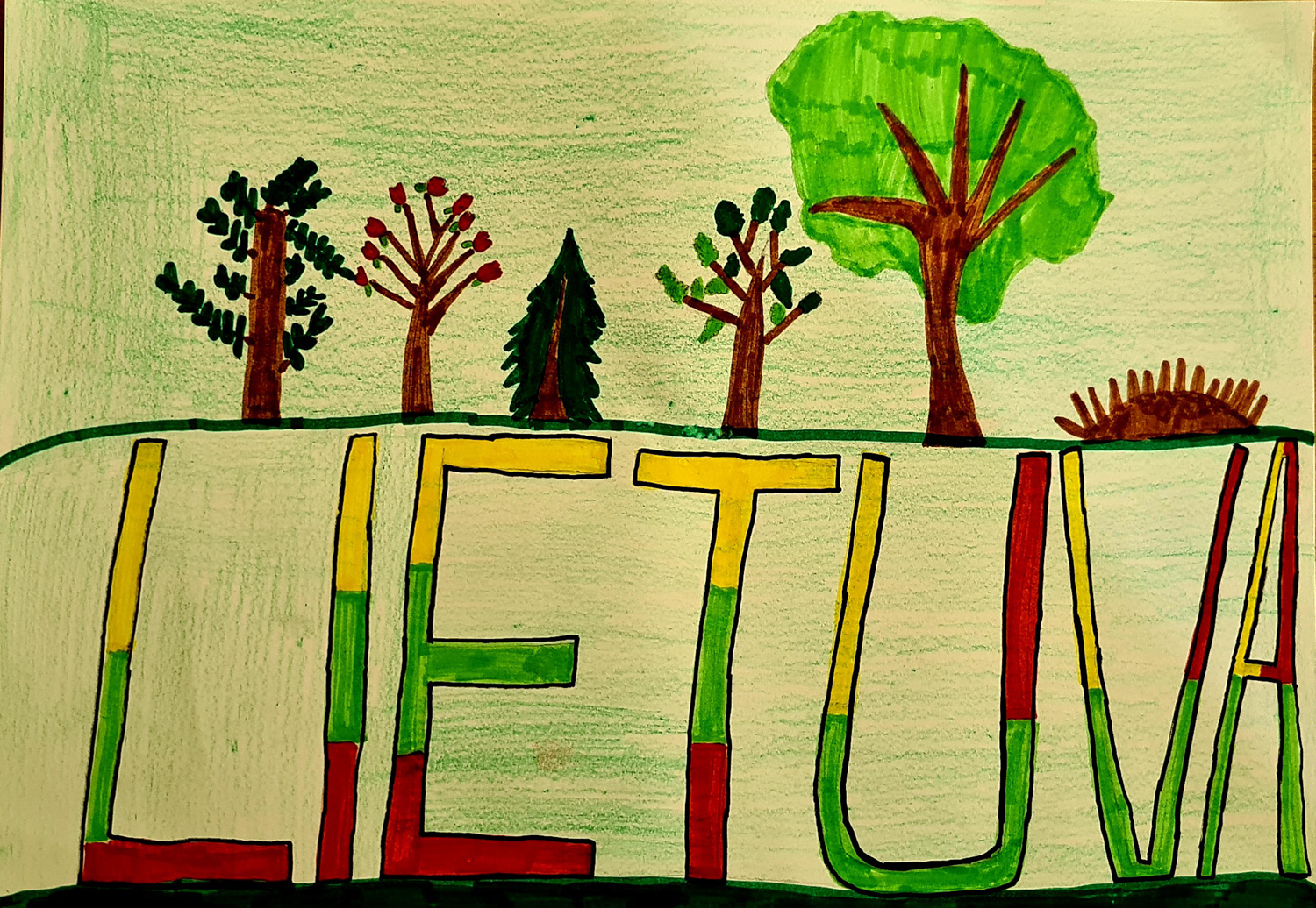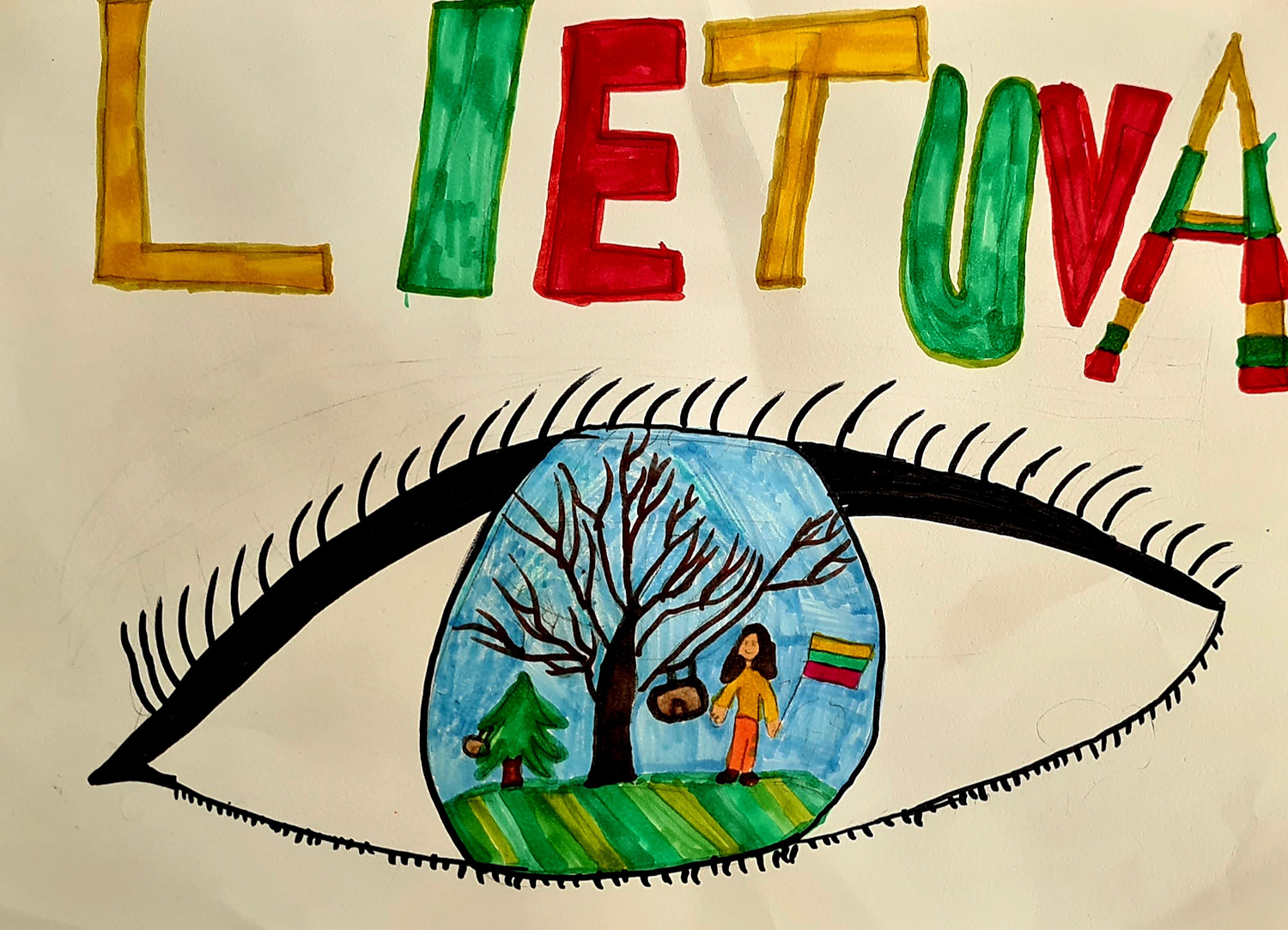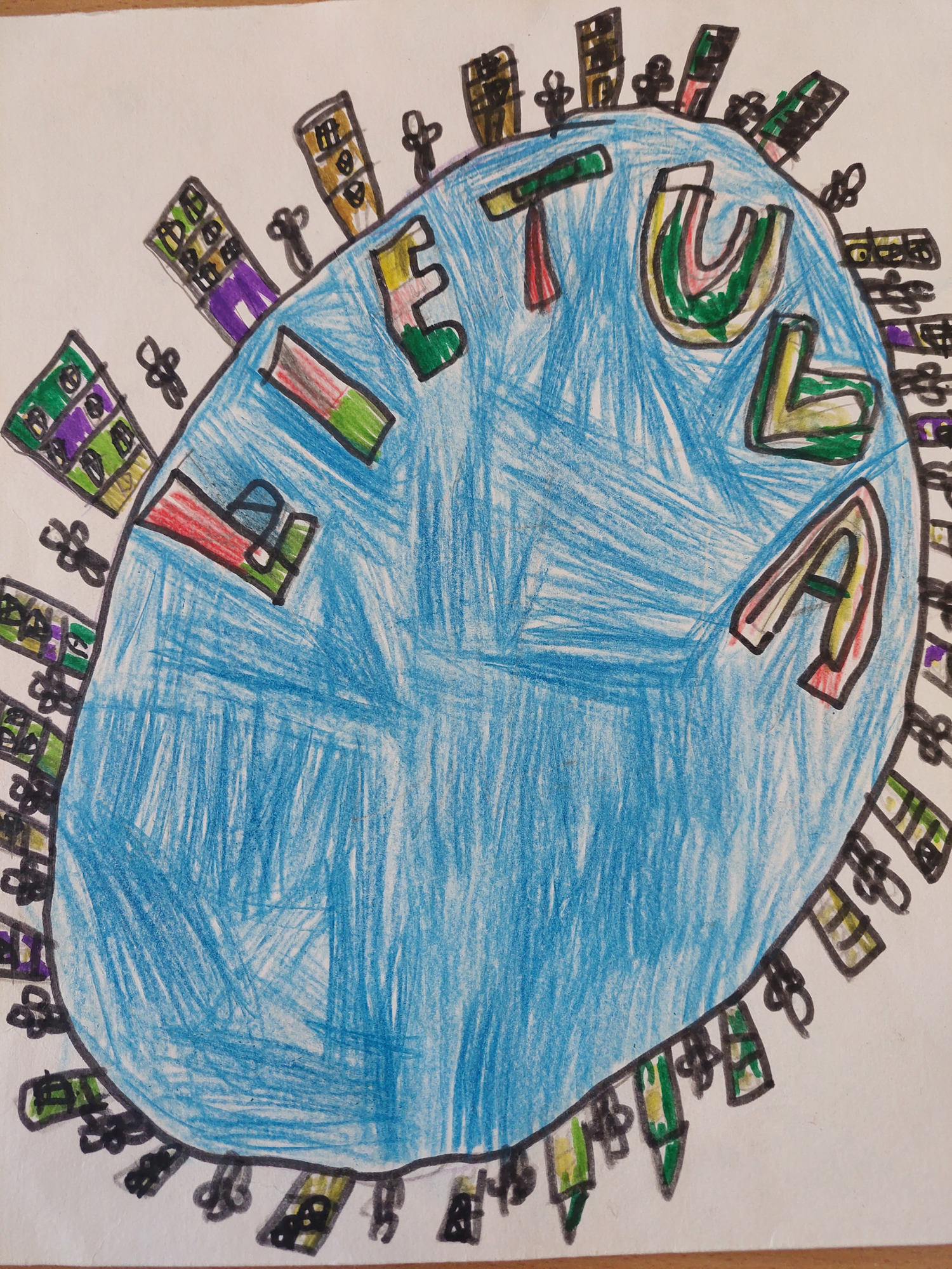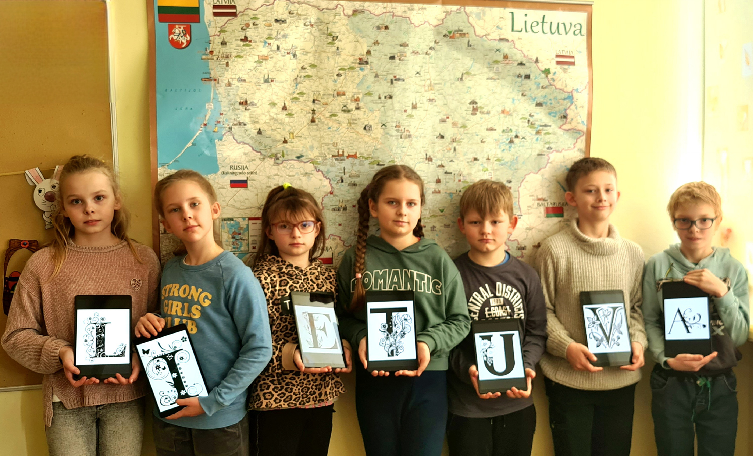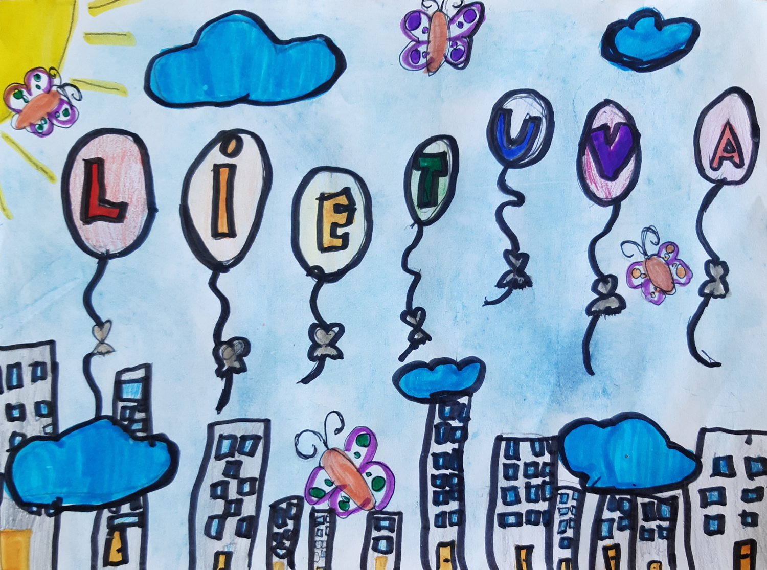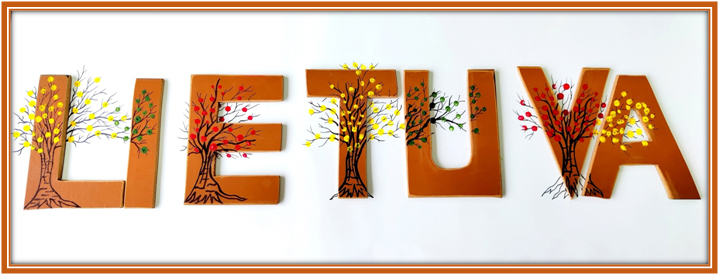 Pasirinkta technika 3a klasės vaikai piešė Lietuvos vardą. Lankstinių būrelis "Origamis" išlankstė mažas gėlytes ir sudėliojo žodį Lietuva.