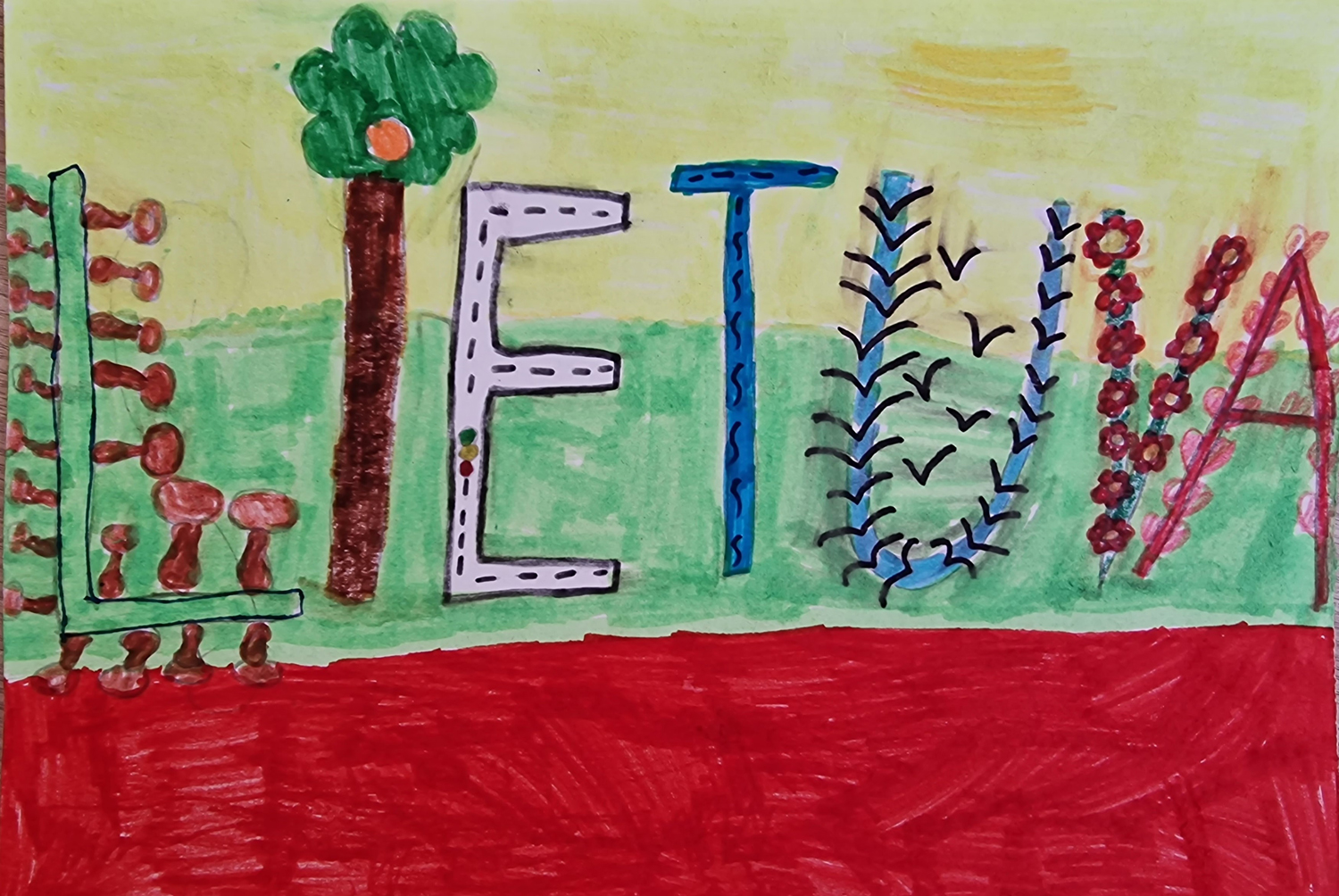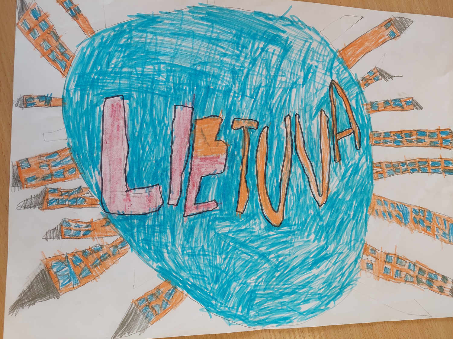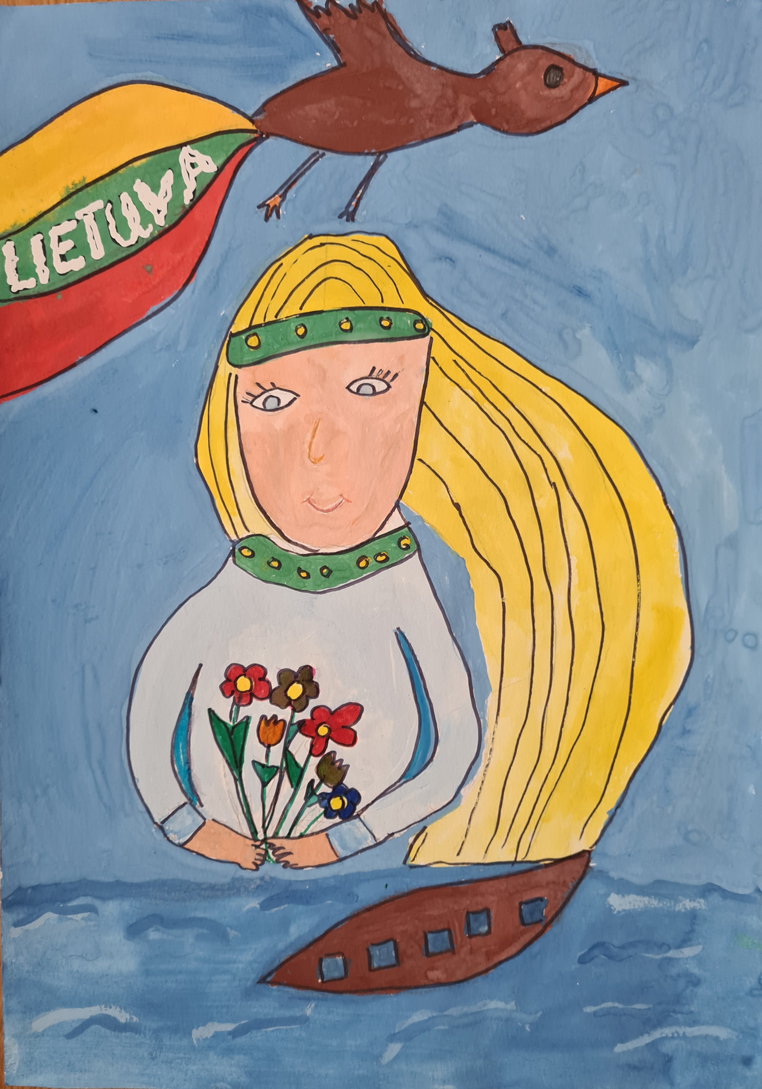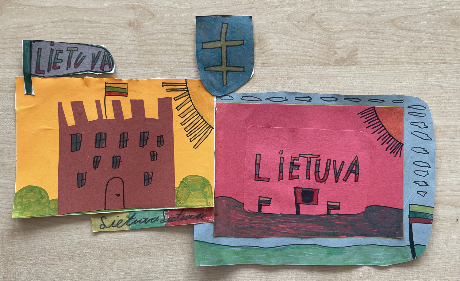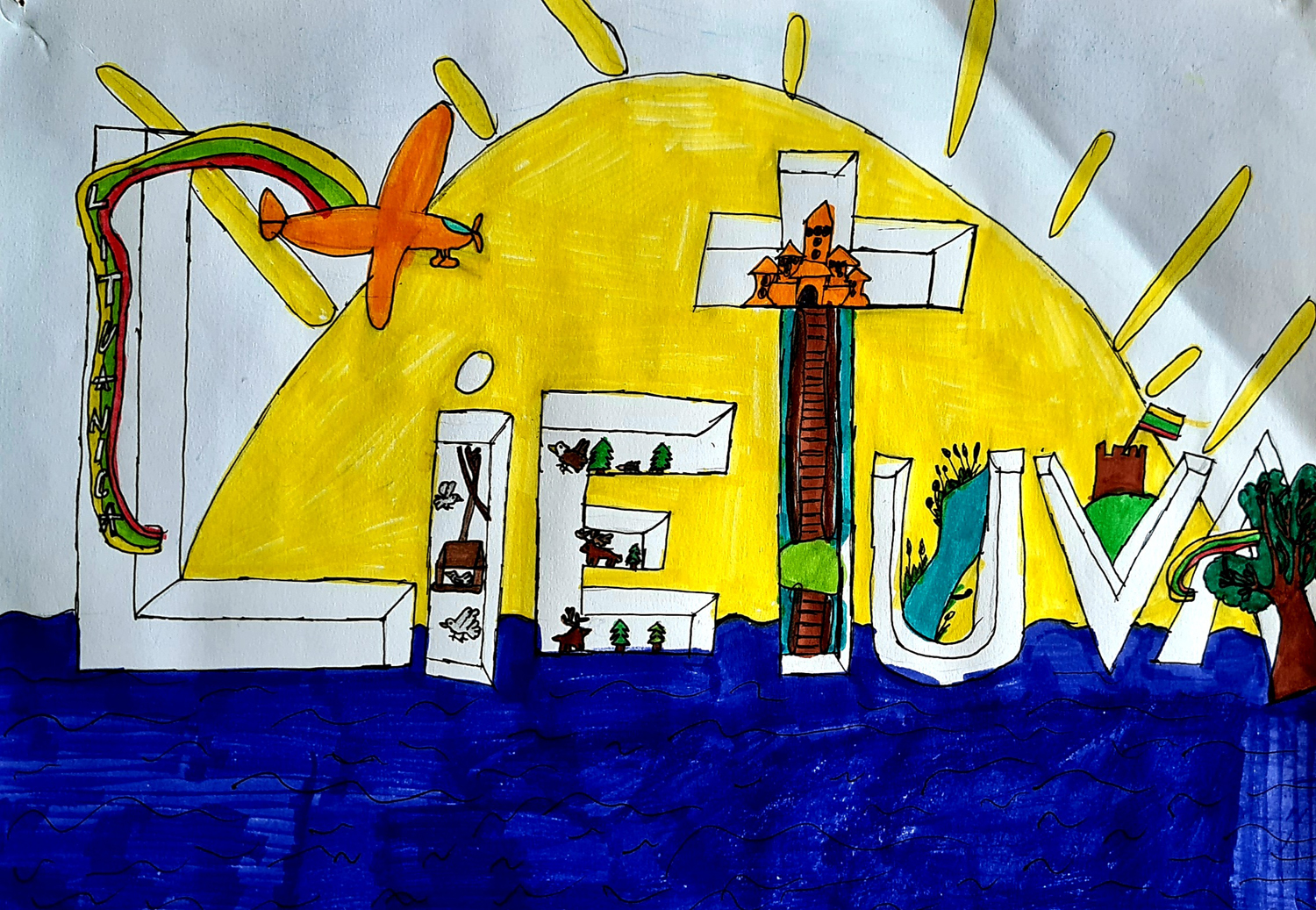Pasirinkta technika 3a klasės vaikai piešė Lietuvos vardą. Lankstinių būrelis "Origamis" išlankstė mažas gėlytes ir sudėliojo žodį Lietuva.