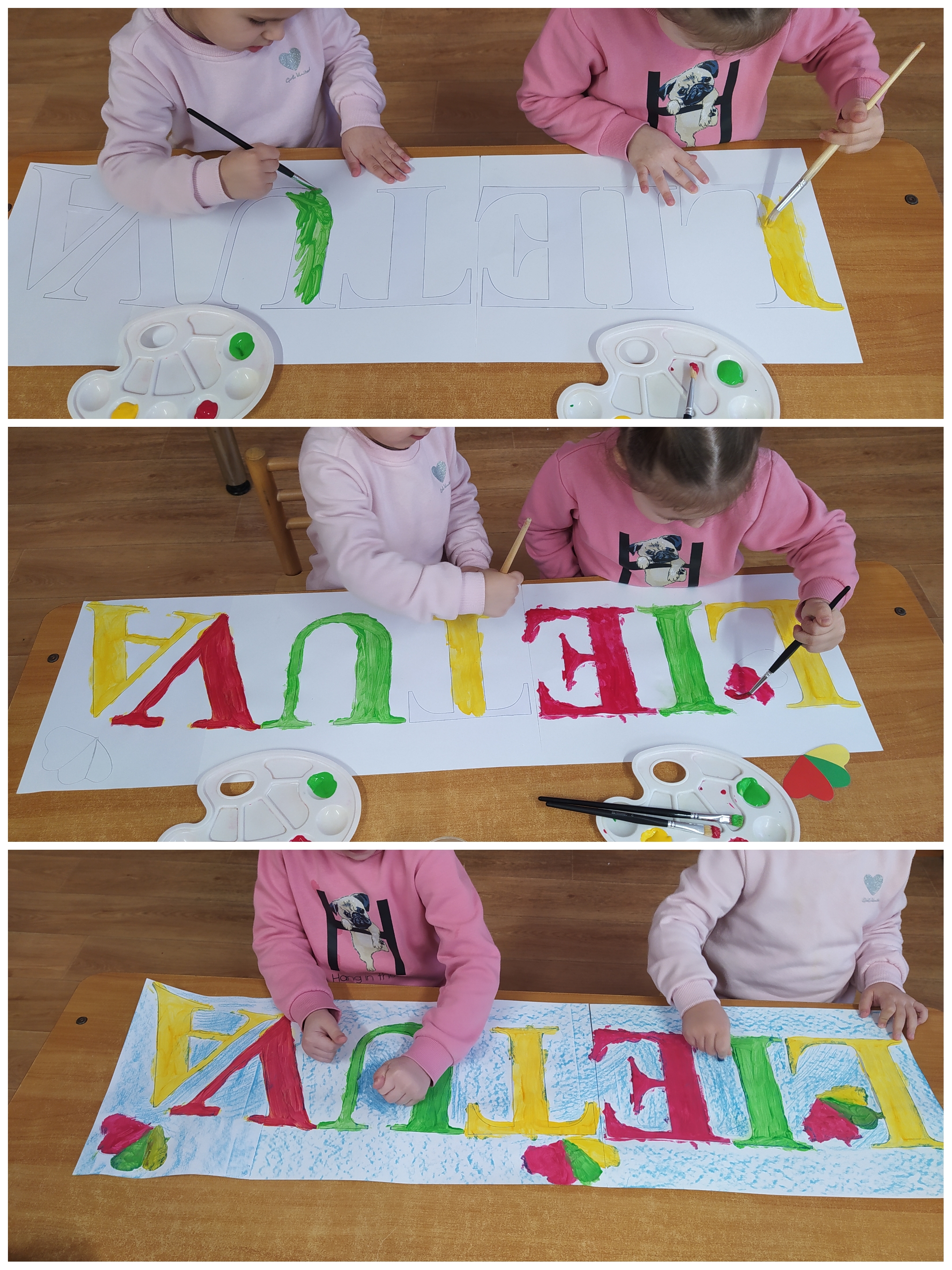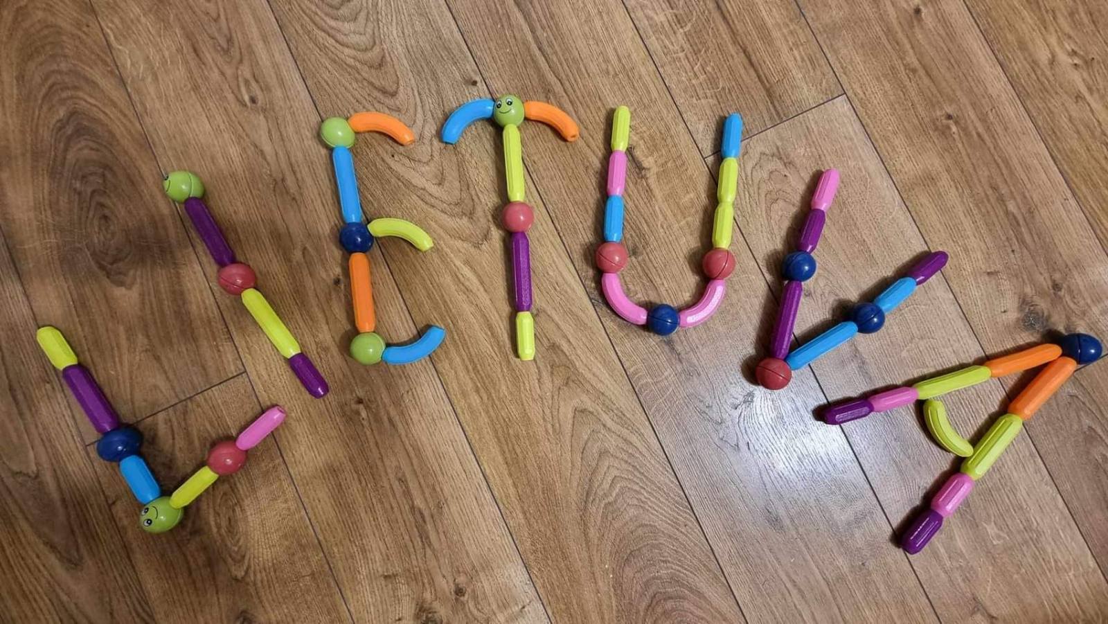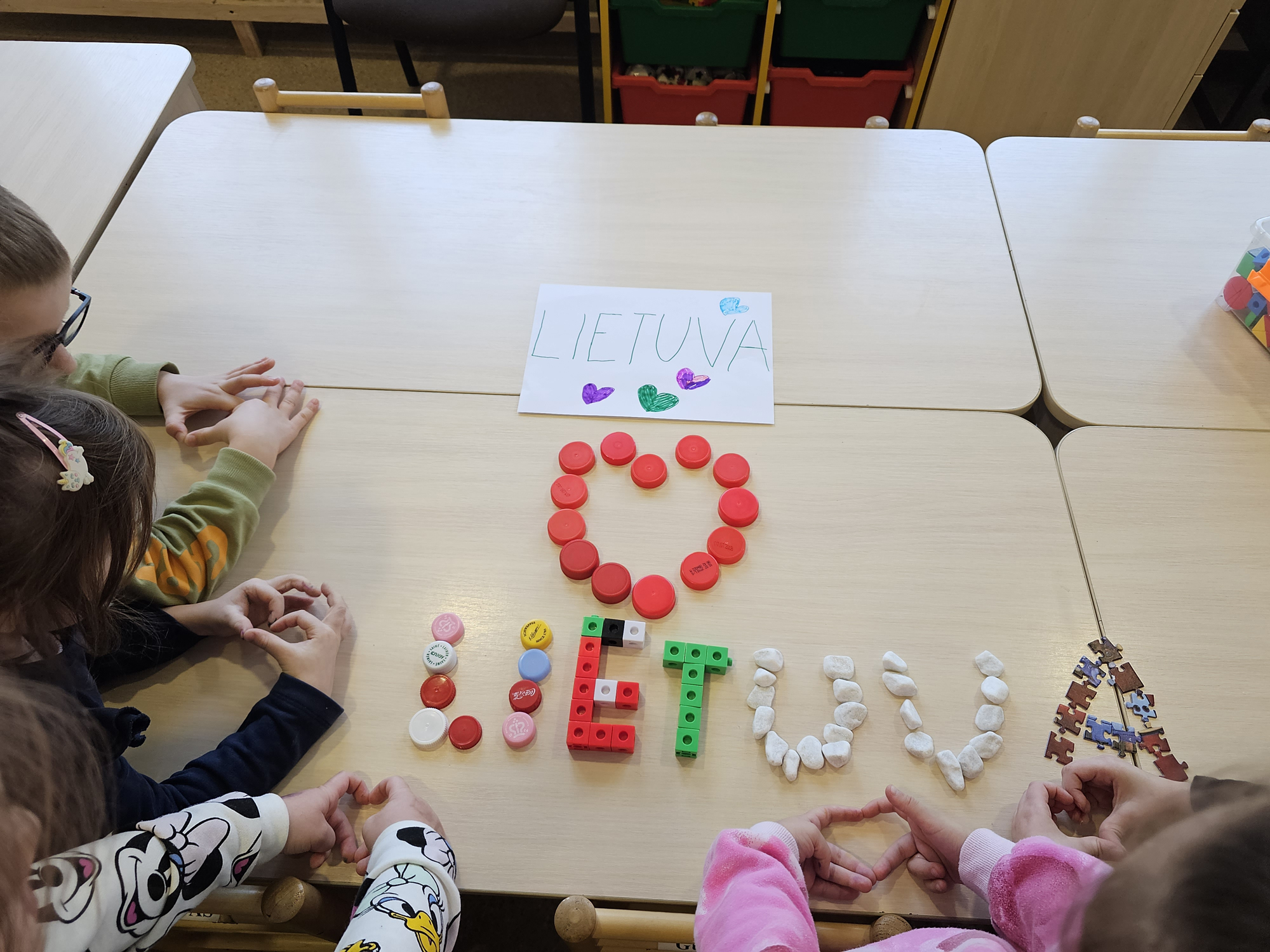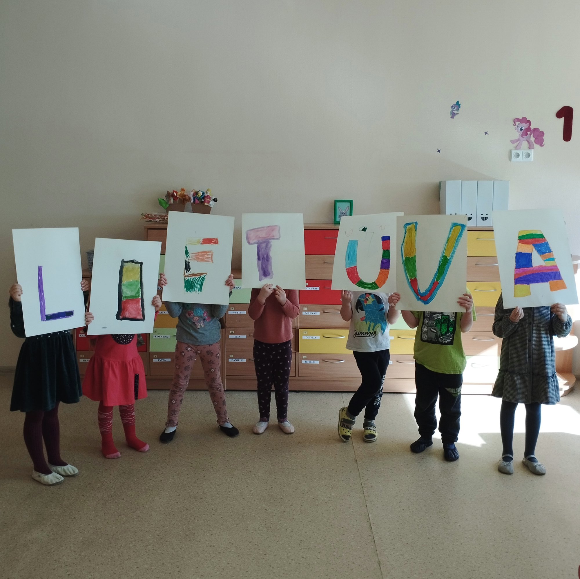 „Zuikių“ grupė, 5 metų vaikai mokosi pažinti ir rašyti raides, jungti garsus ir skaityti. Bet kad būtų smagiau mokytis, raides rašome ir piešiame ne tik įprastomis priemonėmis, bet kuriame ir kitaip. Pristatome savo idėją – Lietuvos vardas iš pirštukų. Ikimokyklinio ugdymo mokytoja Romualda Budrienė