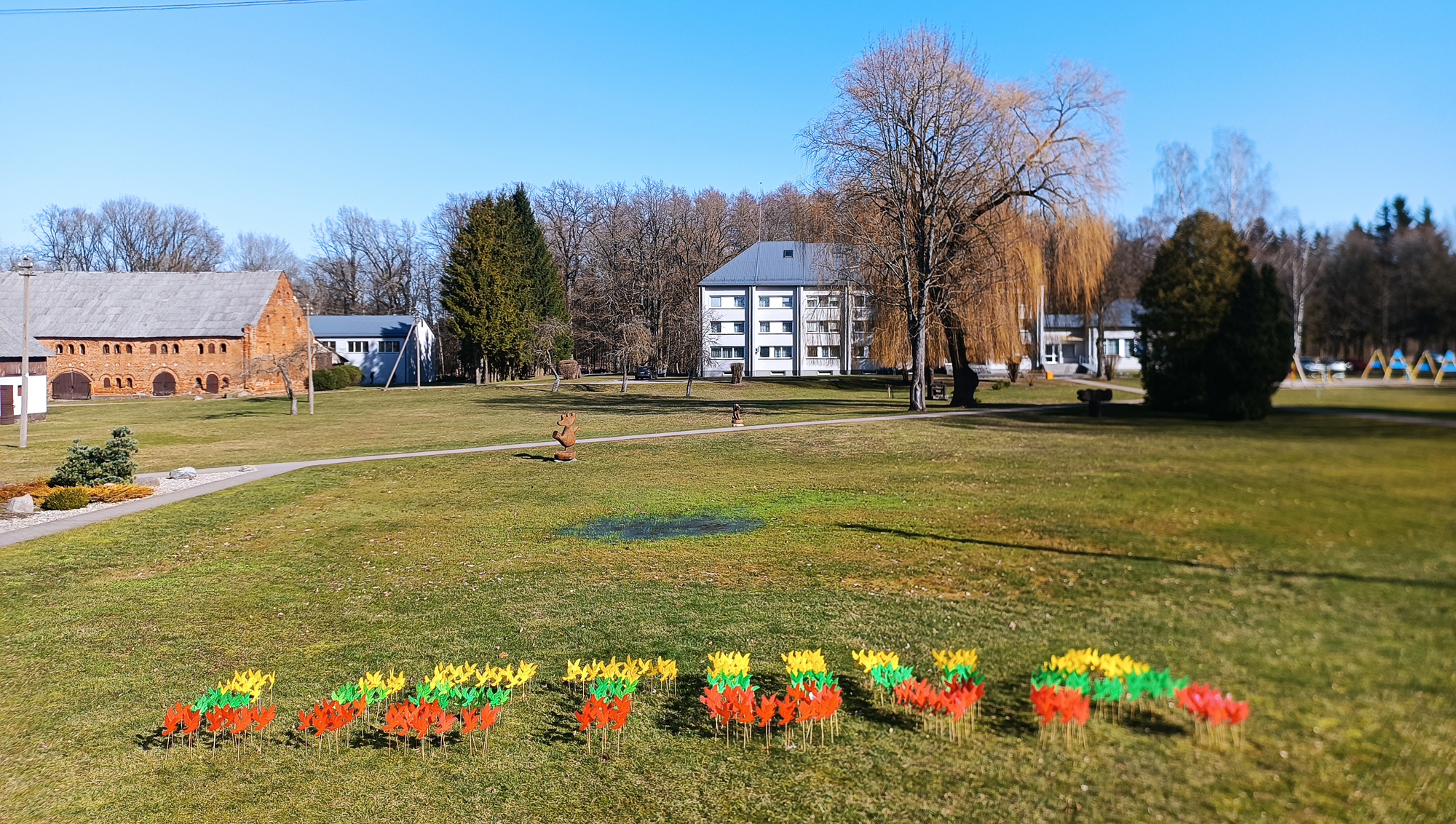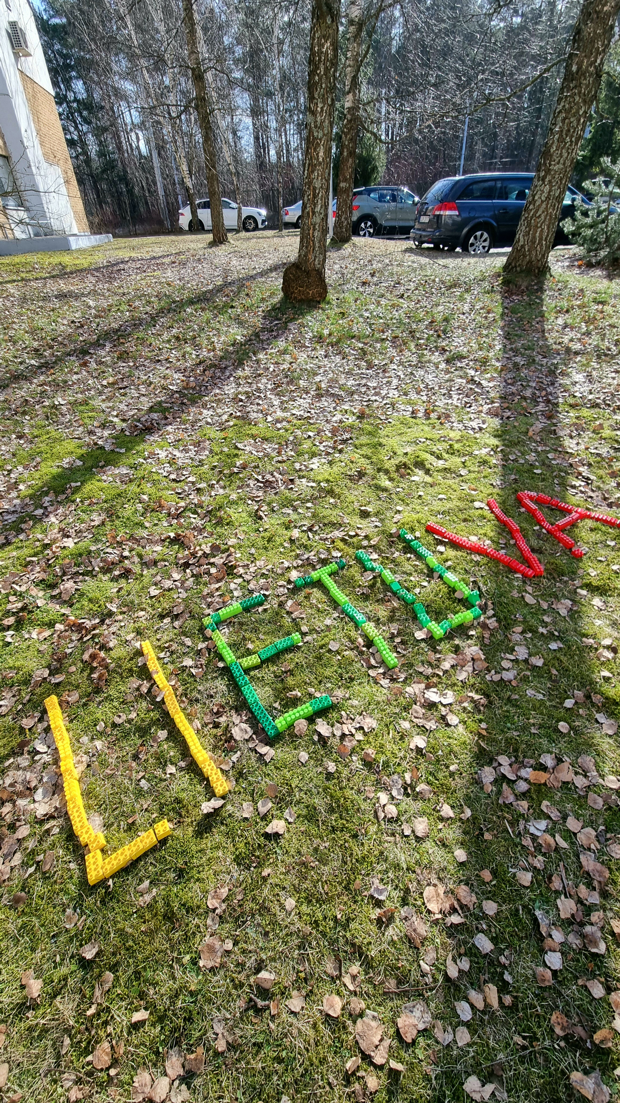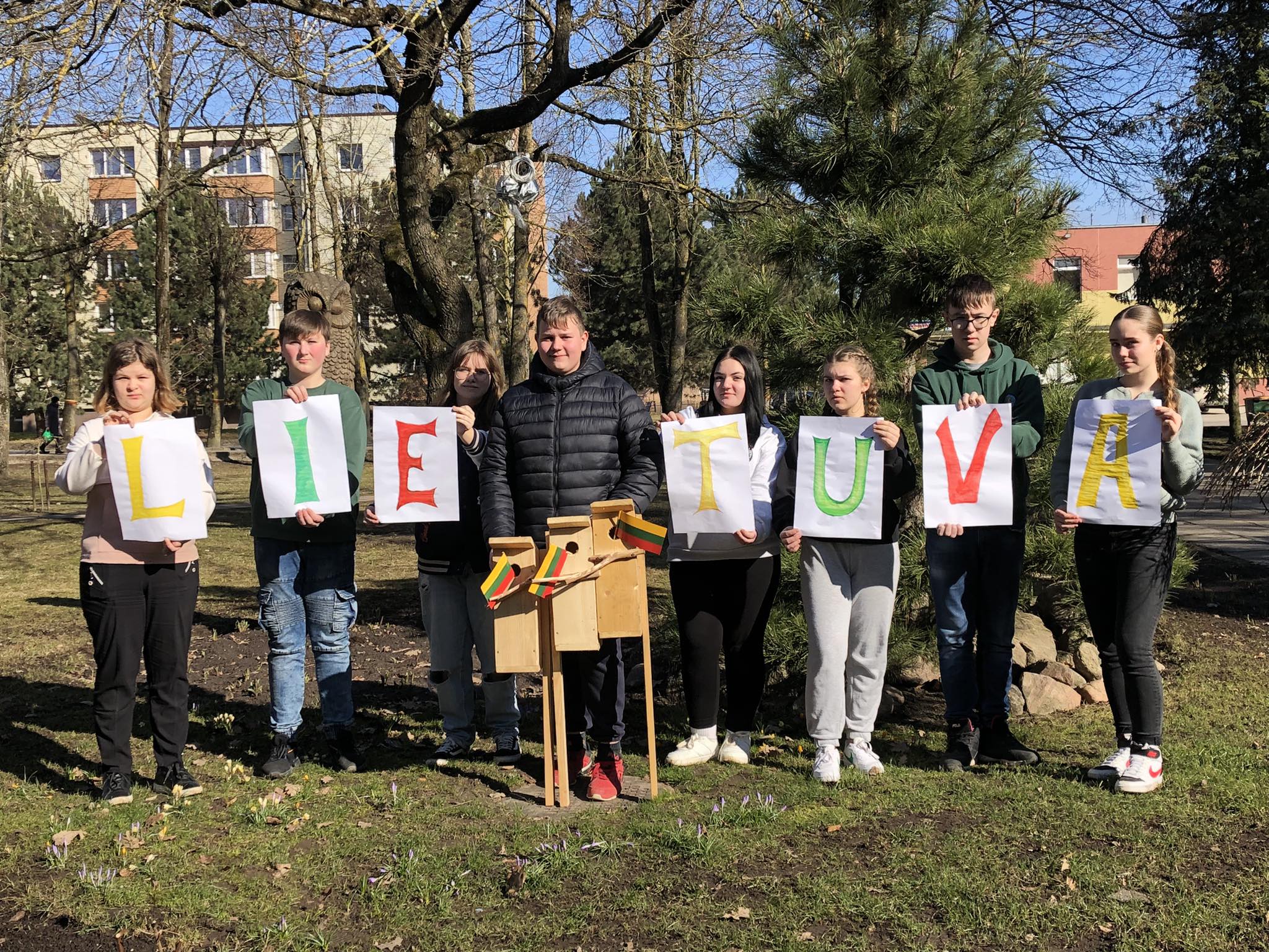 8 kl. mokiniai, nupiešę ryškiausias raides, sudėjo brangiausią žodį...LIETUVA, o jų tėveliai pagaminę atvežė inkilus sugrįžusiems tėvynėn giesmininkams... Viskas kartu - Dovana Lietuvai (mokytojos Dalė Janušauskienė, Aurelija Reutienė)