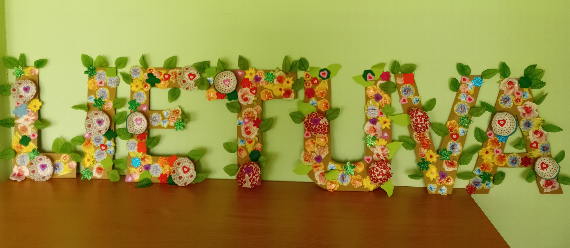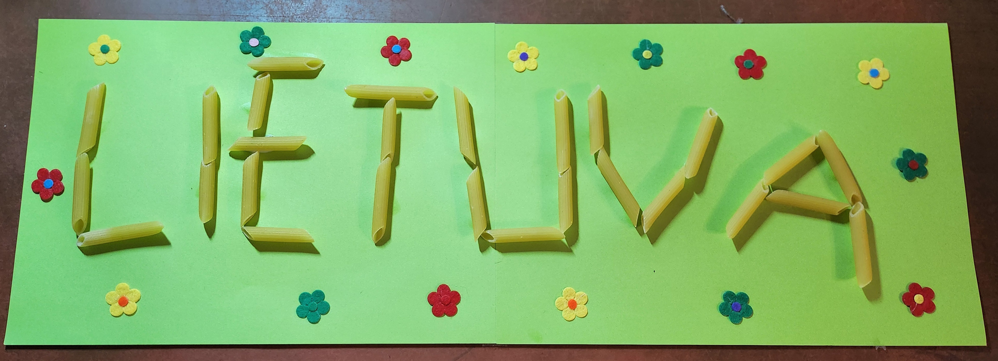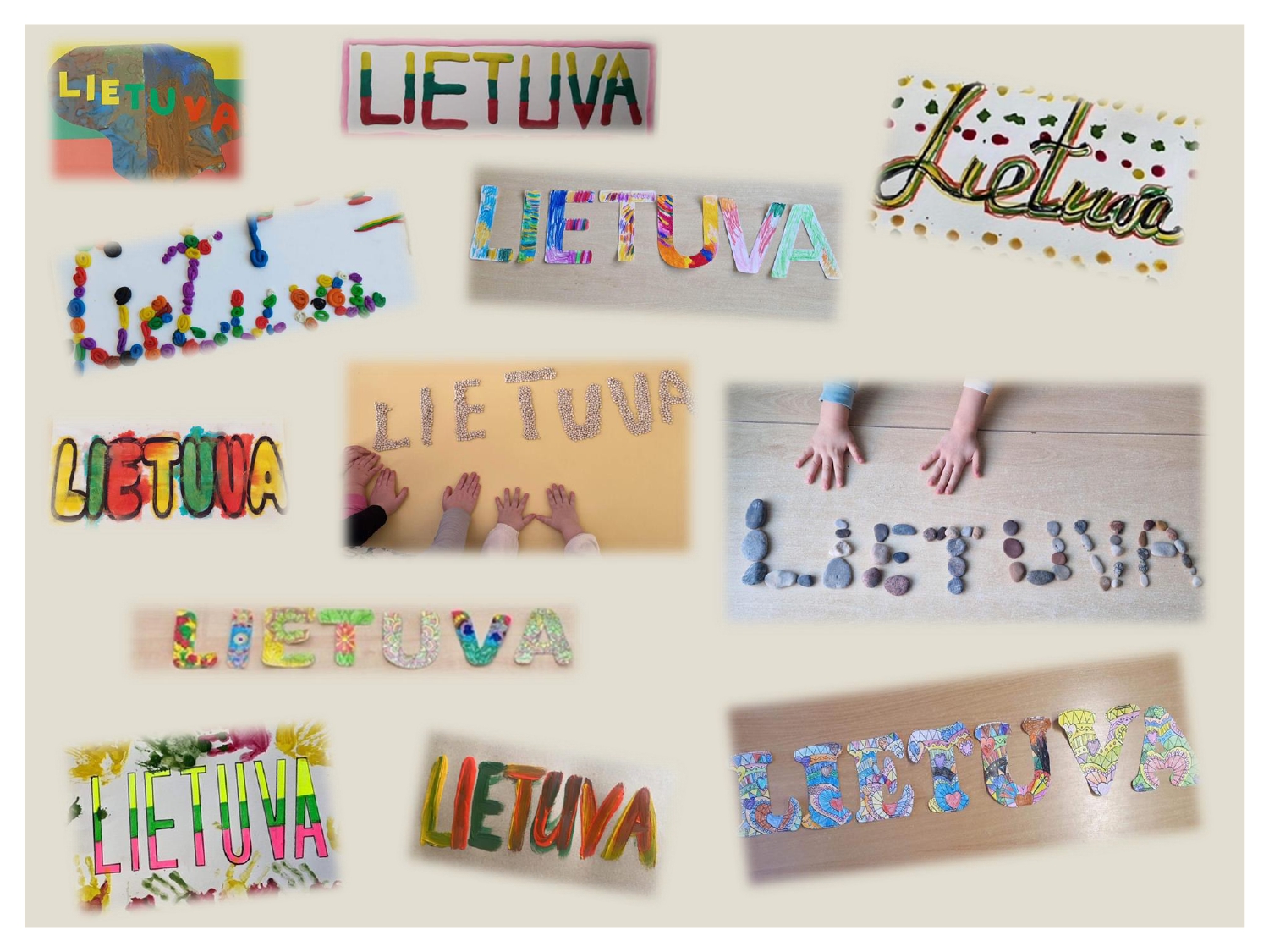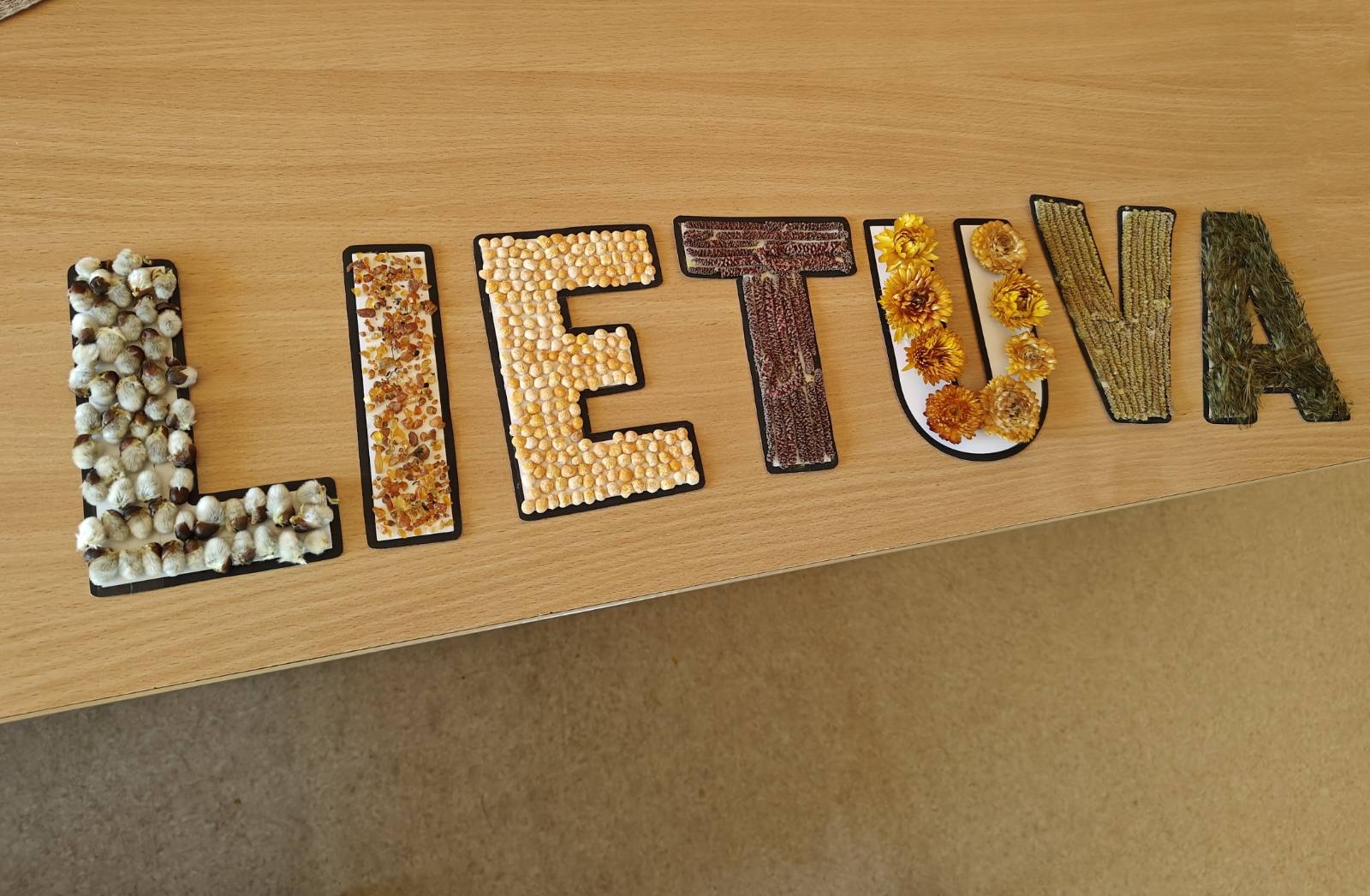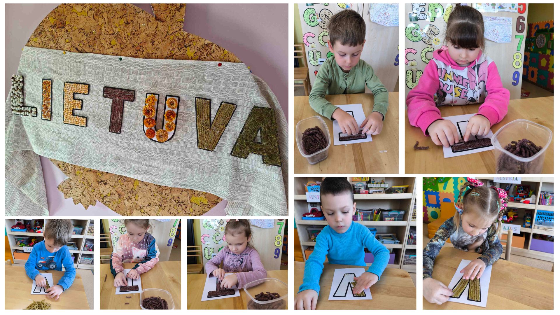 Lietuvos vardui užrašyti panaudojome džiovintų gėlių ir smilgų, žirnių, švelnių „kačiukų“, žirginėlių, bei Lietuvos auksu vadinamo gintaro. „Kiškučių'' grupės vaikai kruopščiai suklijavo Lietuvos raides. Mokytoja Dainora Valančauskienė