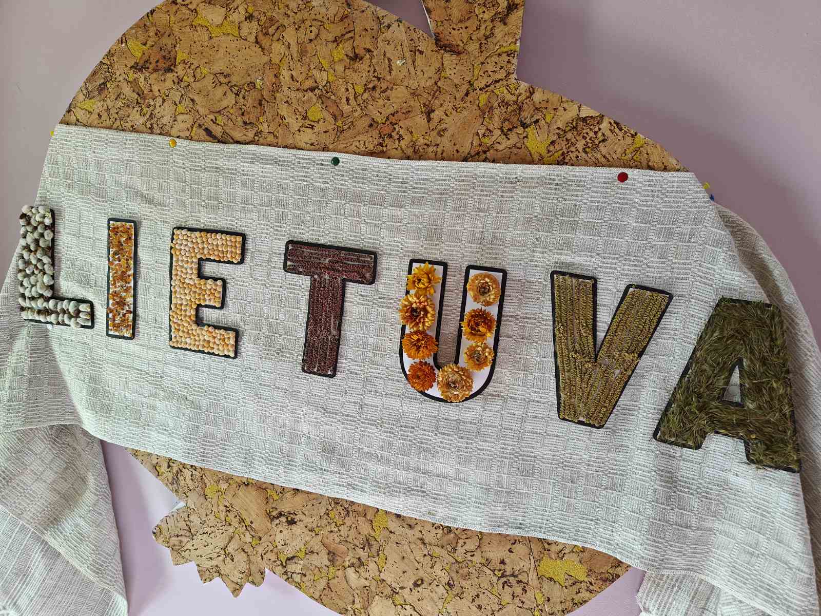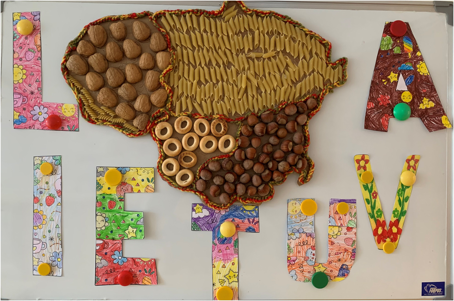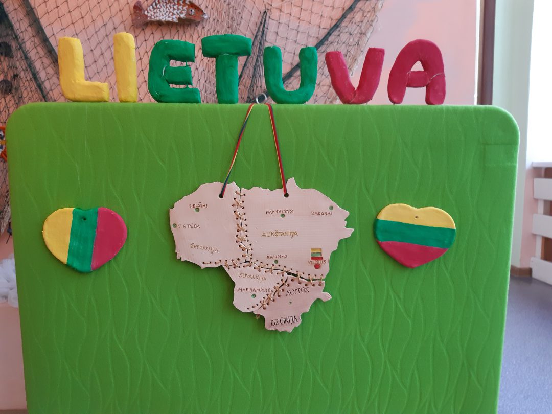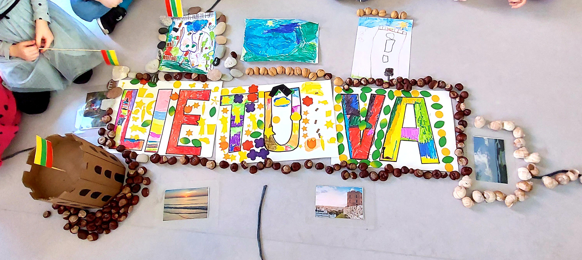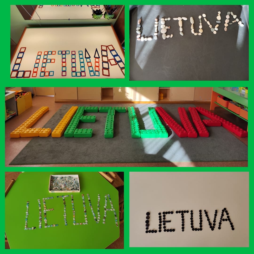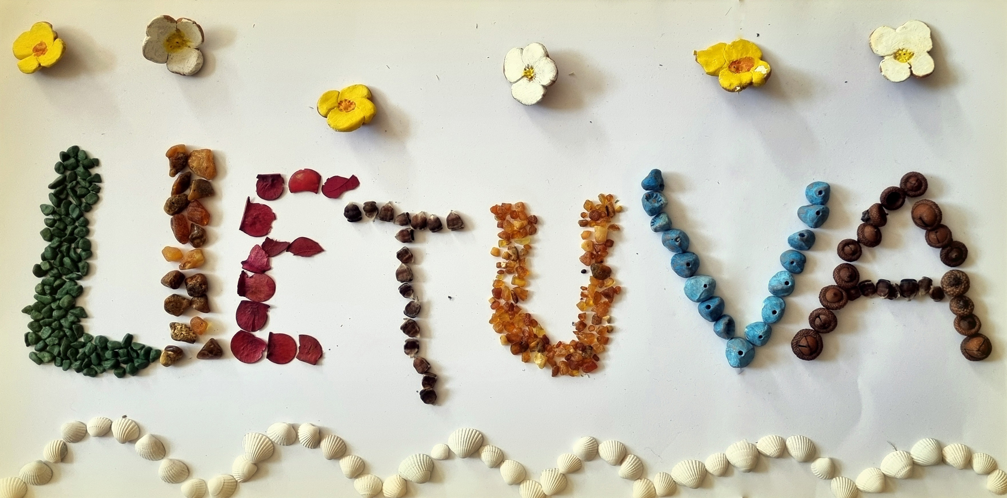 Lietuvos vardui užrašyti panaudojome džiovintų gėlių ir smilgų, žirnių, švelnių „kačiukų“, žirginėlių, bei Lietuvos auksu vadinamo gintaro. „Kiškučių'' grupės vaikai kruopščiai suklijavo Lietuvos raides. Mokytoja Dainora Valančauskienė