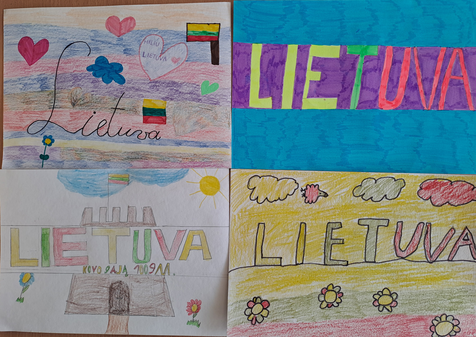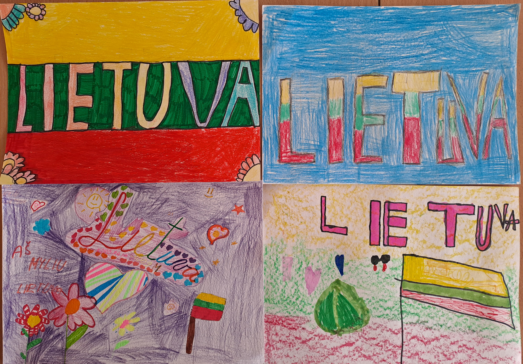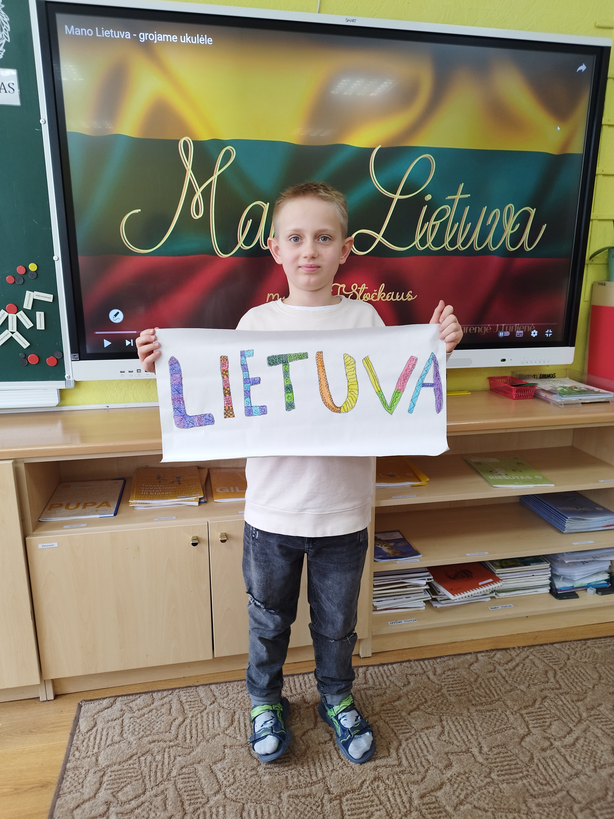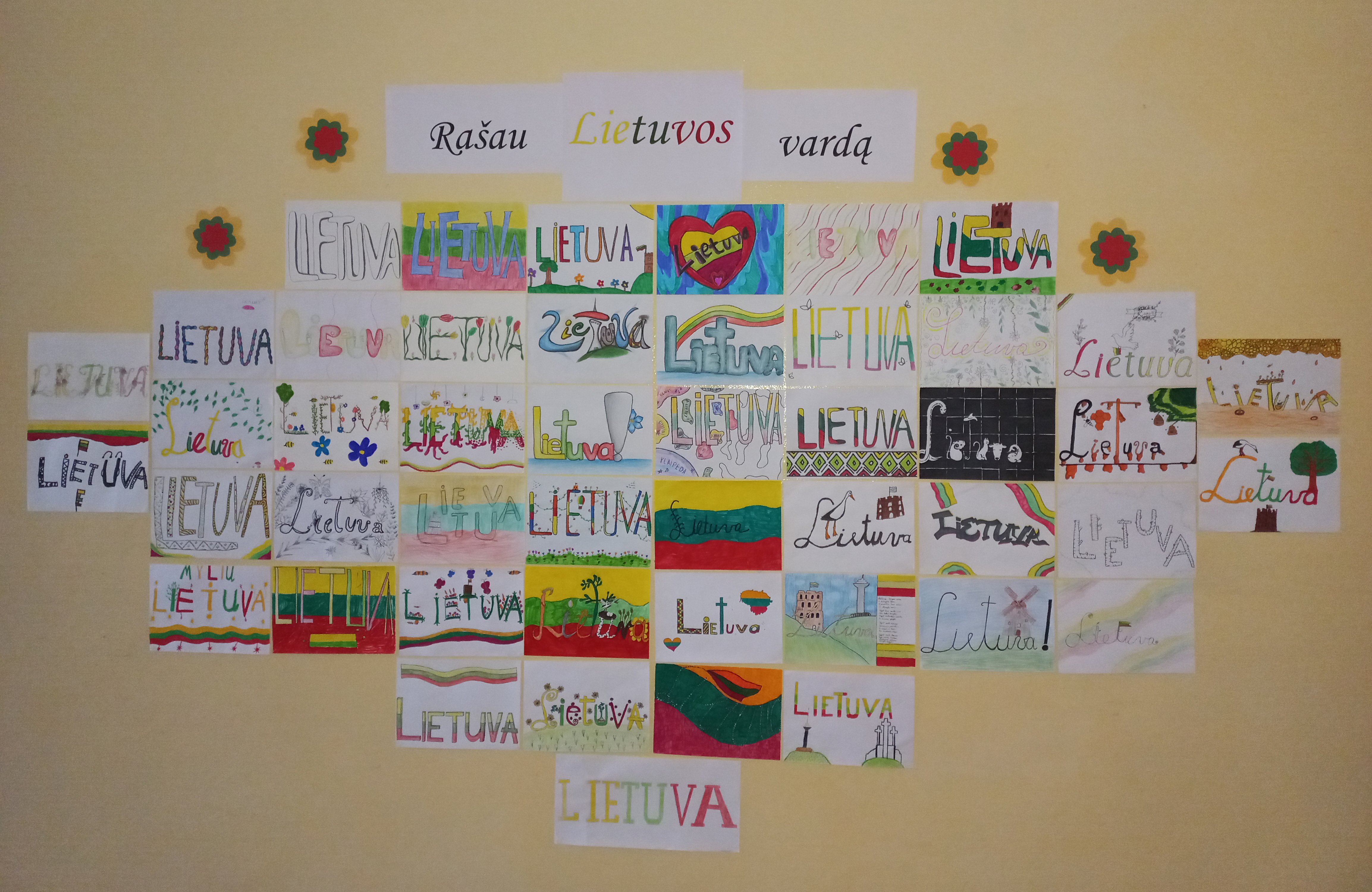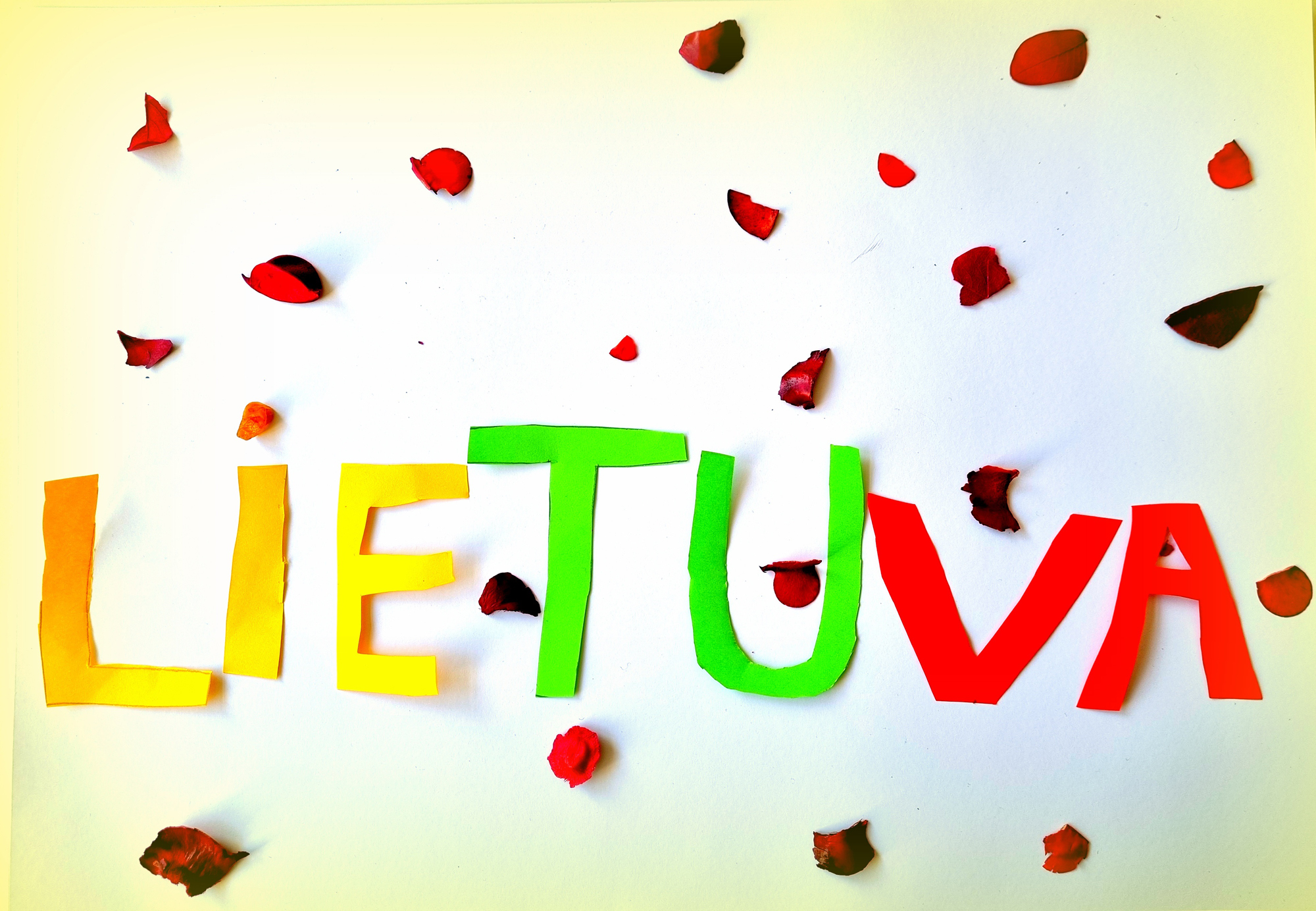 Lietuvos vardui užrašyti panaudojome džiovintų gėlių ir smilgų, žirnių, švelnių „kačiukų“, žirginėlių, bei Lietuvos auksu vadinamo gintaro. „Kiškučių'' grupės vaikai kruopščiai suklijavo Lietuvos raides. Mokytoja Dainora Valančauskienė