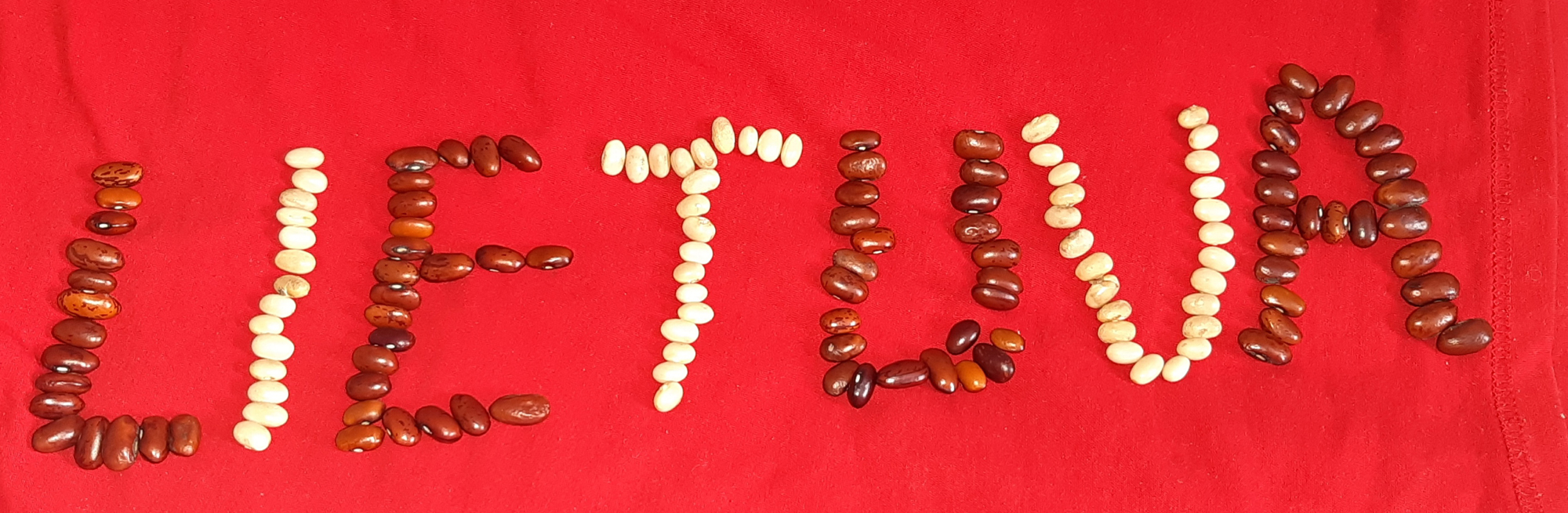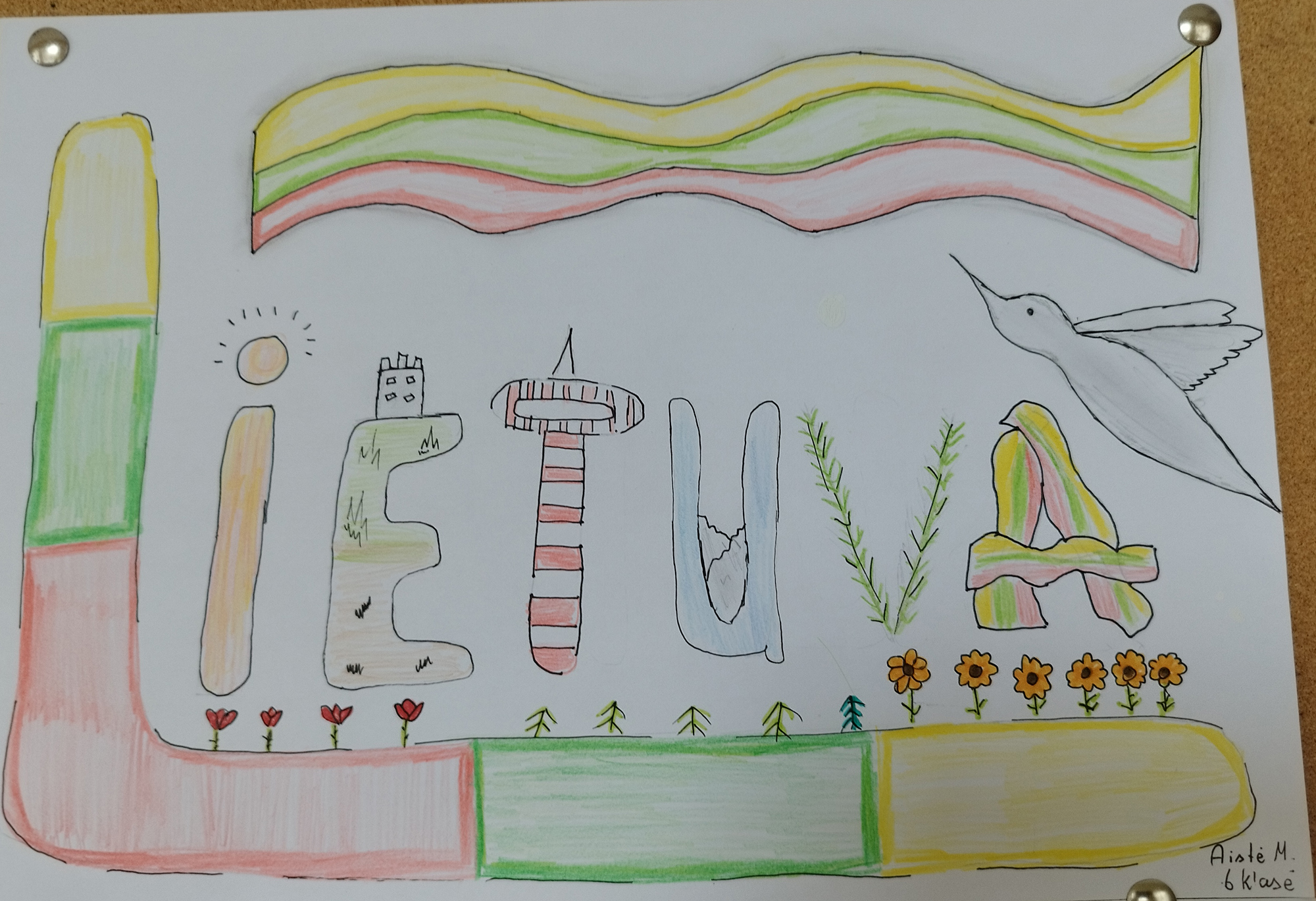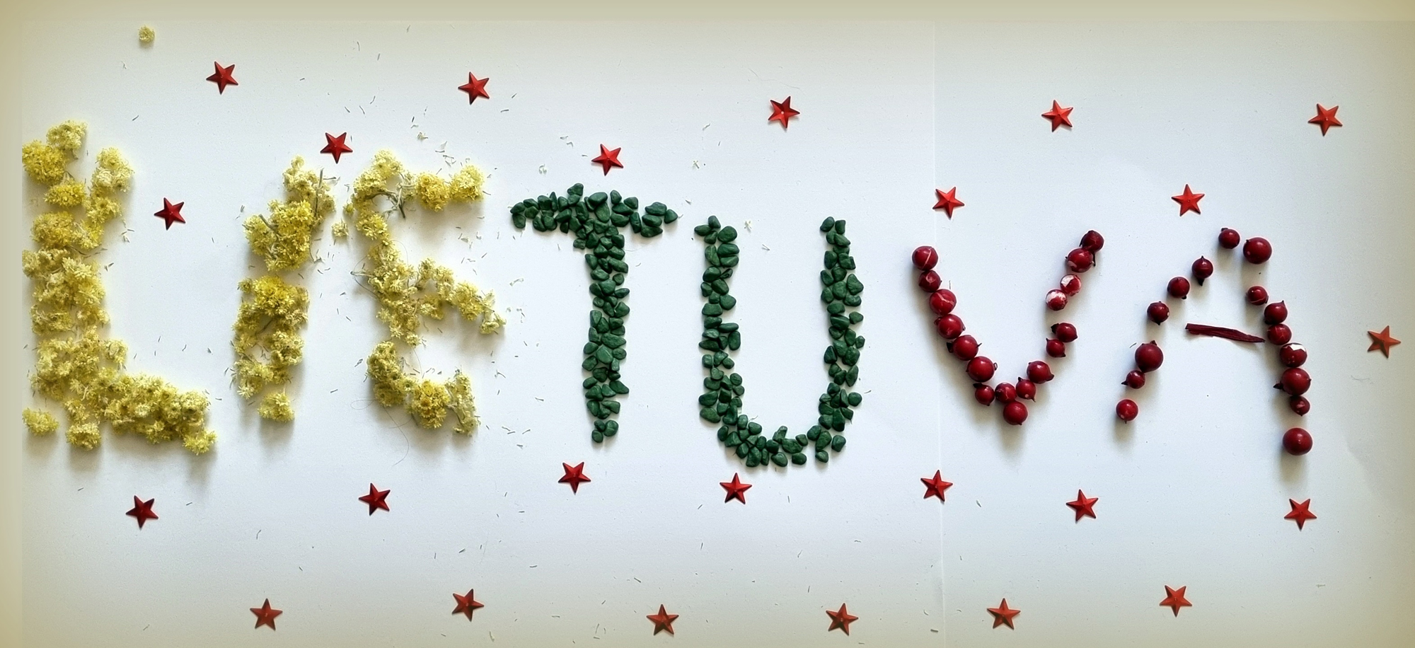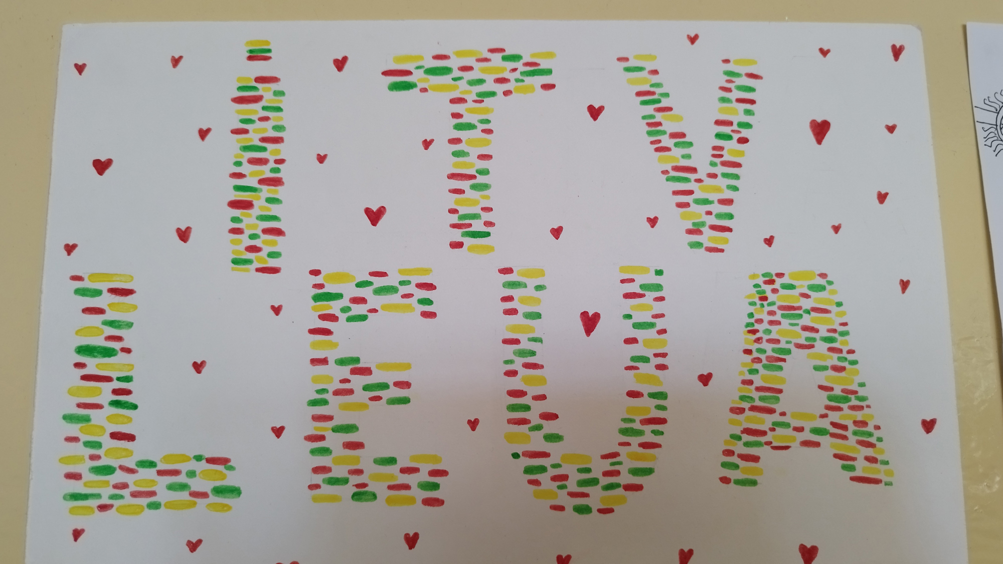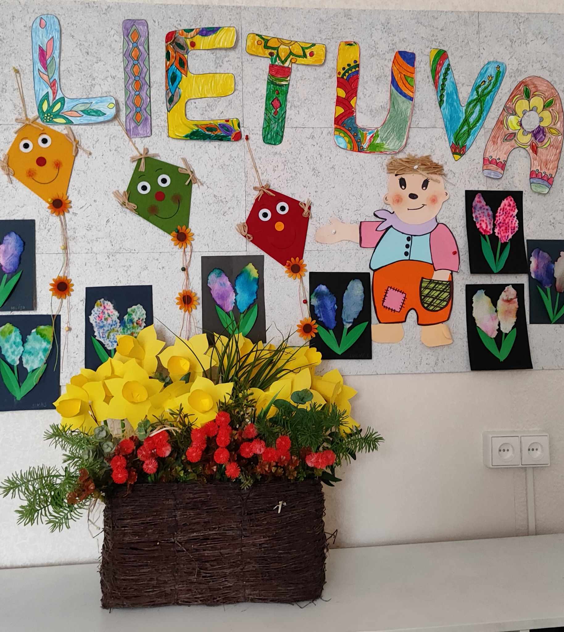 Lietuvos vardui užrašyti panaudojome džiovintų gėlių ir smilgų, žirnių, švelnių „kačiukų“, žirginėlių, bei Lietuvos auksu vadinamo gintaro. „Kiškučių'' grupės vaikai kruopščiai suklijavo Lietuvos raides. Mokytoja Dainora Valančauskienė