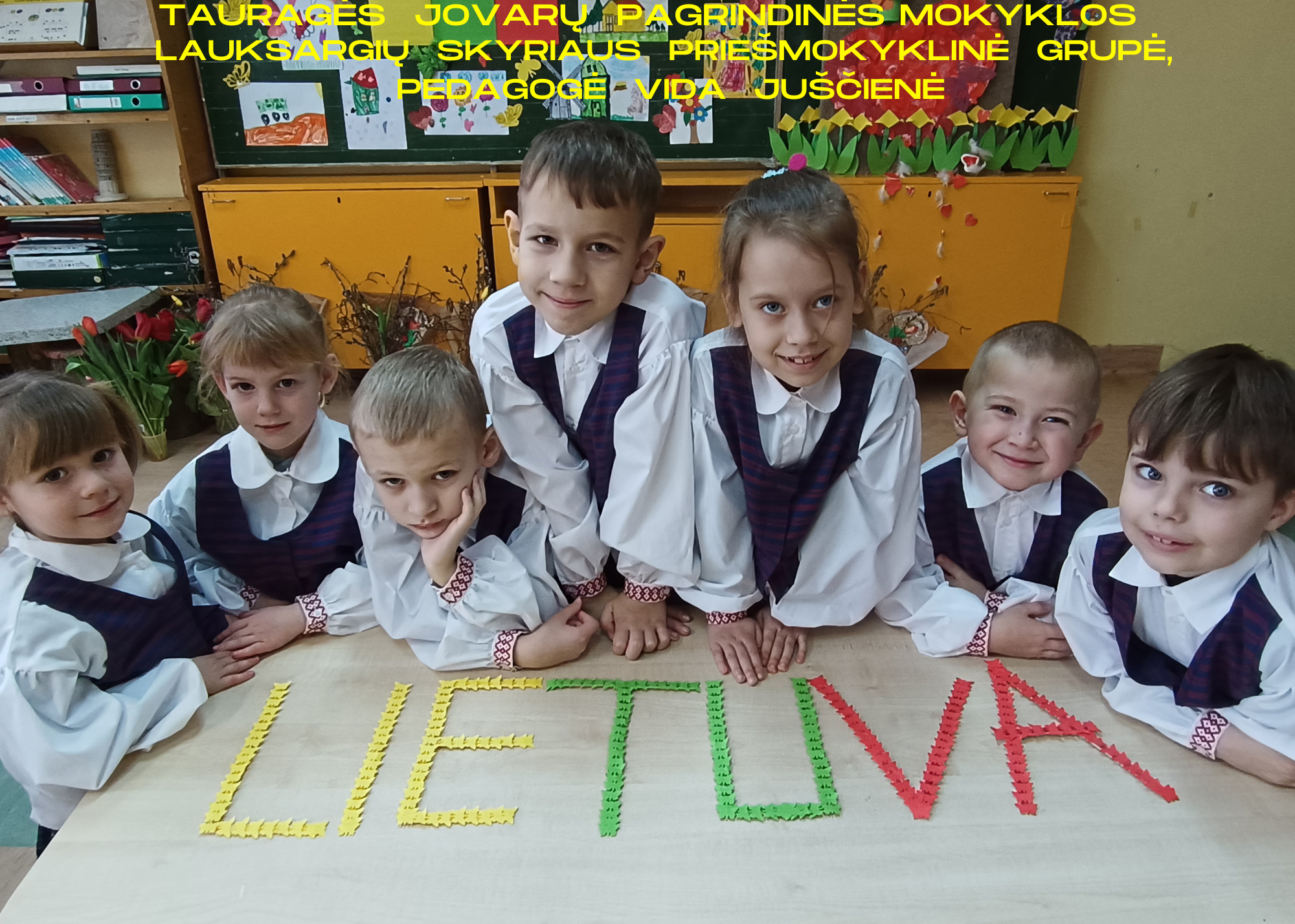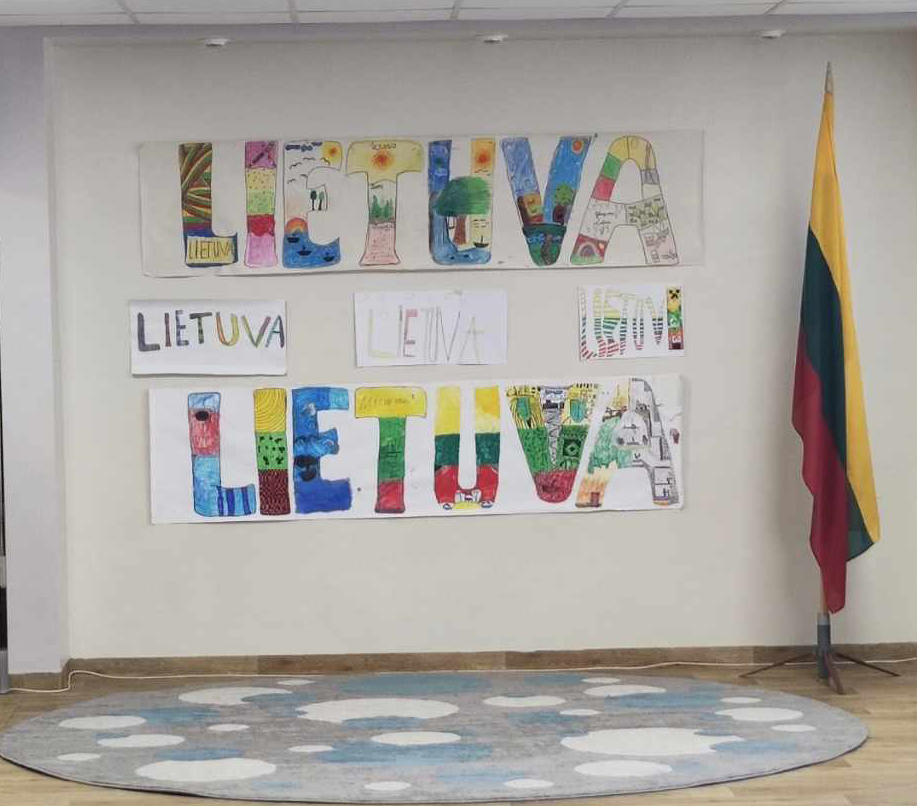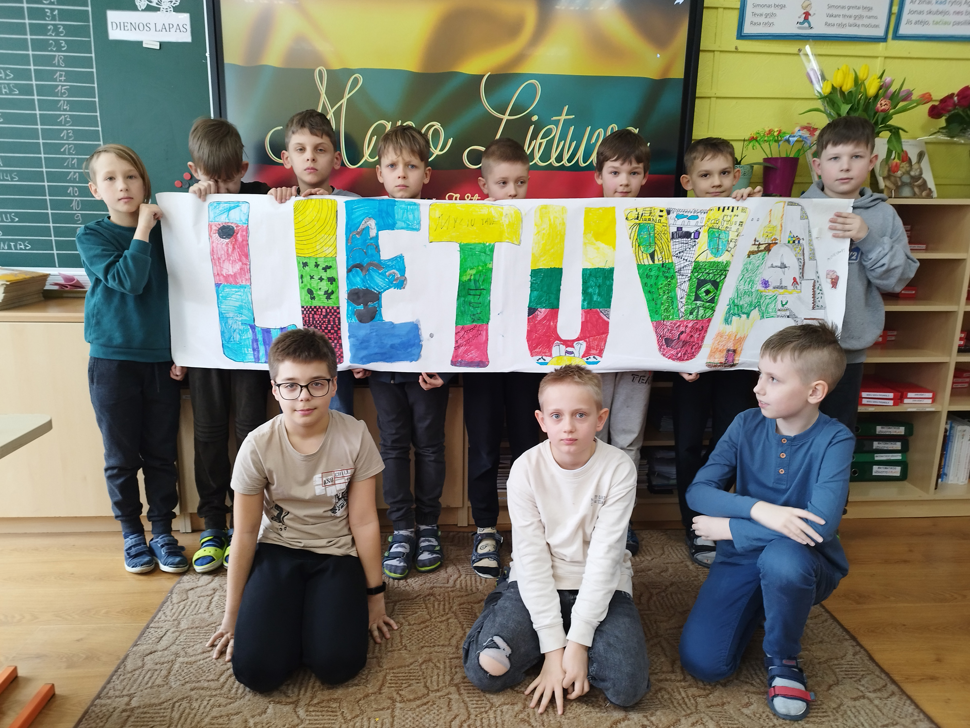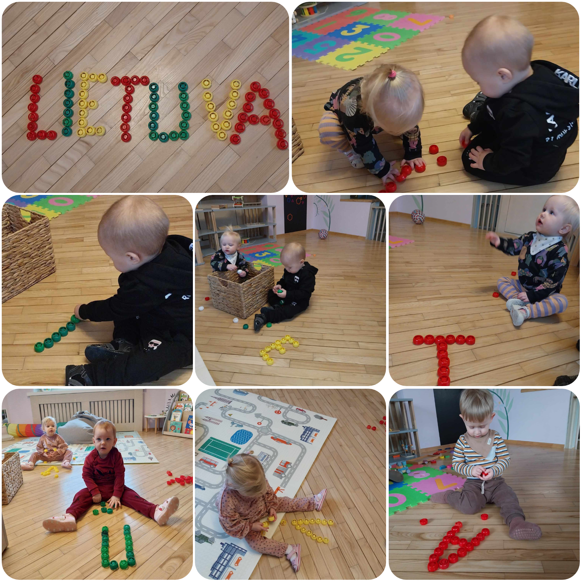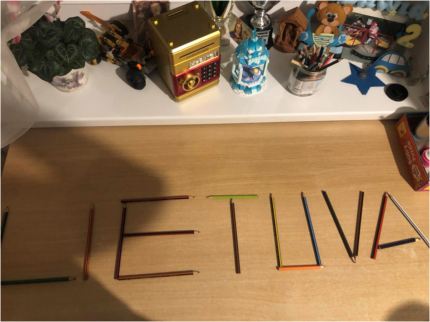 Lietuvos vardui užrašyti panaudojome džiovintų gėlių ir smilgų, žirnių, švelnių „kačiukų“, žirginėlių, bei Lietuvos auksu vadinamo gintaro. „Kiškučių'' grupės vaikai kruopščiai suklijavo Lietuvos raides. Mokytoja Dainora Valančauskienė