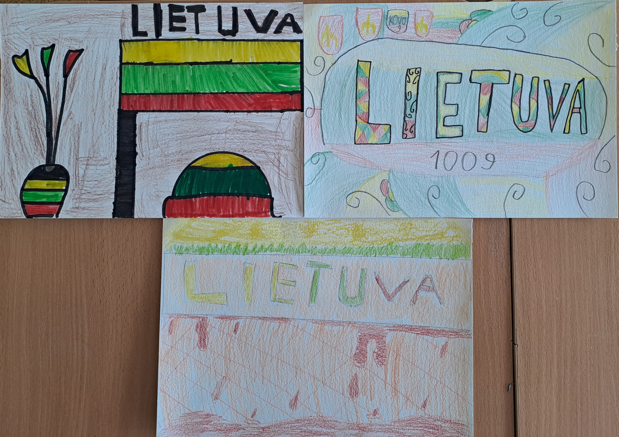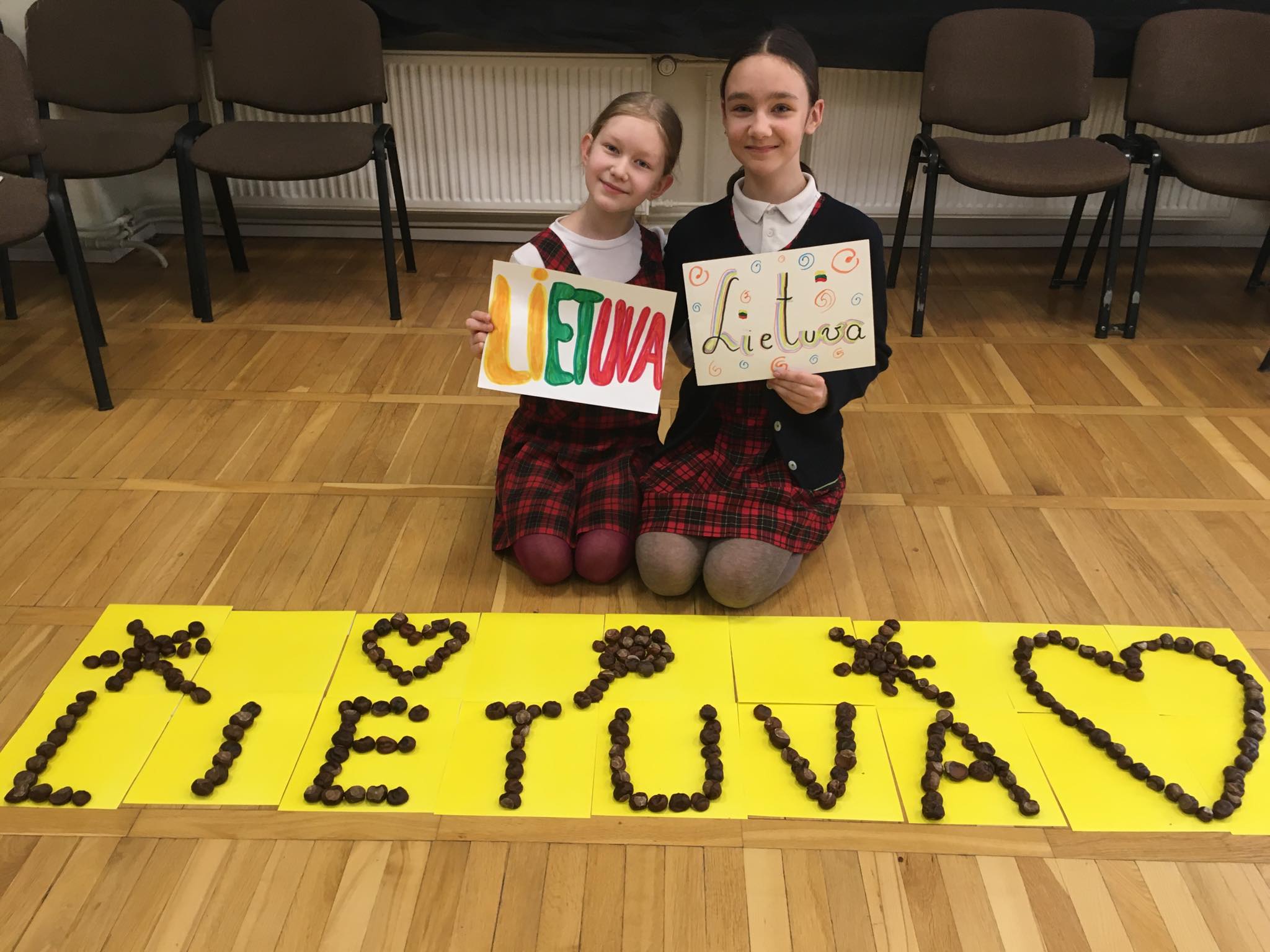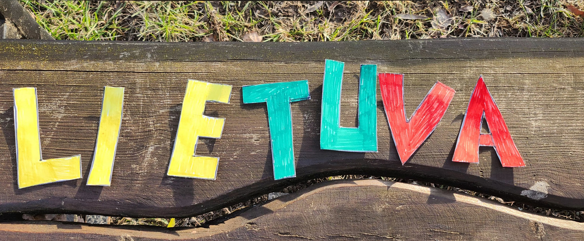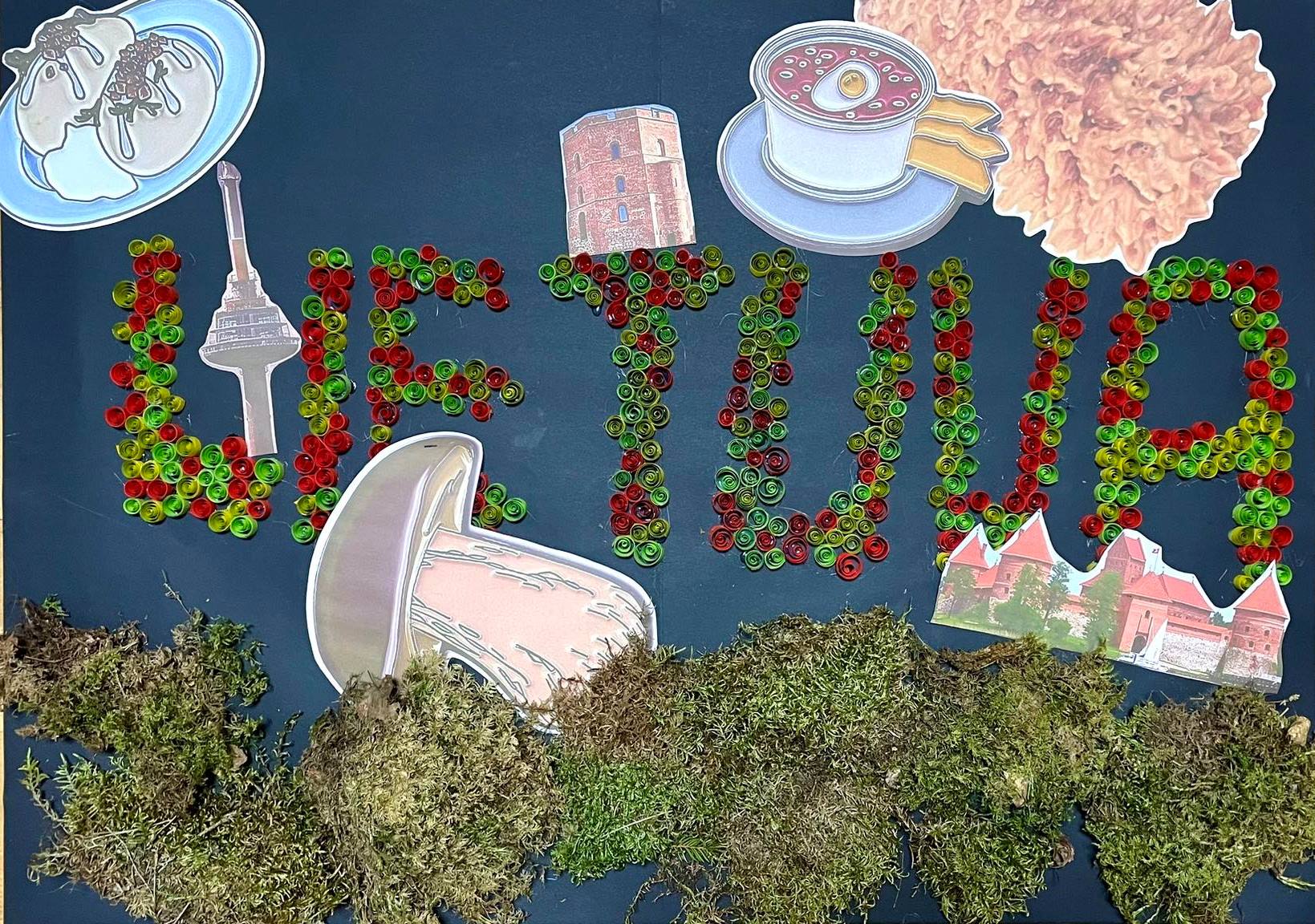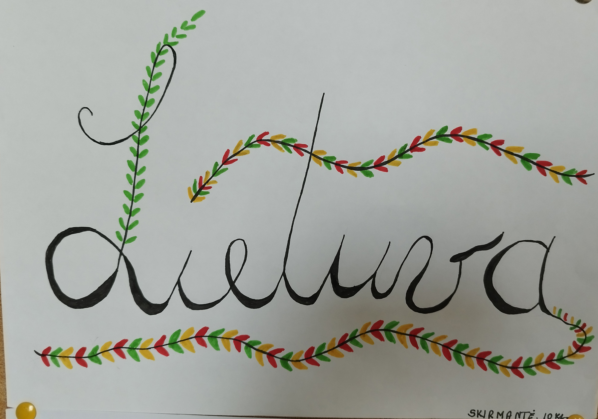 Lietuvos vardui užrašyti panaudojome džiovintų gėlių ir smilgų, žirnių, švelnių „kačiukų“, žirginėlių, bei Lietuvos auksu vadinamo gintaro. „Kiškučių'' grupės vaikai kruopščiai suklijavo Lietuvos raides. Mokytoja Dainora Valančauskienė