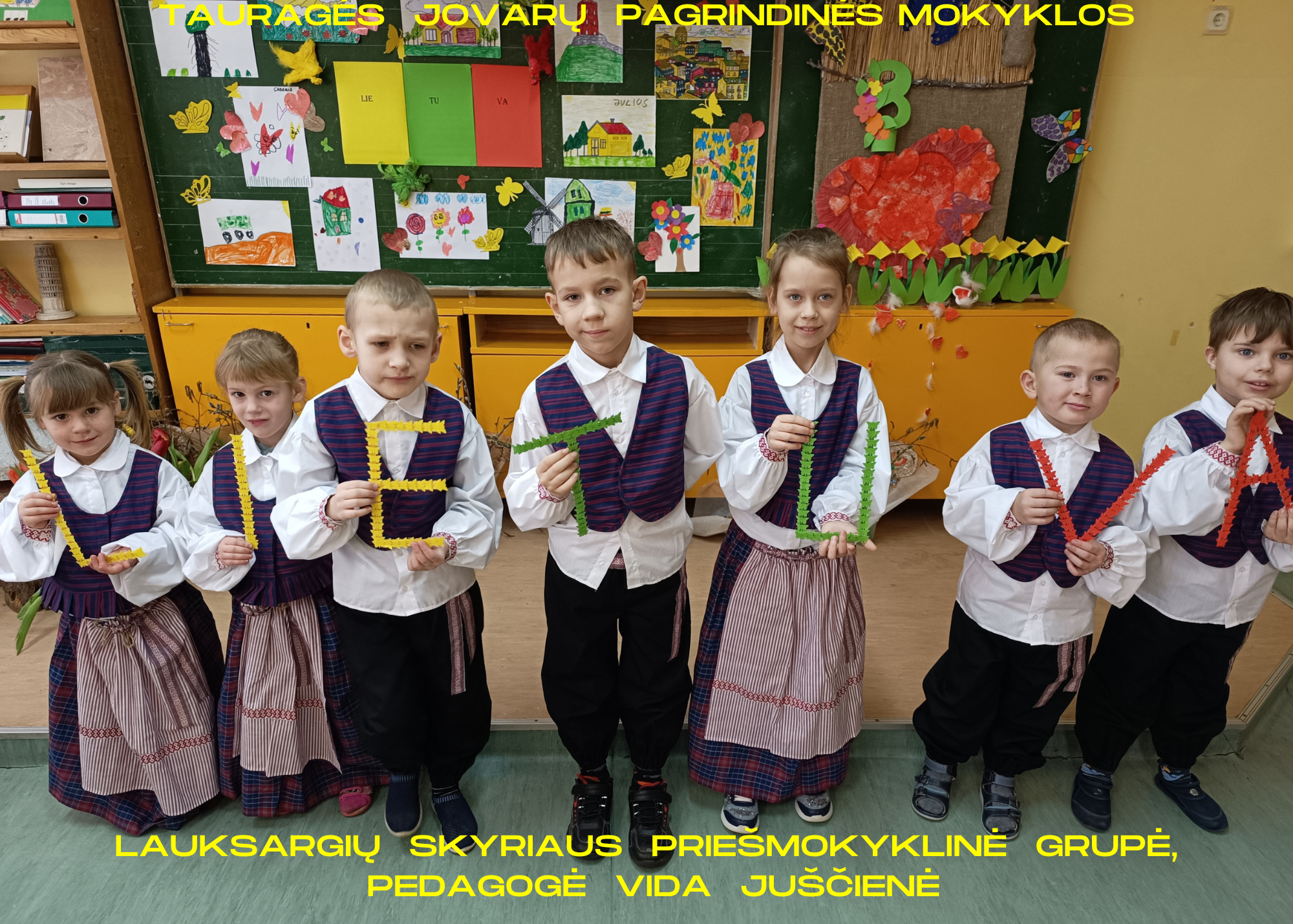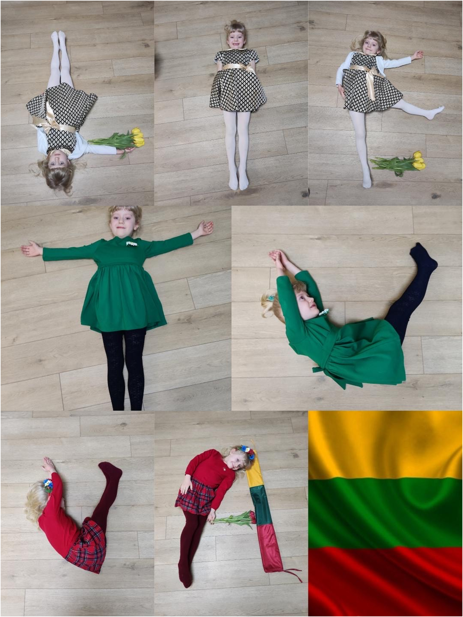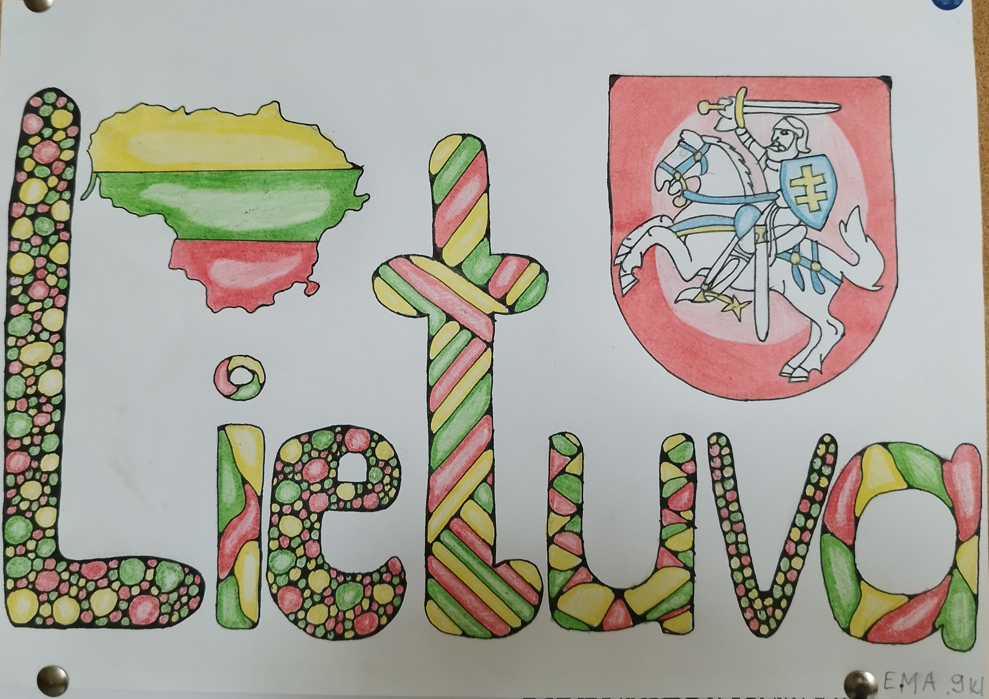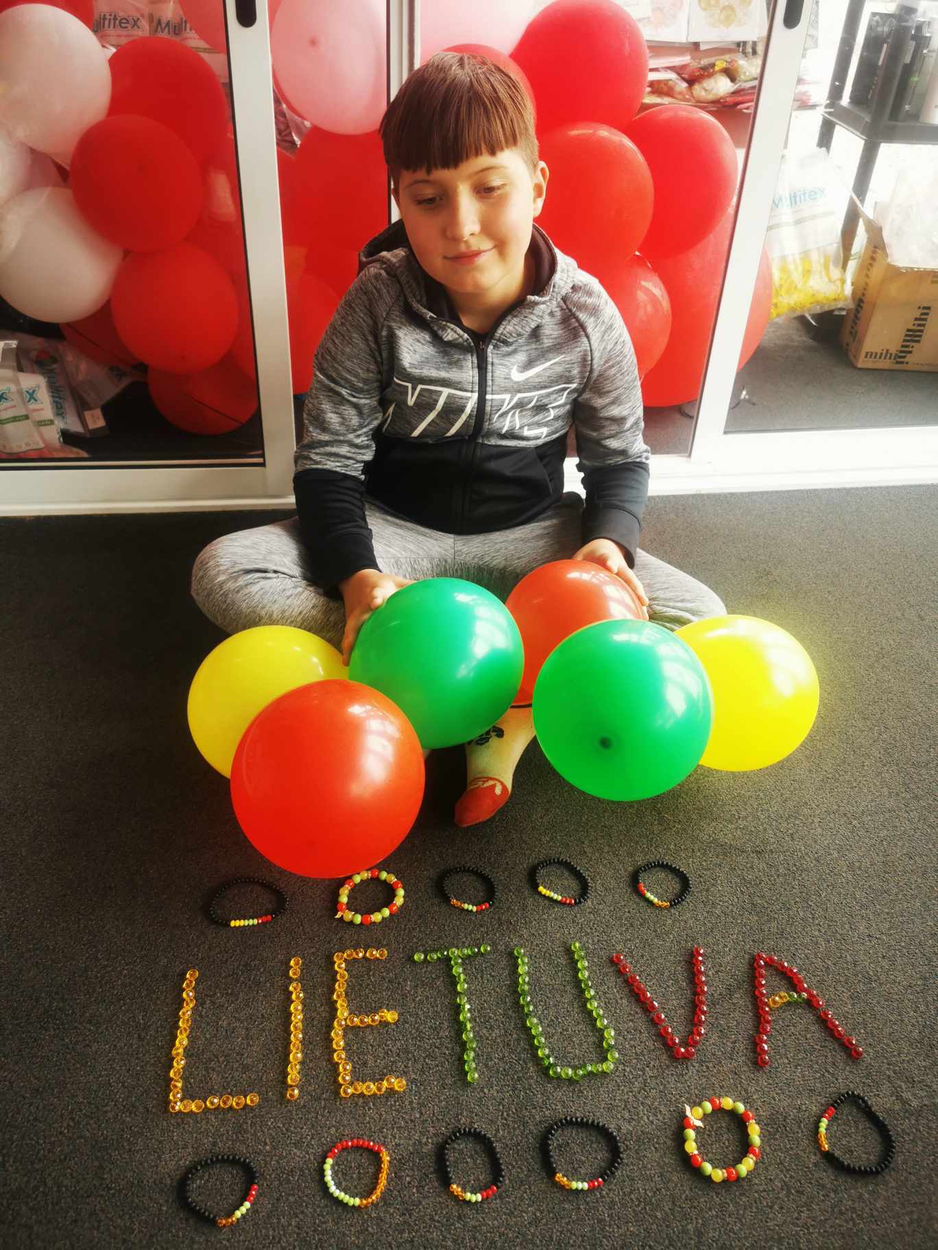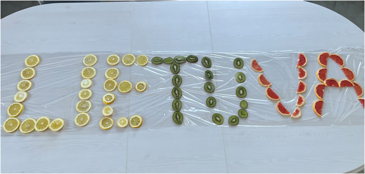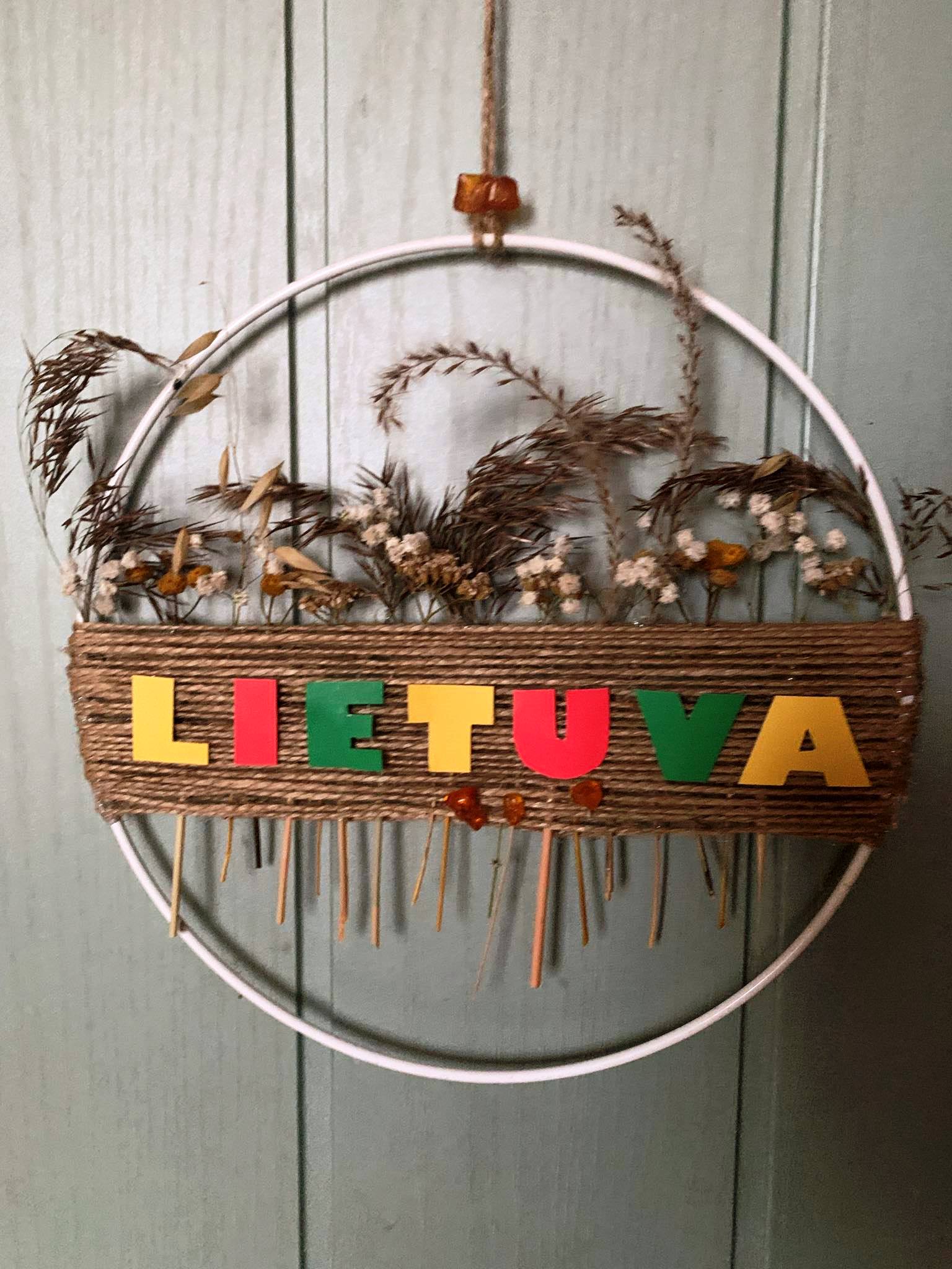 Lietuvos vardui užrašyti panaudojome džiovintų gėlių ir smilgų, žirnių, švelnių „kačiukų“, žirginėlių, bei Lietuvos auksu vadinamo gintaro. „Kiškučių'' grupės vaikai kruopščiai suklijavo Lietuvos raides. Mokytoja Dainora Valančauskienė