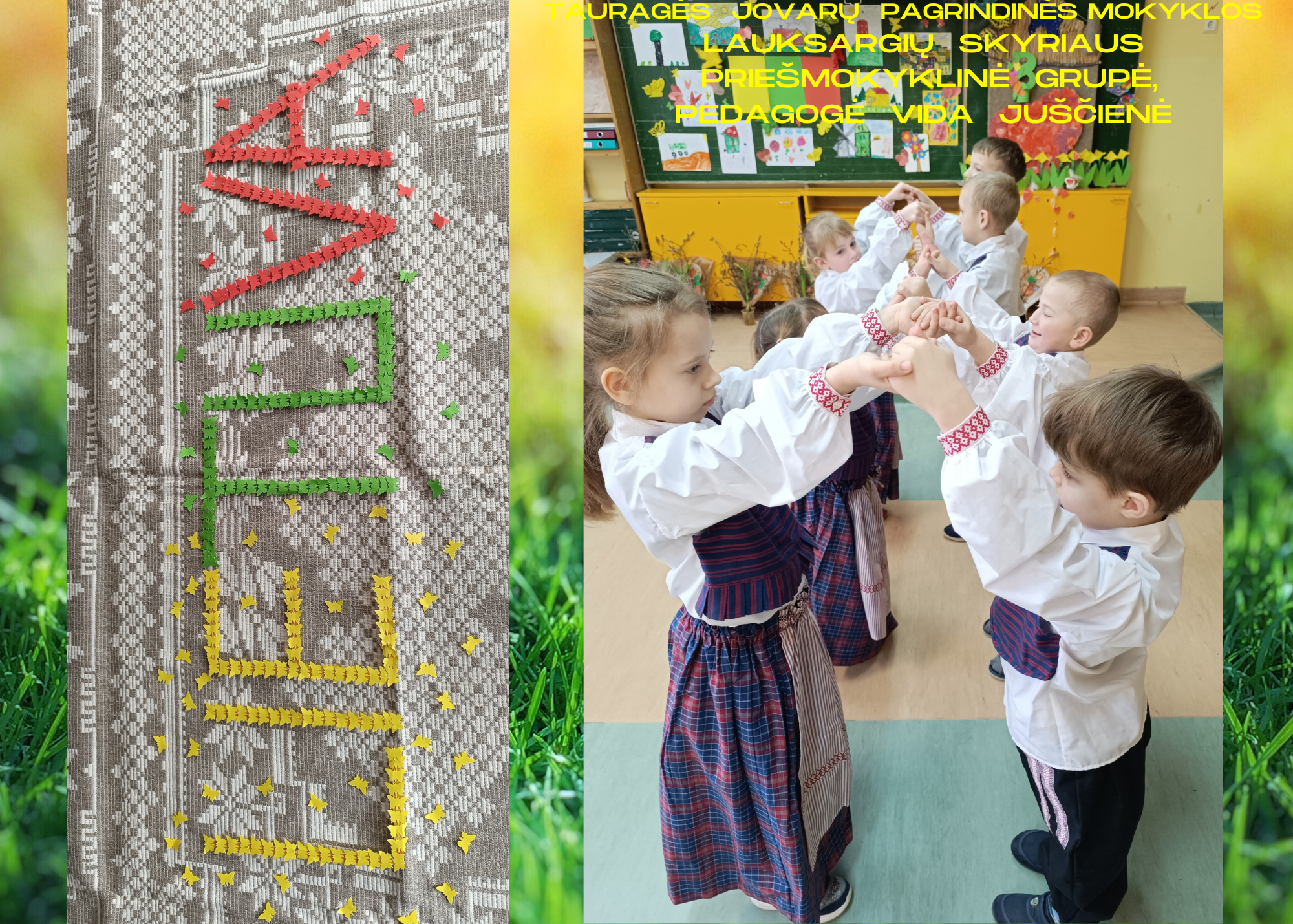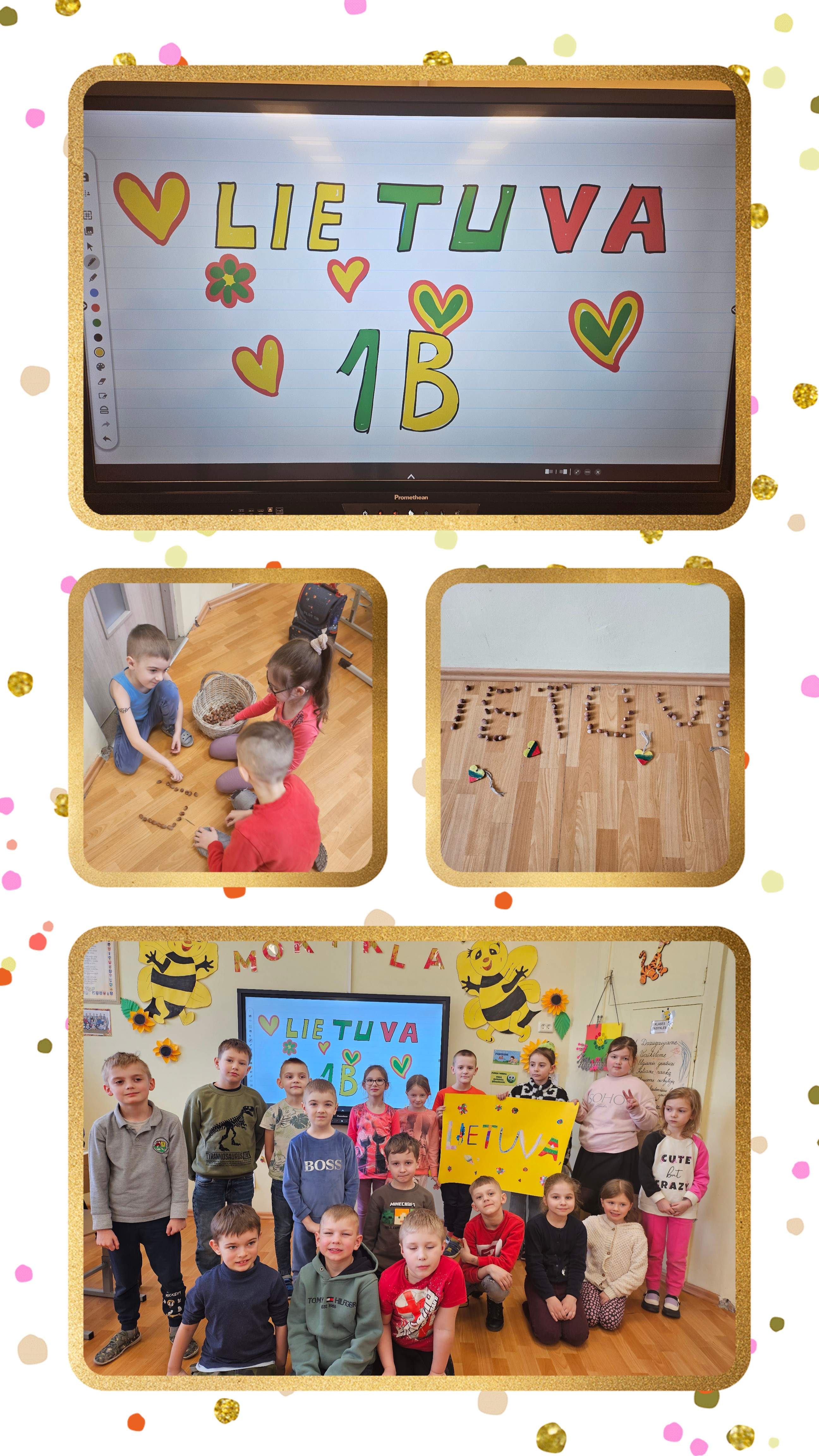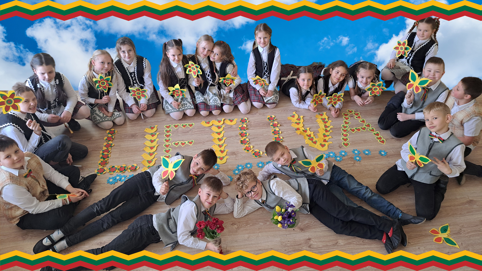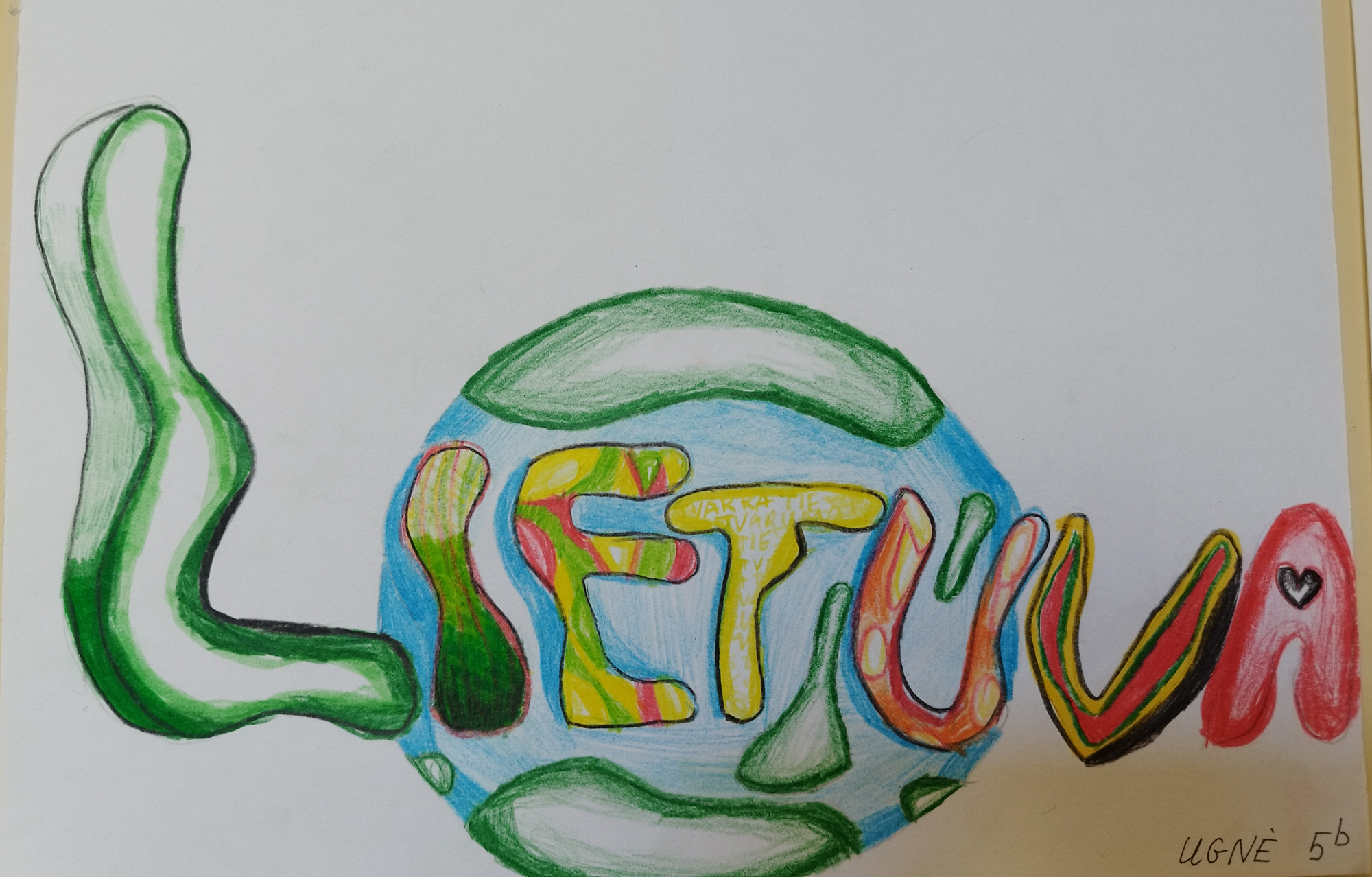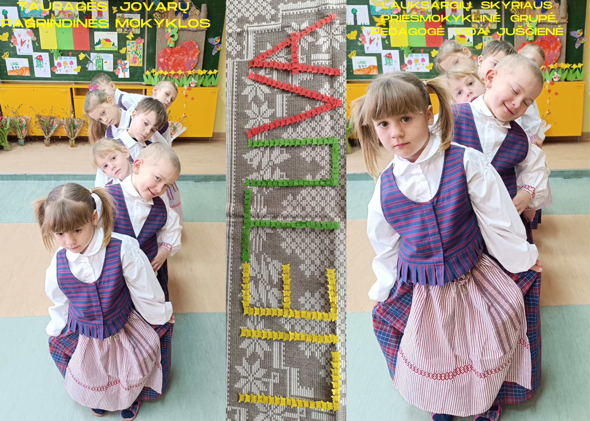 Lietuvos vardui užrašyti panaudojome džiovintų gėlių ir smilgų, žirnių, švelnių „kačiukų“, žirginėlių, bei Lietuvos auksu vadinamo gintaro. „Kiškučių'' grupės vaikai kruopščiai suklijavo Lietuvos raides. Mokytoja Dainora Valančauskienė