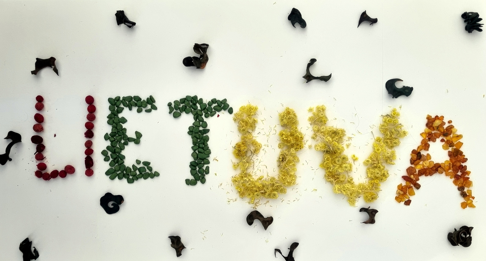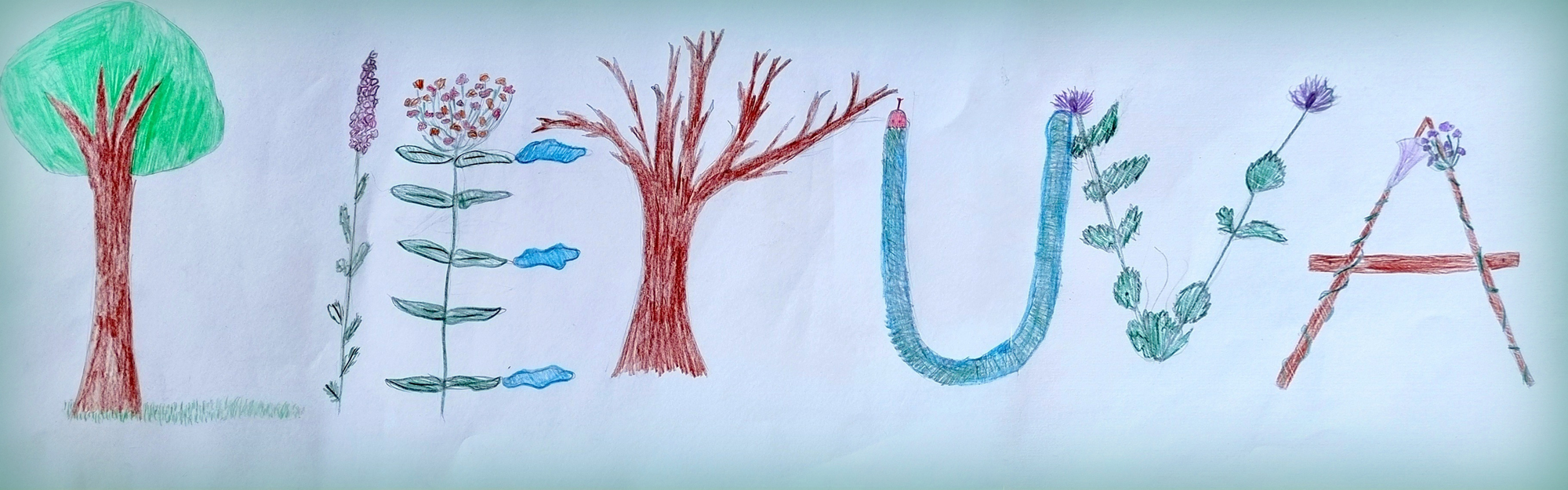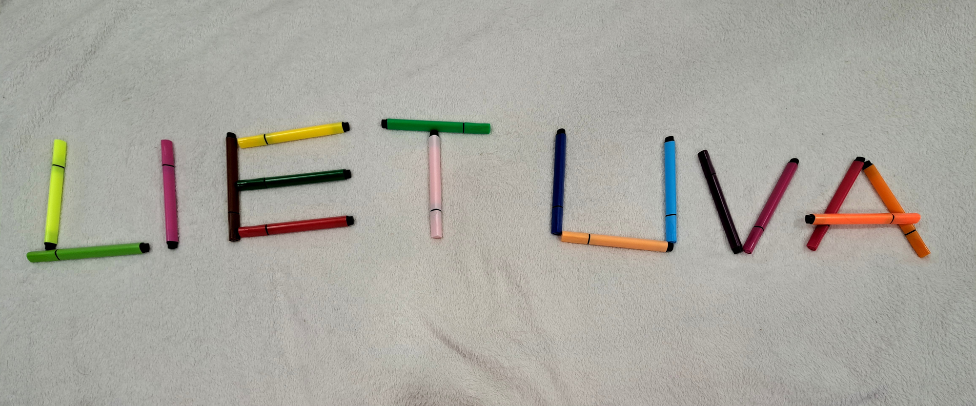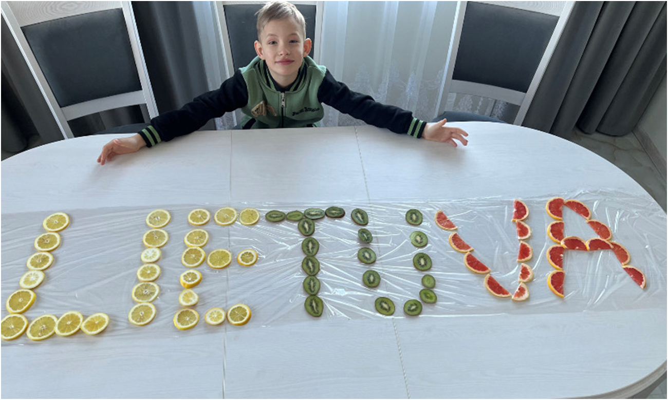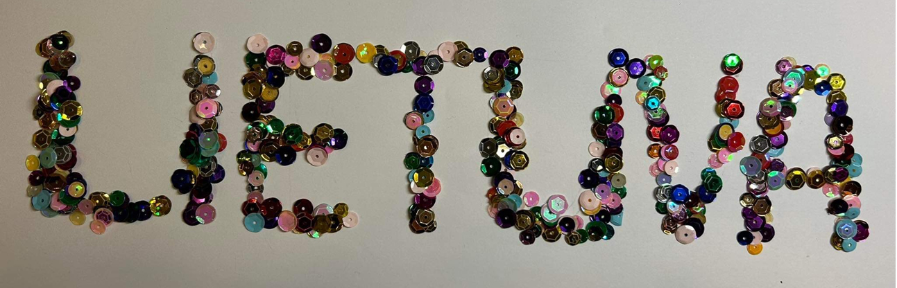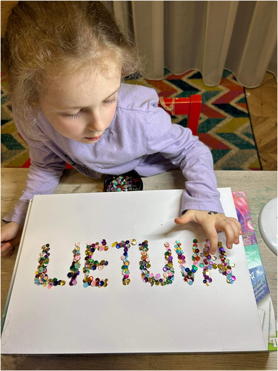 Lietuvos vardui užrašyti panaudojome džiovintų gėlių ir smilgų, žirnių, švelnių „kačiukų“, žirginėlių, bei Lietuvos auksu vadinamo gintaro. „Kiškučių'' grupės vaikai kruopščiai suklijavo Lietuvos raides. Mokytoja Dainora Valančauskienė