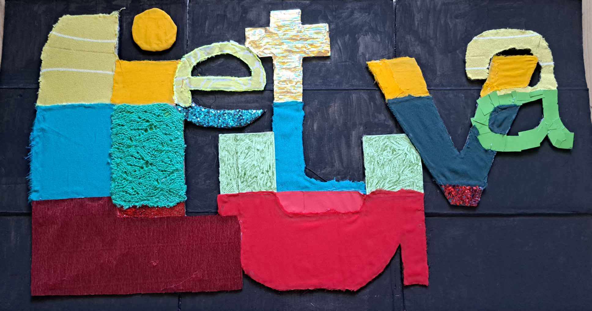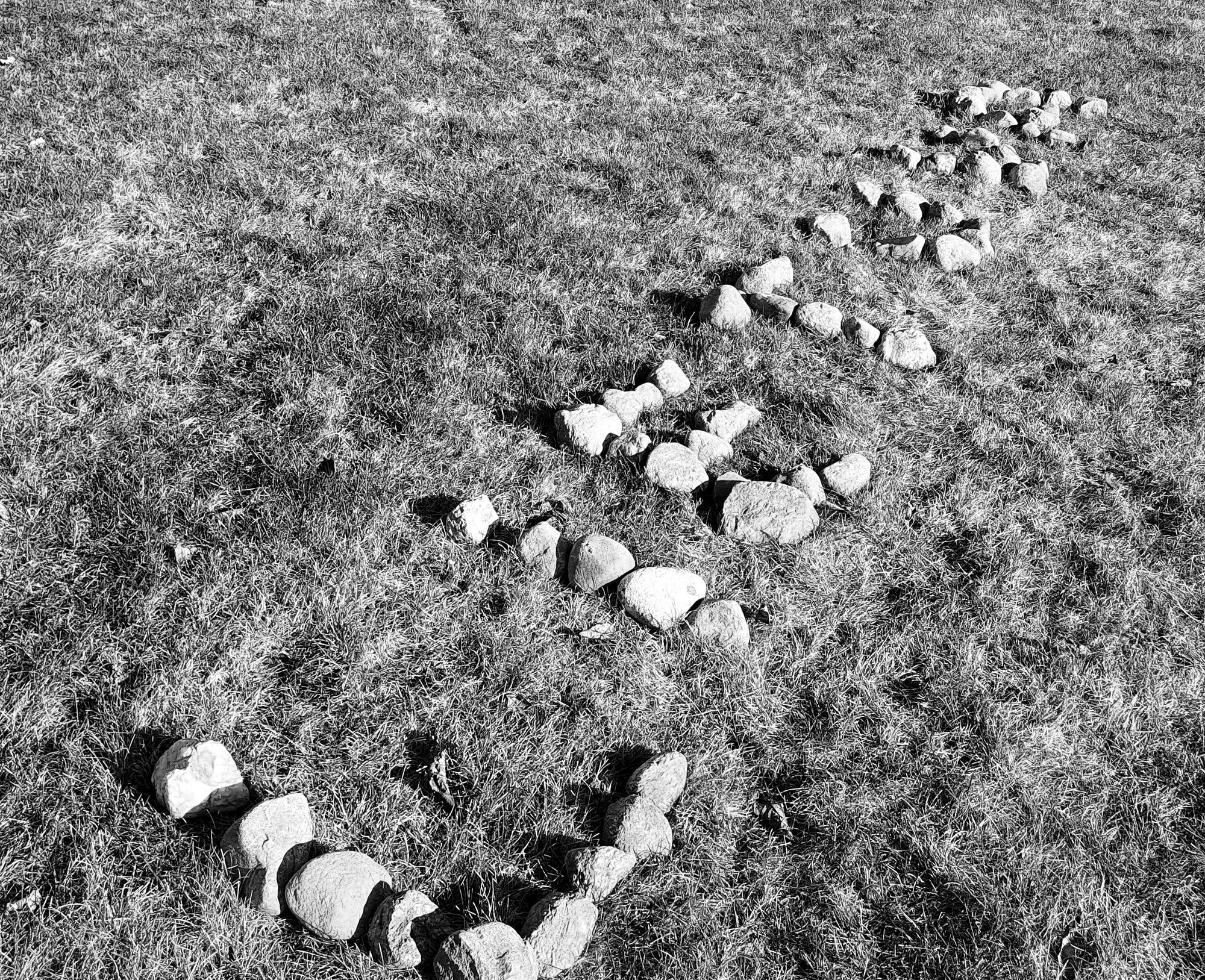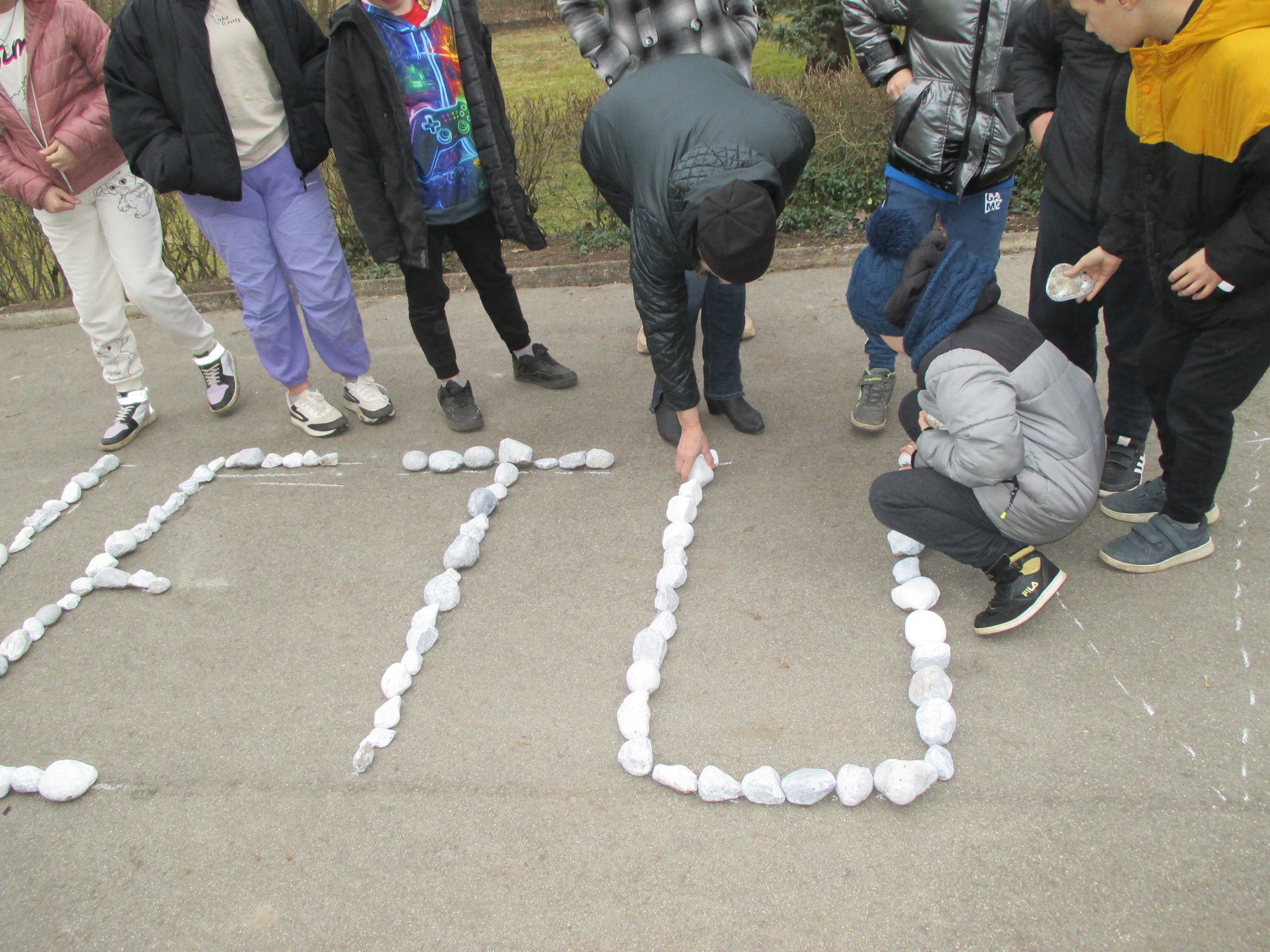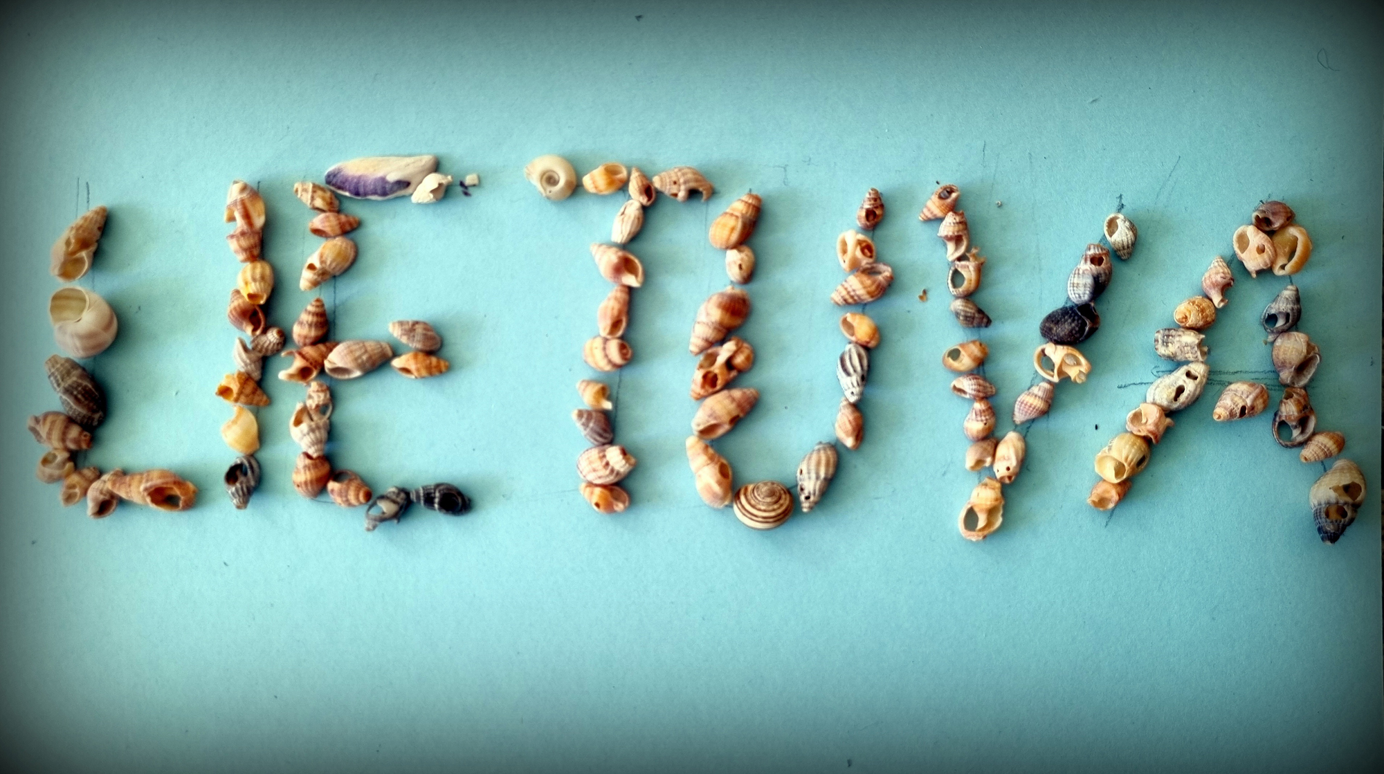 Lietuvos vardas iš baltai vaikų nudažytų akmenukų.