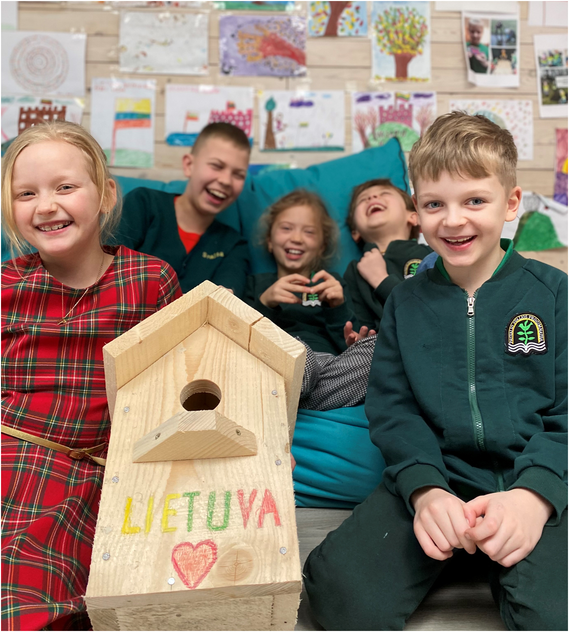 Vaikai Lietuvos vardą užrašė ant inkilėlio. Mintis tokia, kad visi išvykusieji grįžtų į Lietuvą, taip kaip grįžta paukščiai pavasarį.